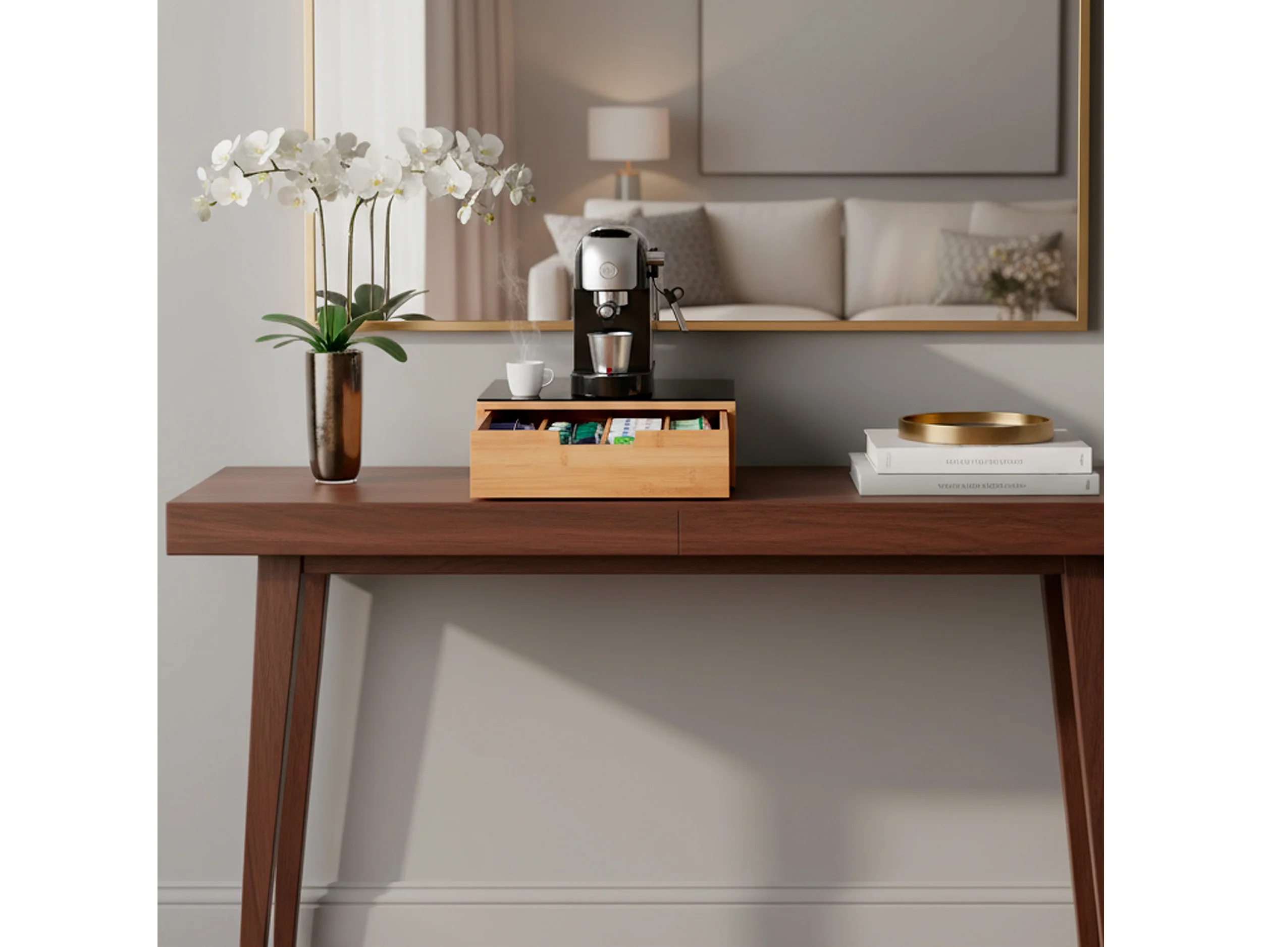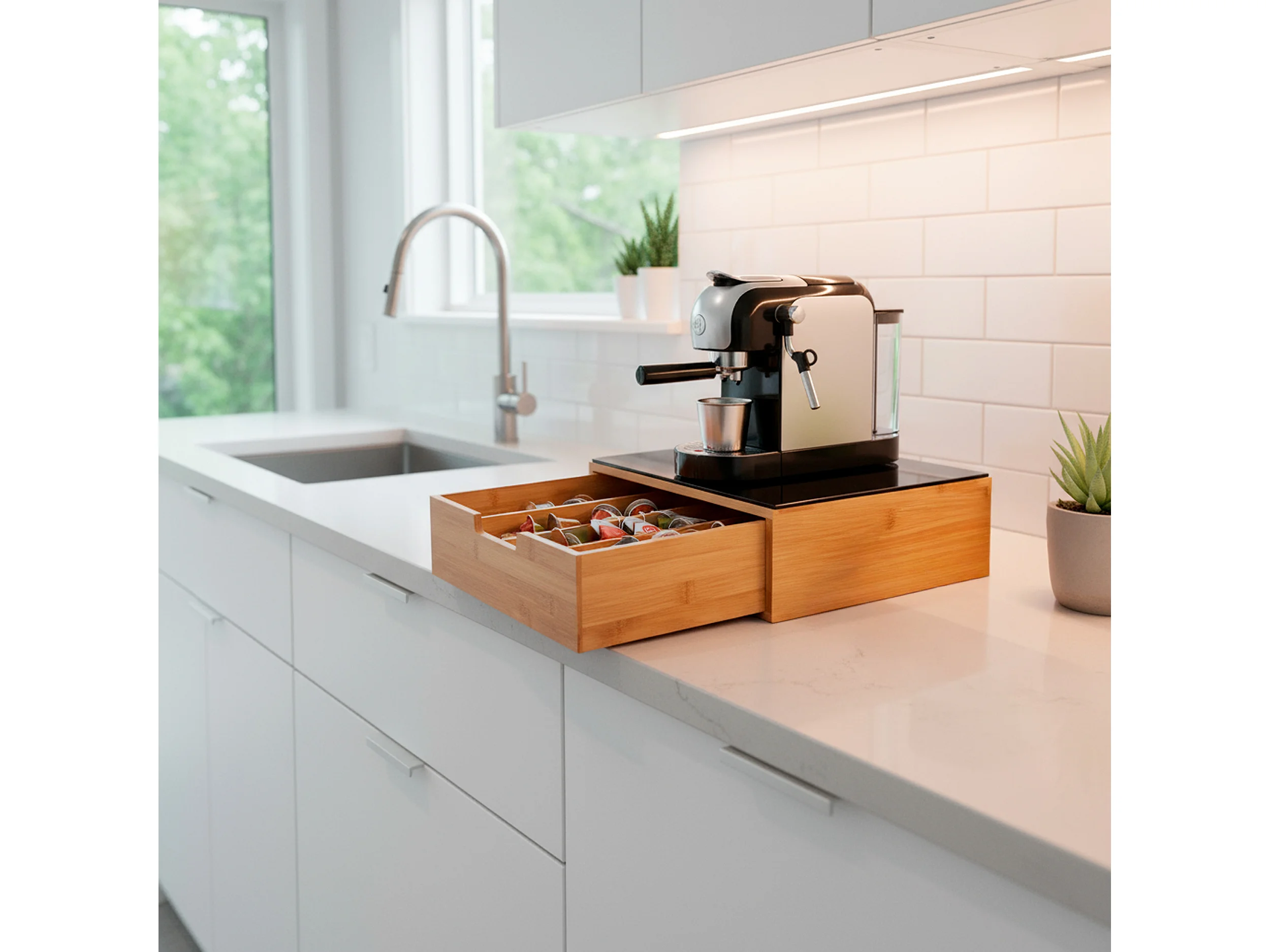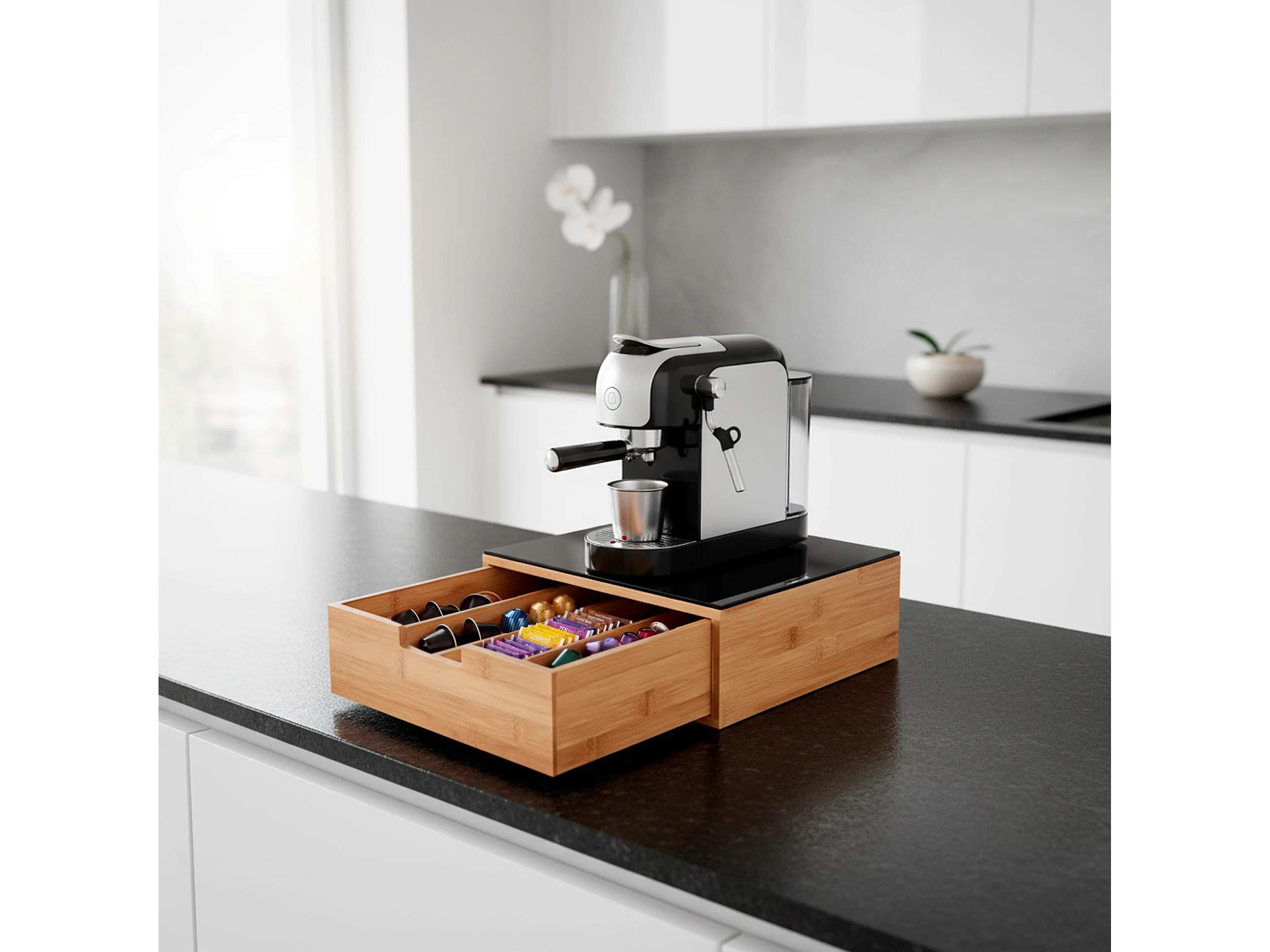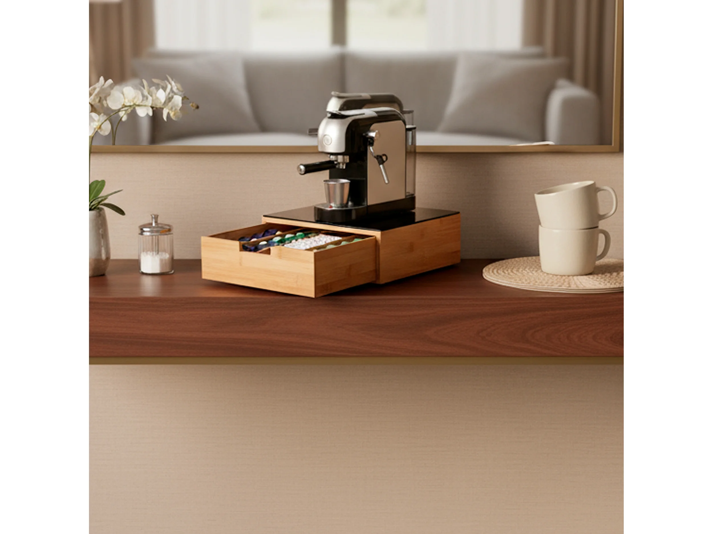 Porta Cialde In Bambù Con Cassetto 4 Scomparti R Ripiano in Vetro Organizer Capsule Caffè Cialde Bustine Tè Tisane Zucchero Design 30 x 30 x 10 Cm
