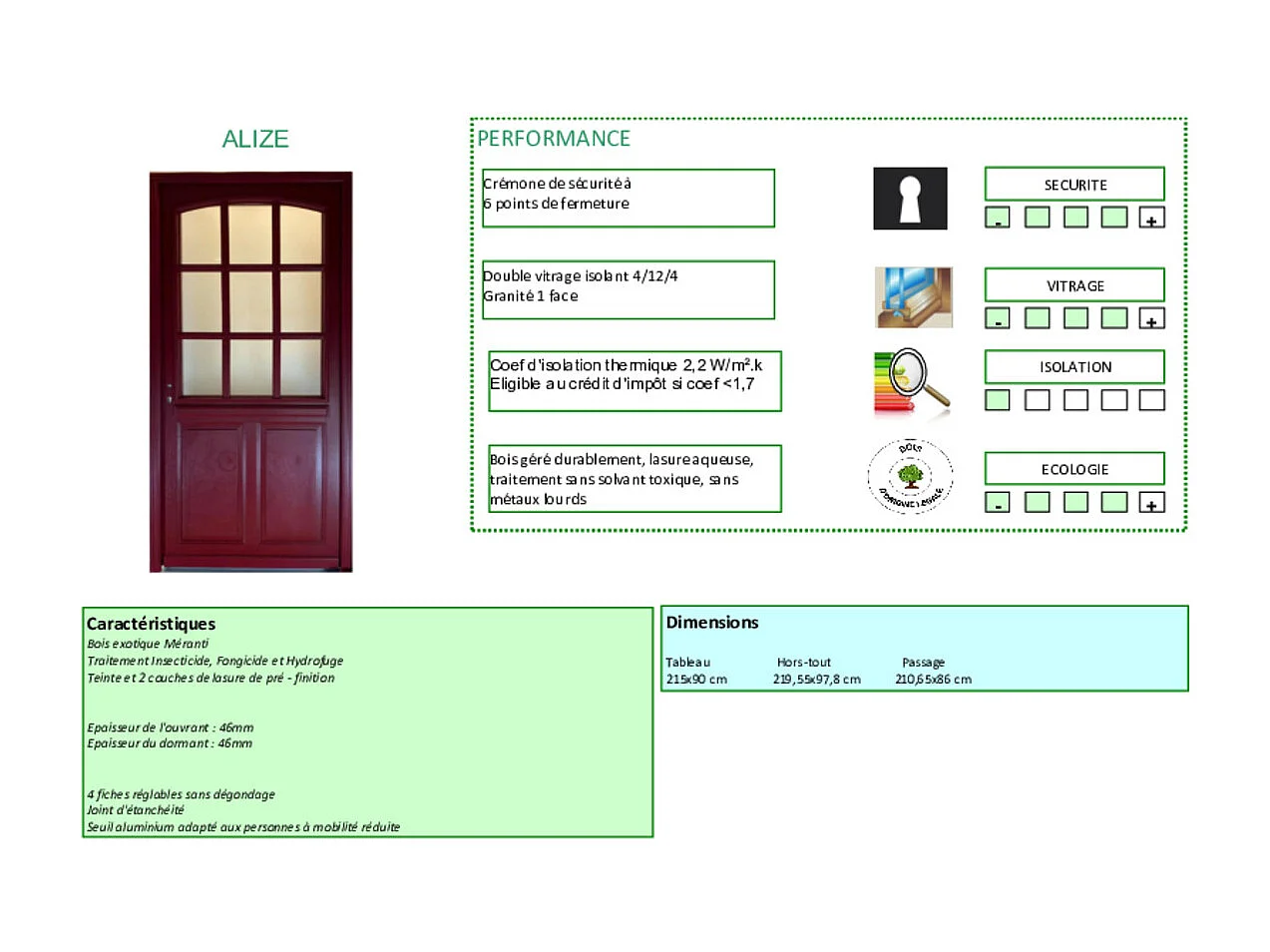 Porta d'ingresso in legno vitreo, Alize RAL 3004, H,215xl,90 p, destra + Maniglia e Fusto (010723NO) Dimensioni Tabella senza maniglia