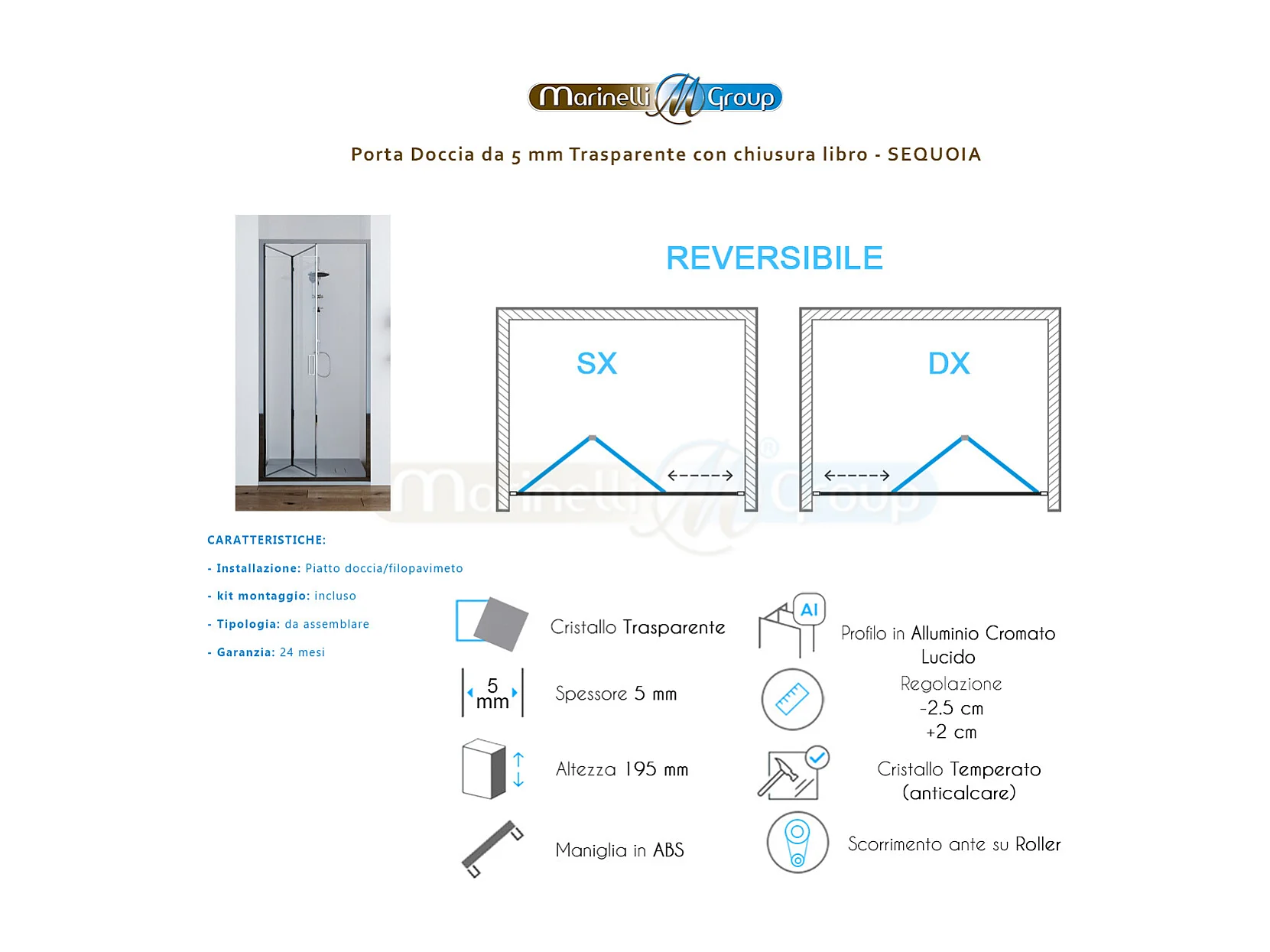 Porta doccia da 75 cm trasparente apertura a libro per nicchia Sequoia