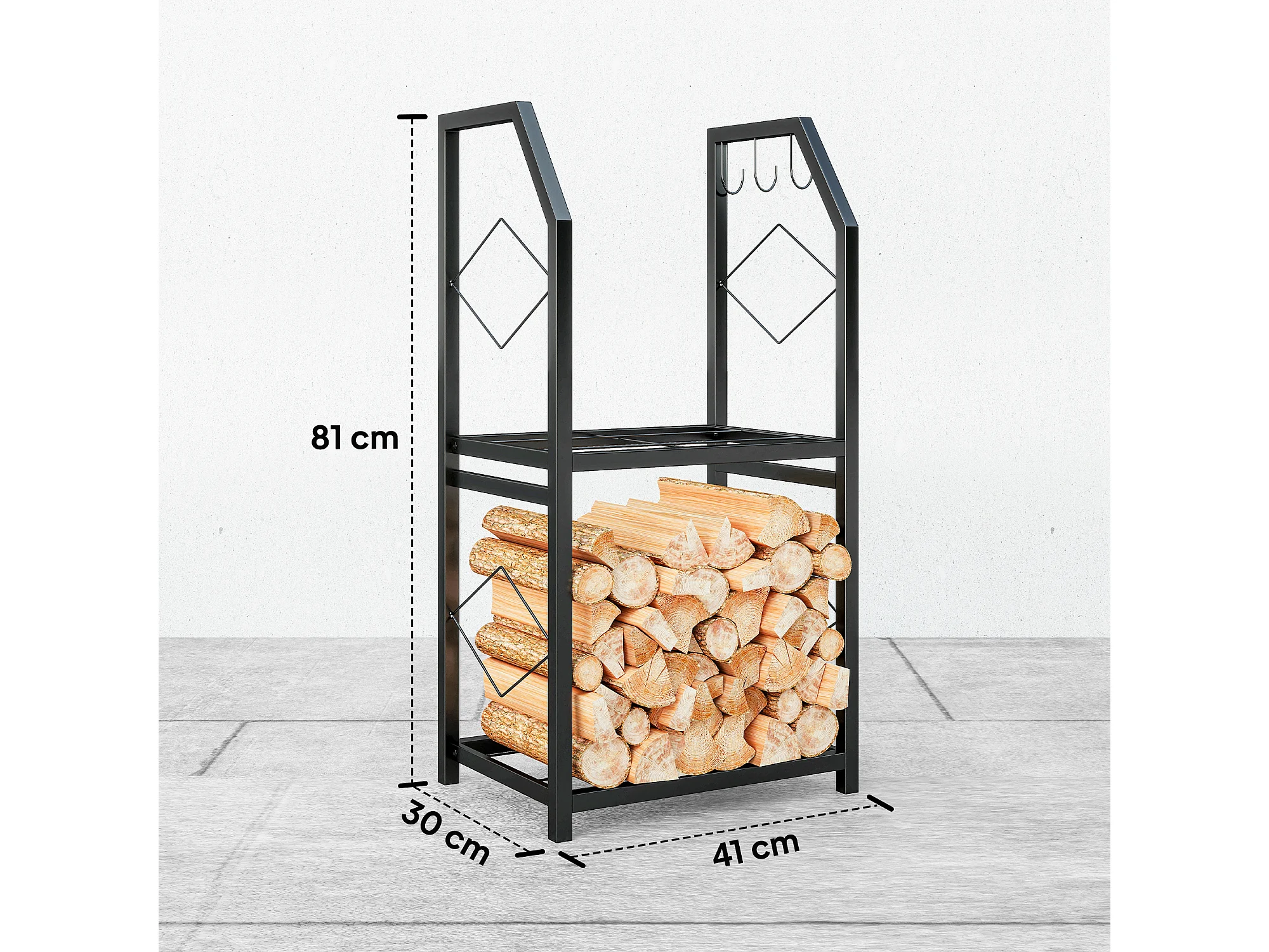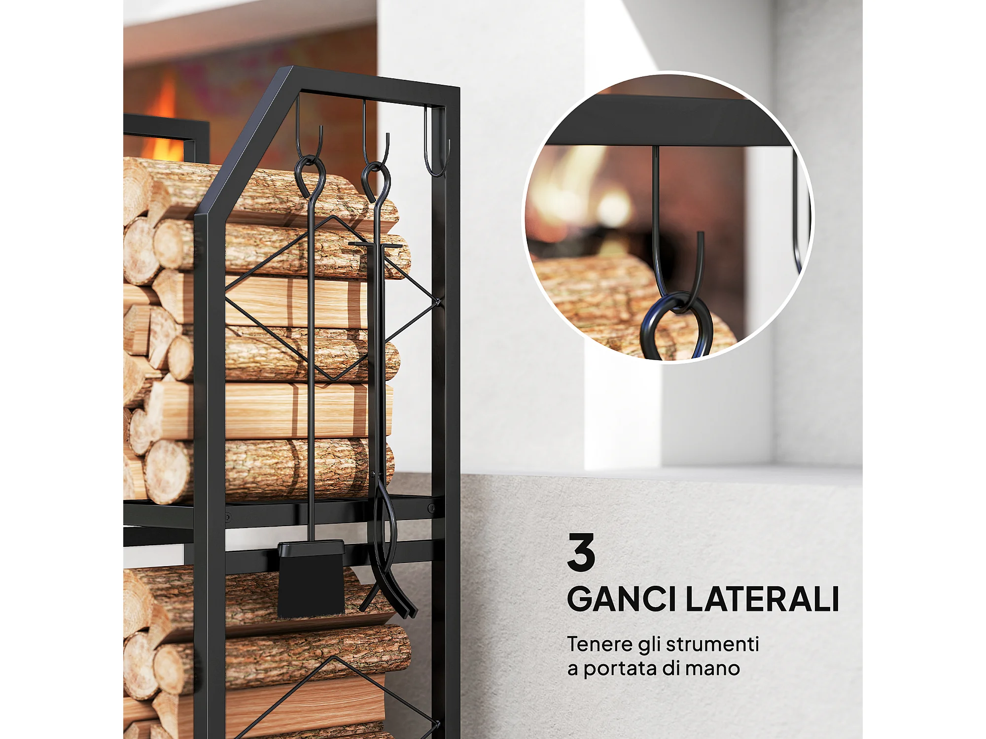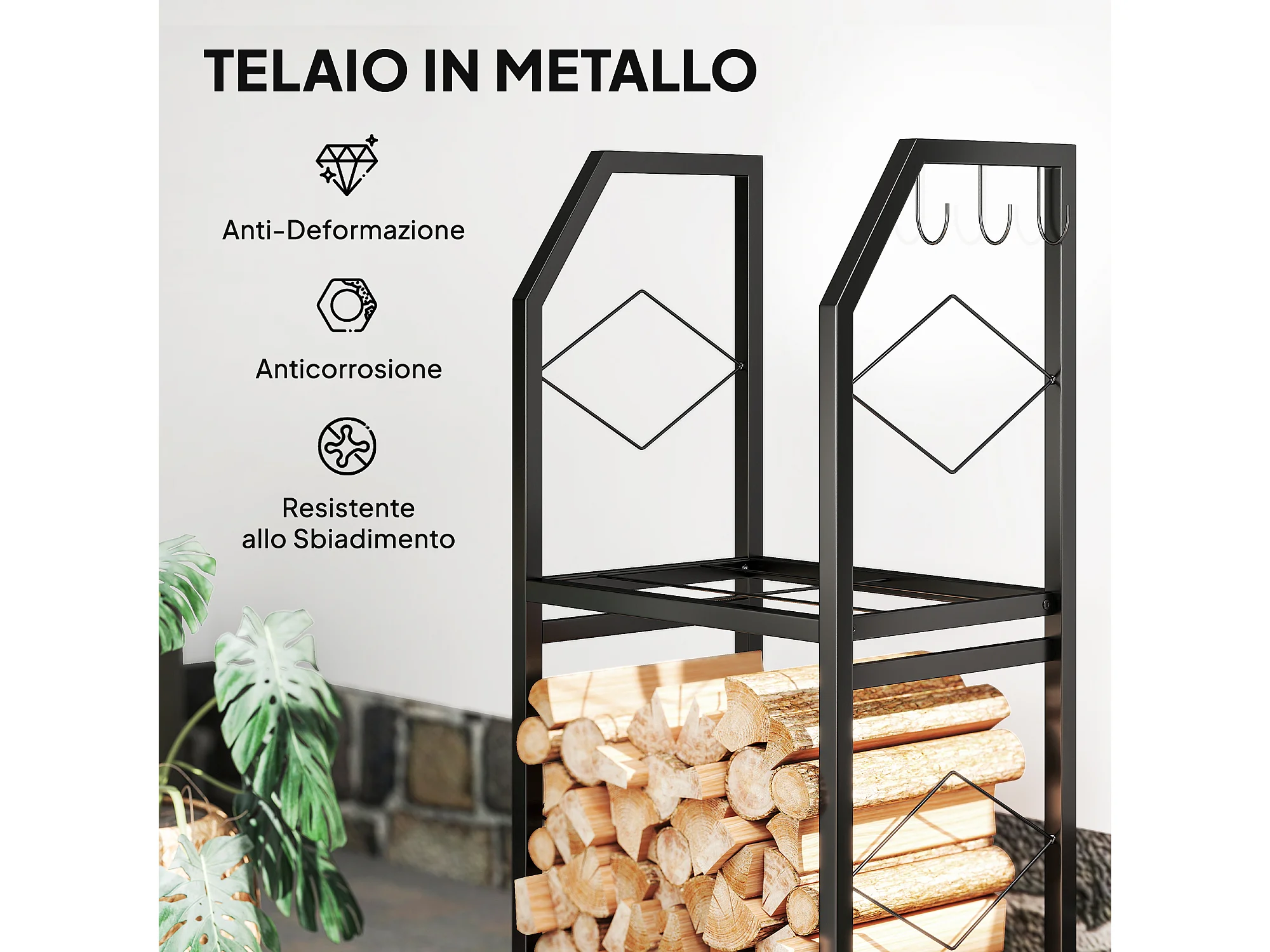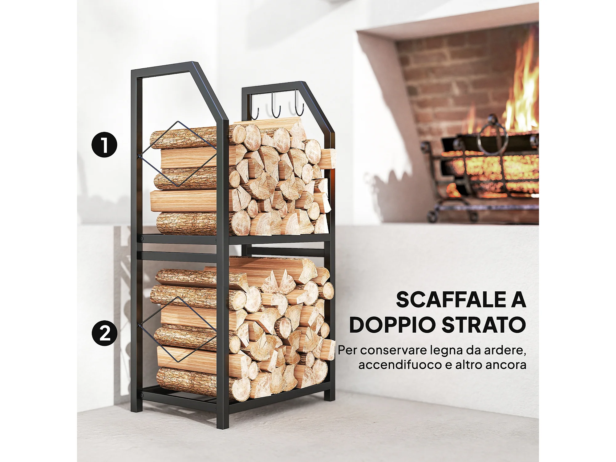 Portalegna da esterno e interno a 2 livelli e 3 ganci in acciaio nero