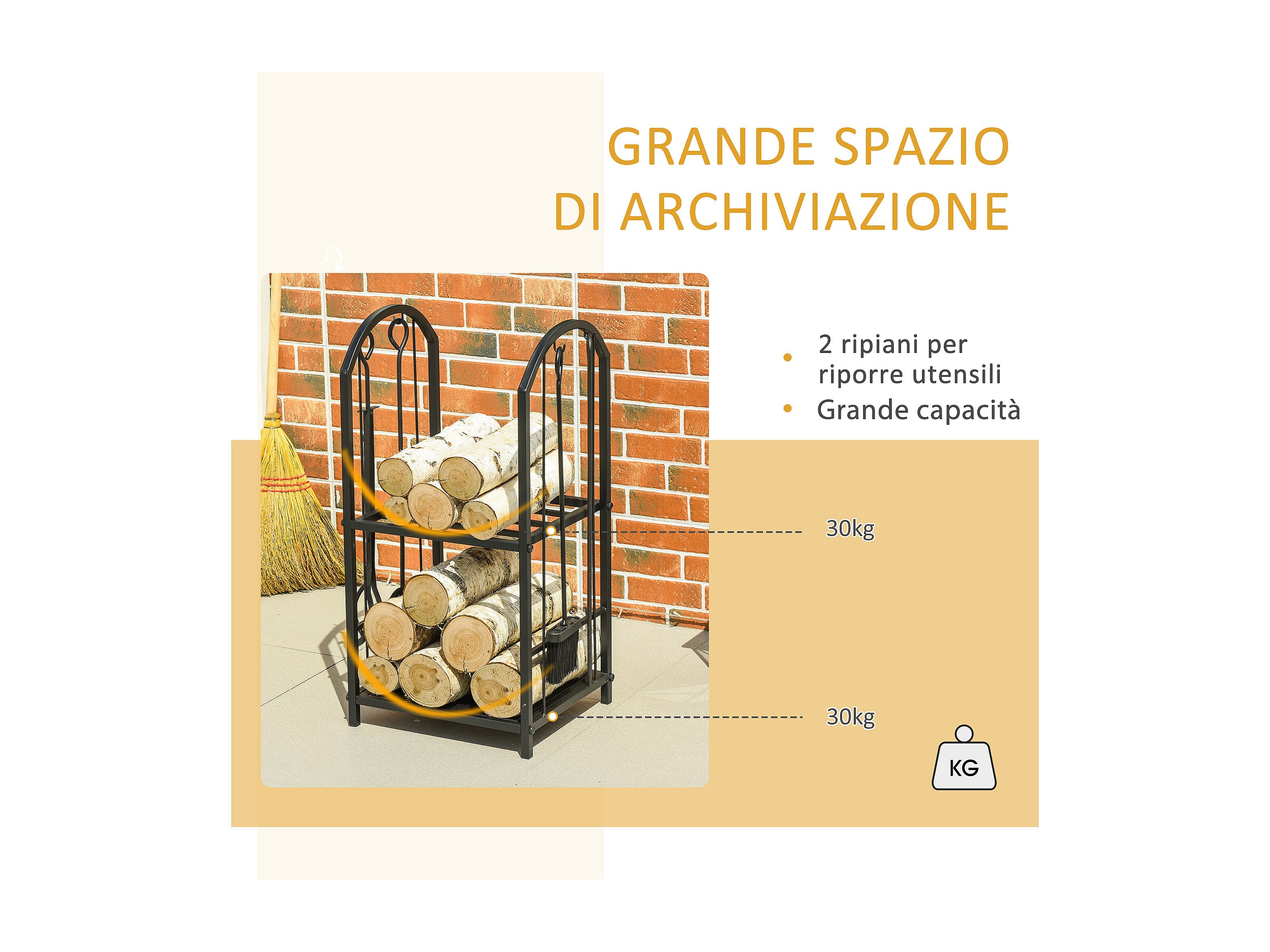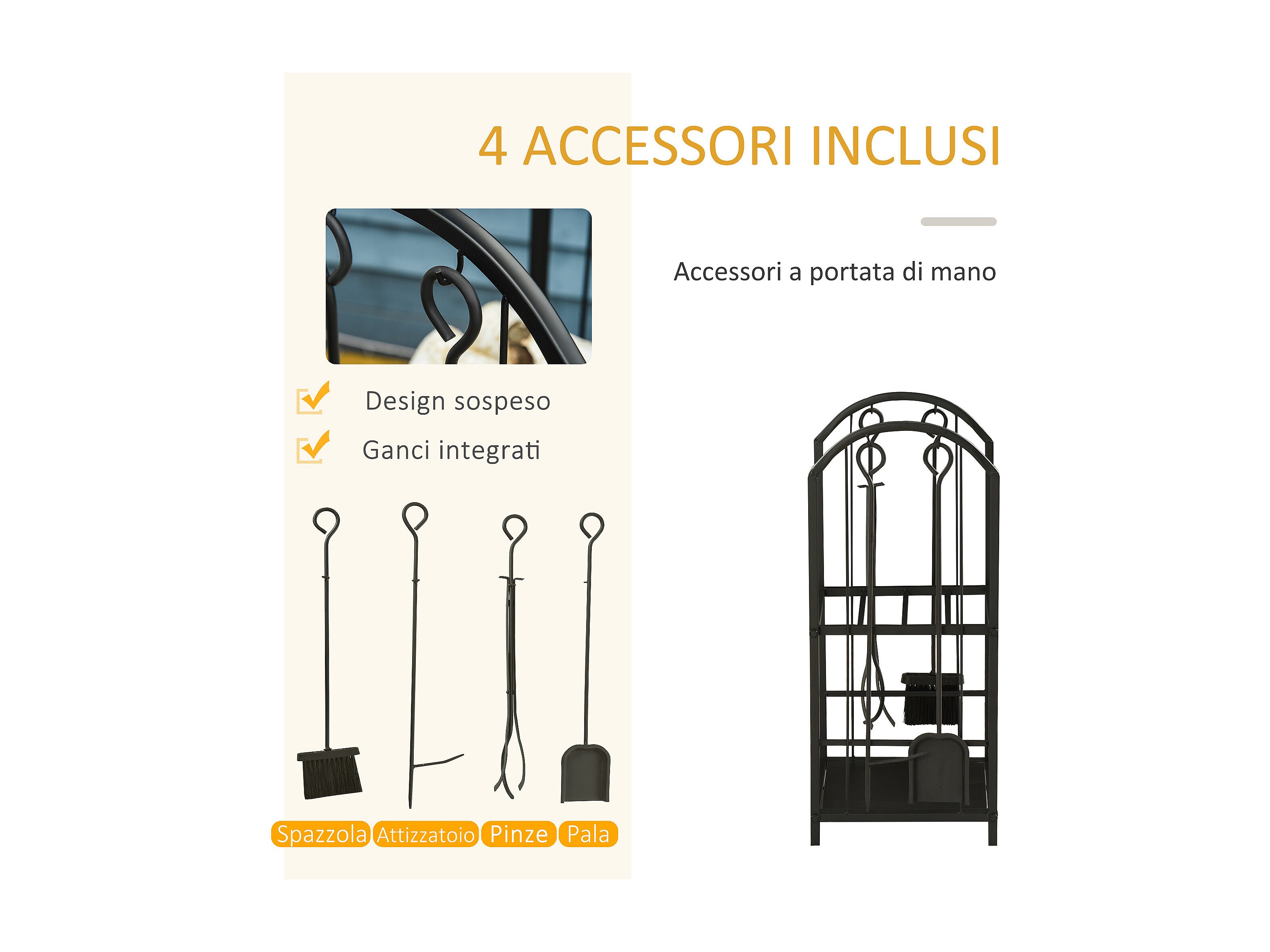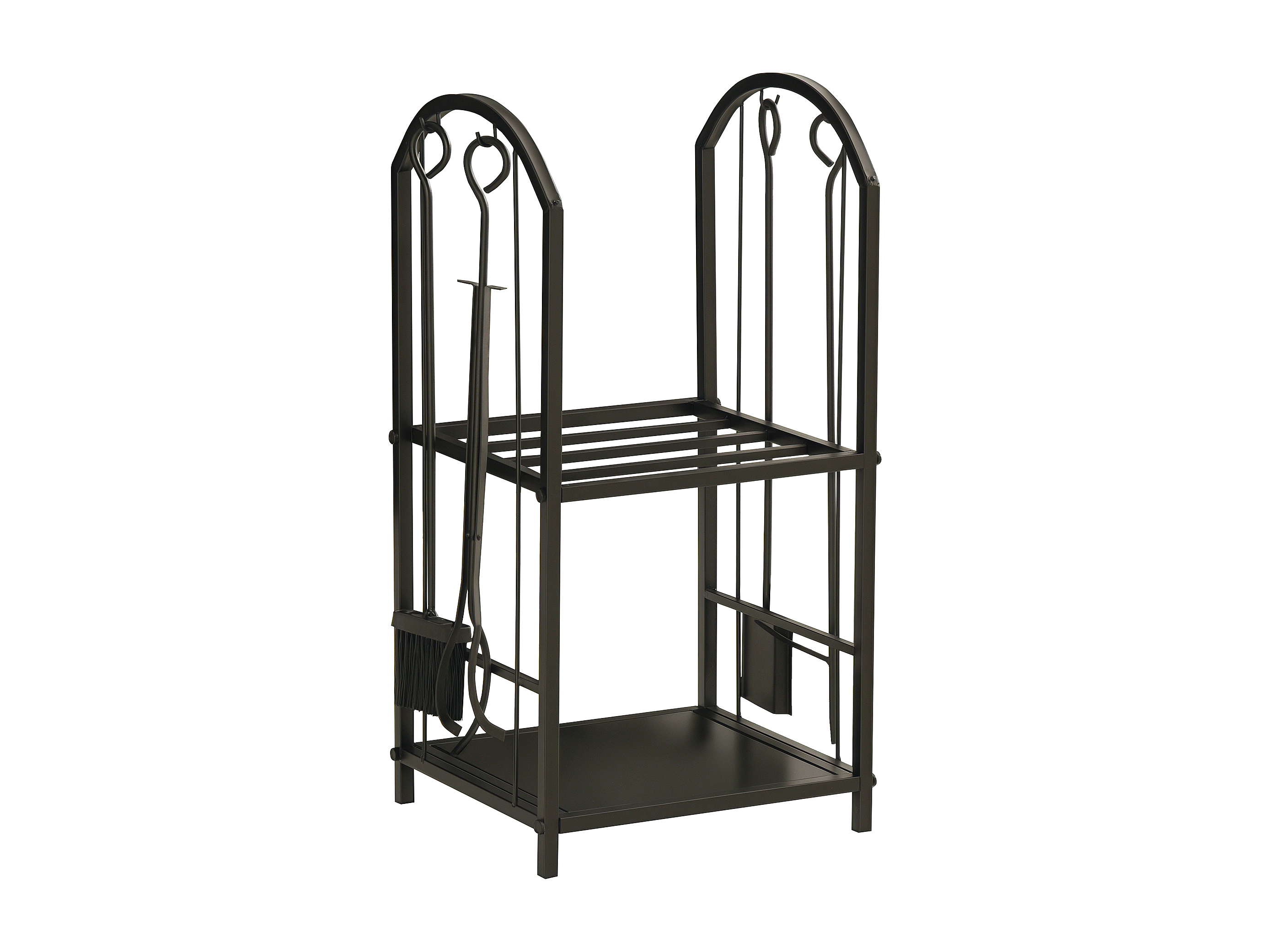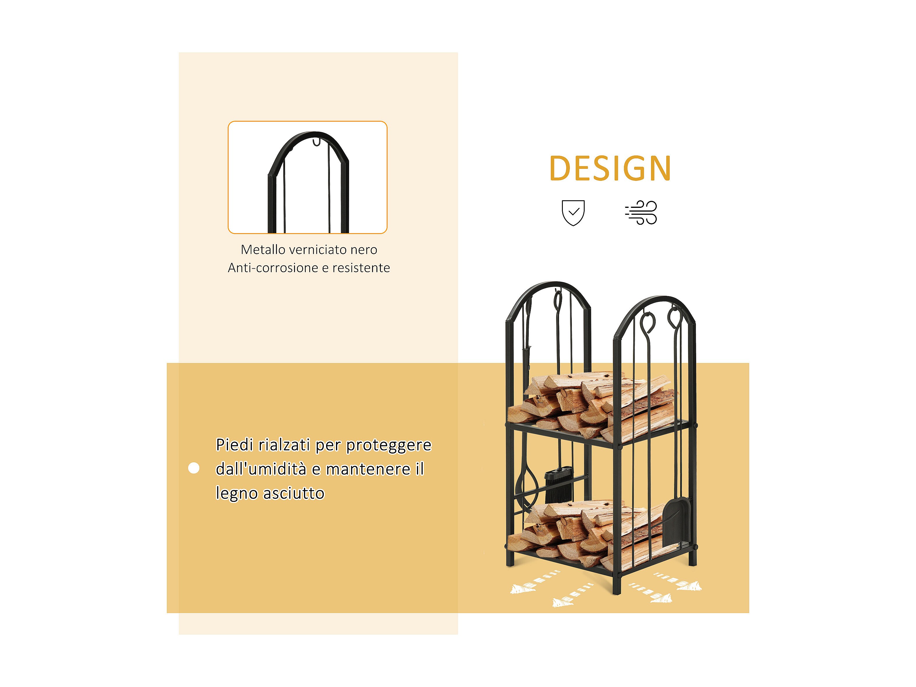 Portalegna per camino a 2 ripiani in metallo con accessori nero