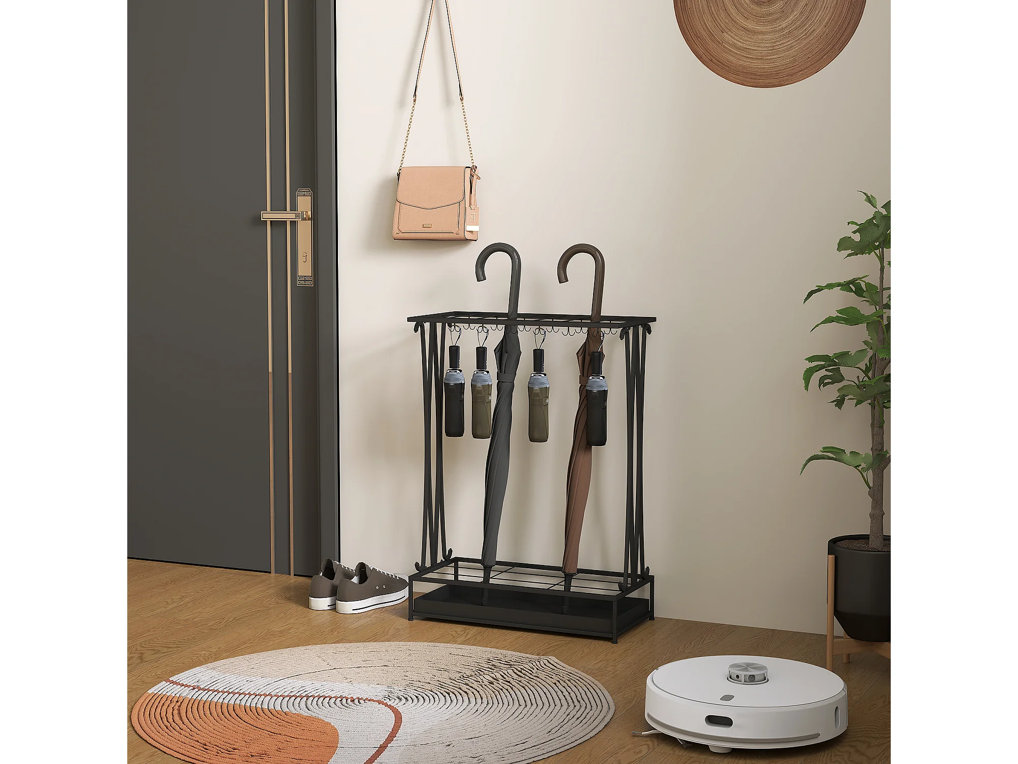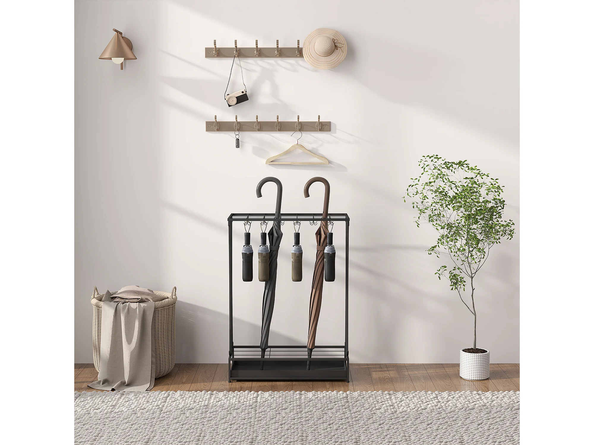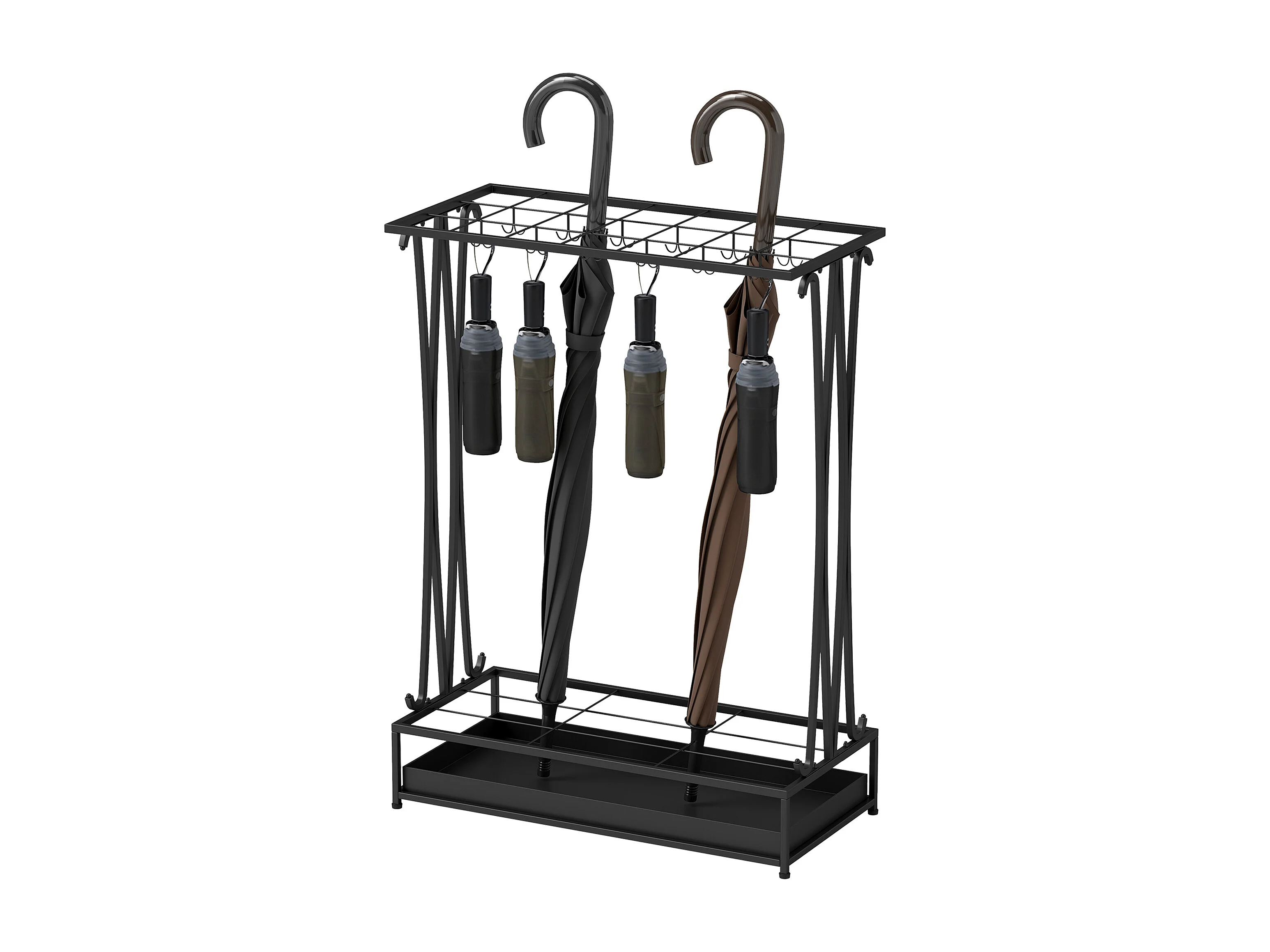 Portaombrelli di design con 4 ganci e vaschetta in metallo nero