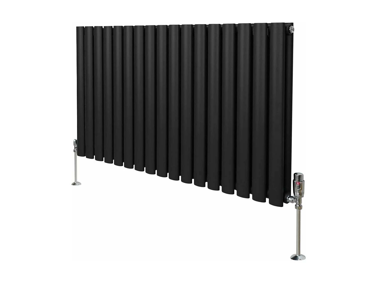 Radiatore a colonna ovale 600 mm x 1020mm Designer Doppio pannello Termosifone Nero Acciaio Orizzontale Inclusi Spazzola per la pulizia Kit di fissaggio e staffe