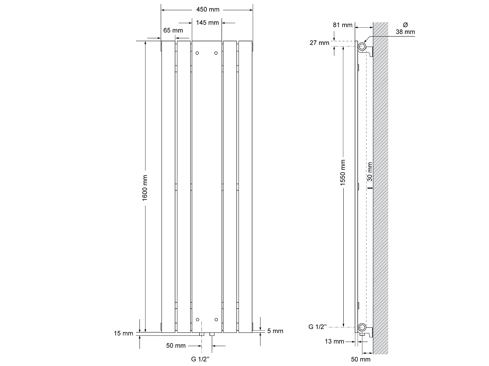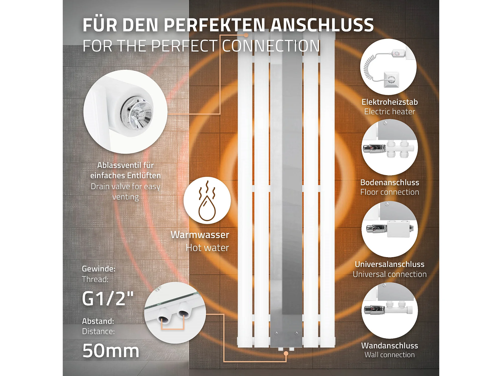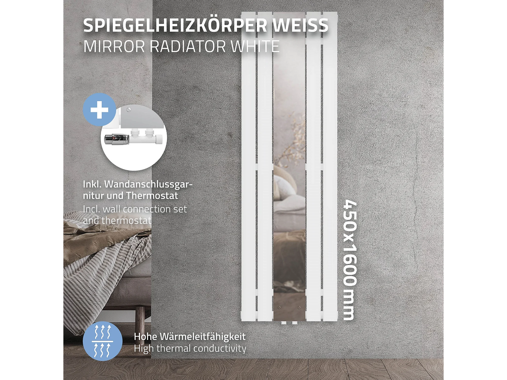 Radiatore a specchio termoarredo 450 x 1600 mm con connessione a parete bianco