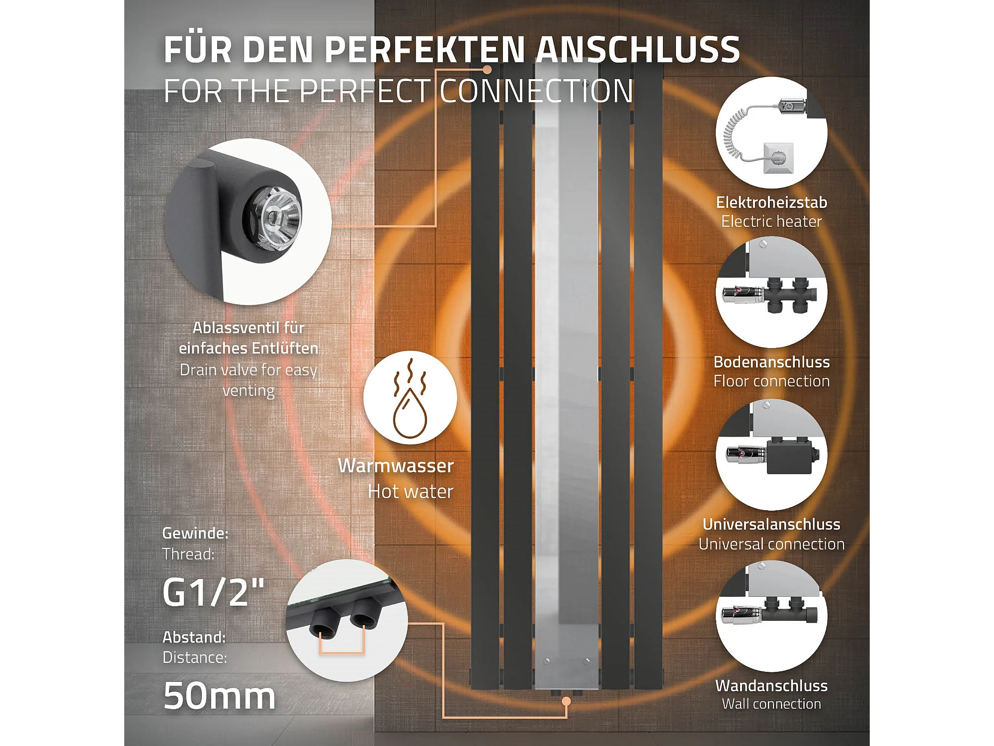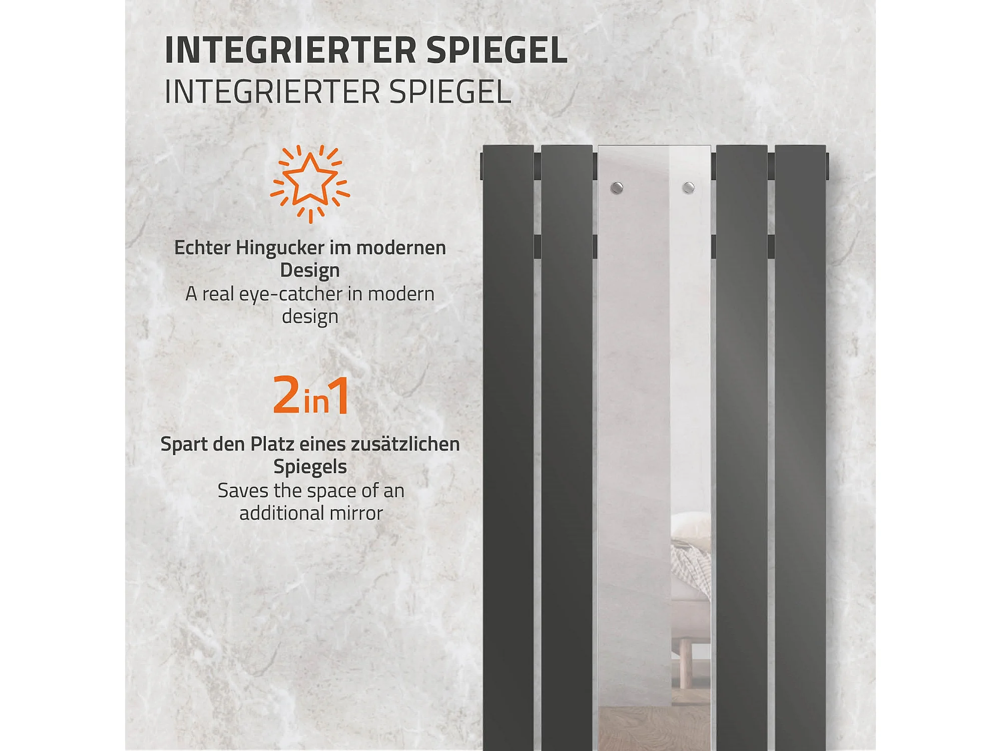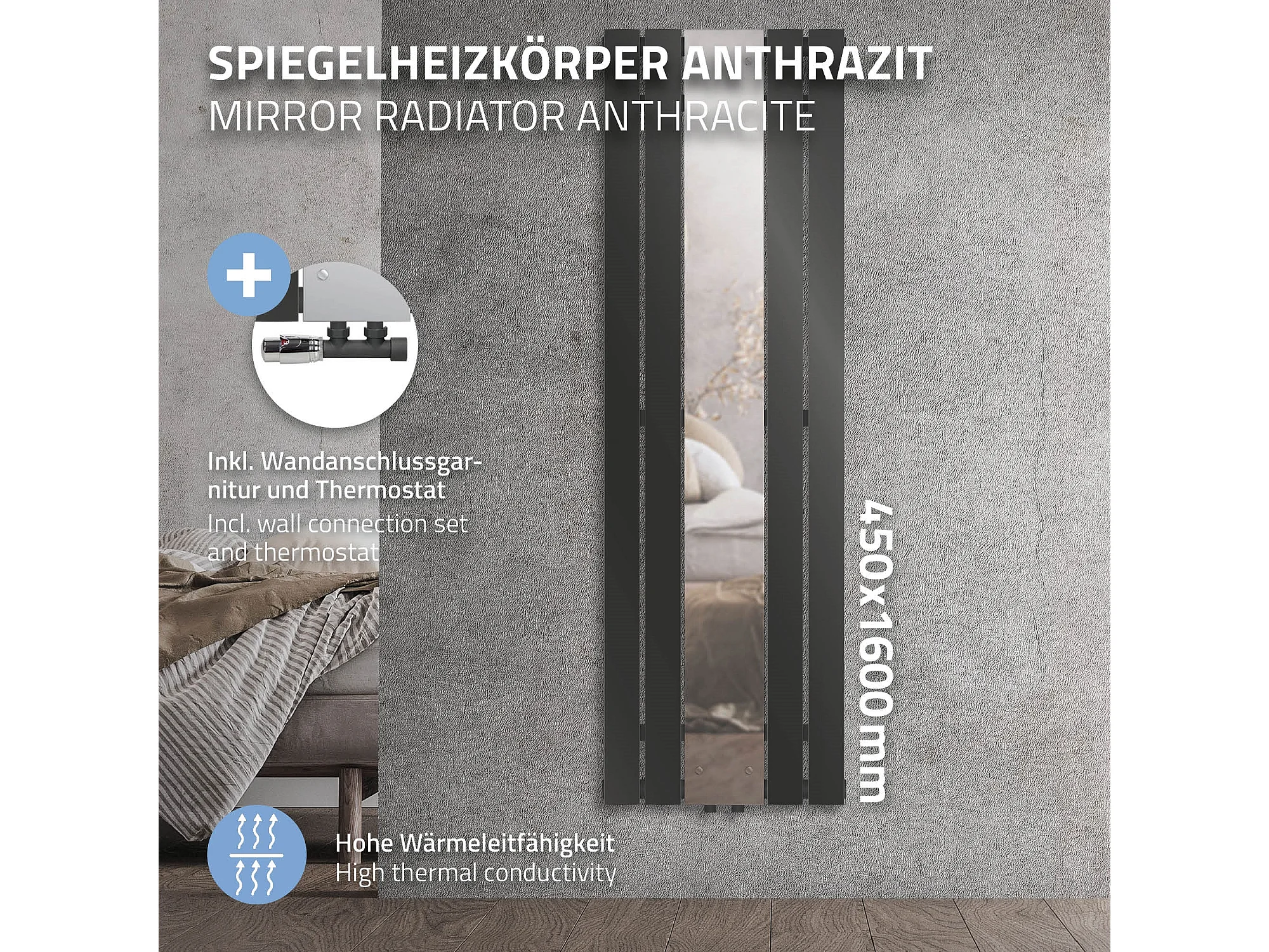 Radiatore a specchio termoarredo 450x1600 mm con connessione a parete antracite