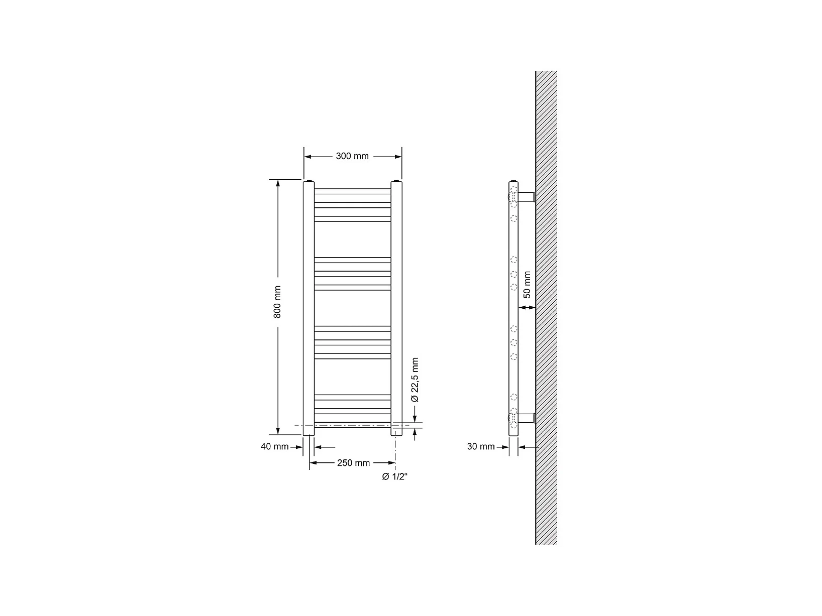 Radiatore Sahara 300 x 800 mm, Bianco con Attacco Centrale Destro, Termostato Incluso