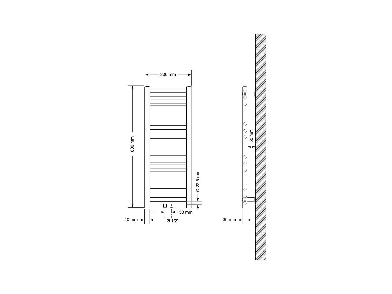Radiatore Sahara 300 x 800 mm, Bianco con Attacco Centrale Destro, Termostato Incluso