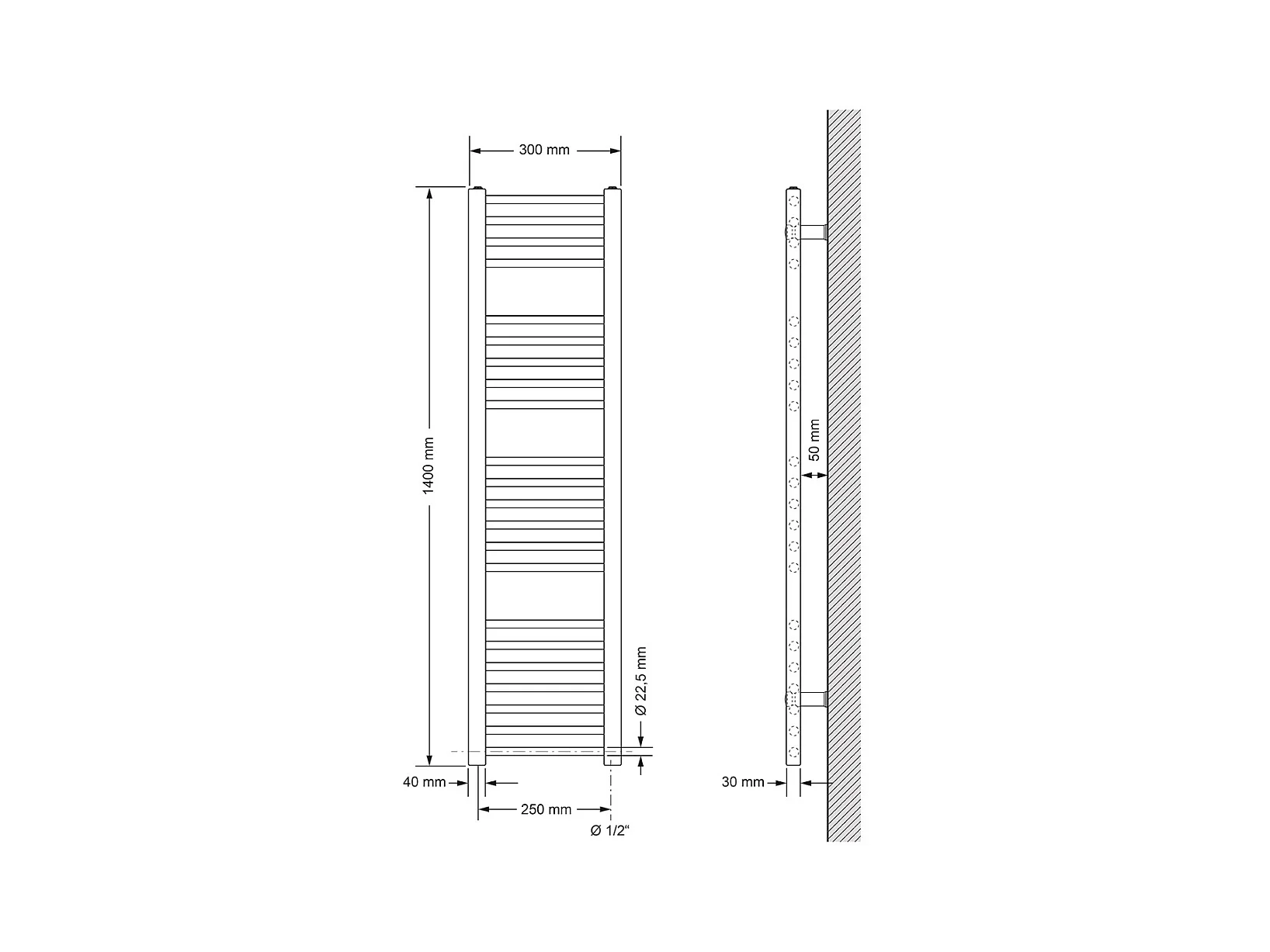 Radiatore Bagno 300x1400 mm Bianco Destro Centrale Attacco Inferiore