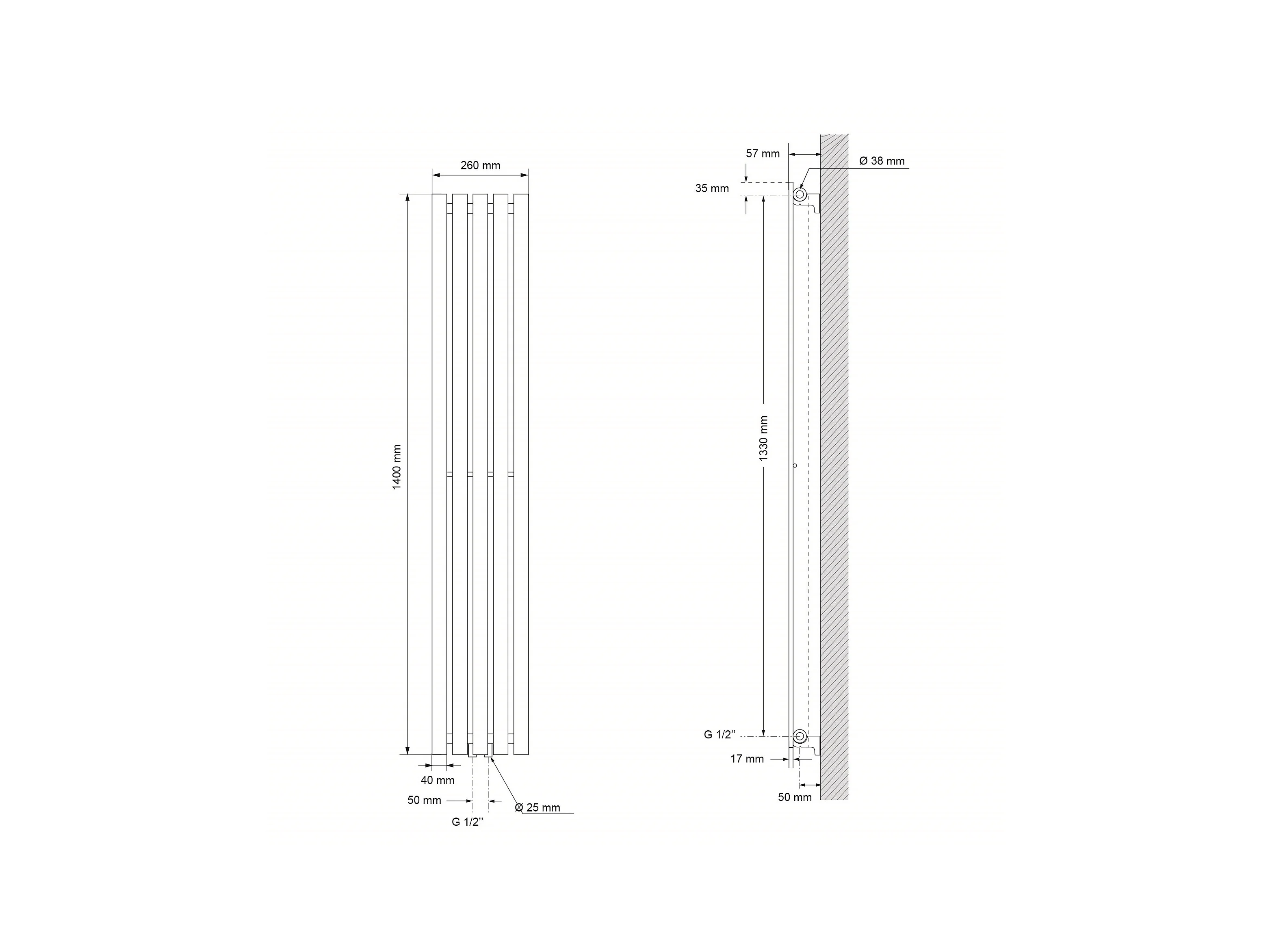 Radiatore da bagno Iron EM 600x1400mm Bianco Attacco Centrale Inferiore con Profilo