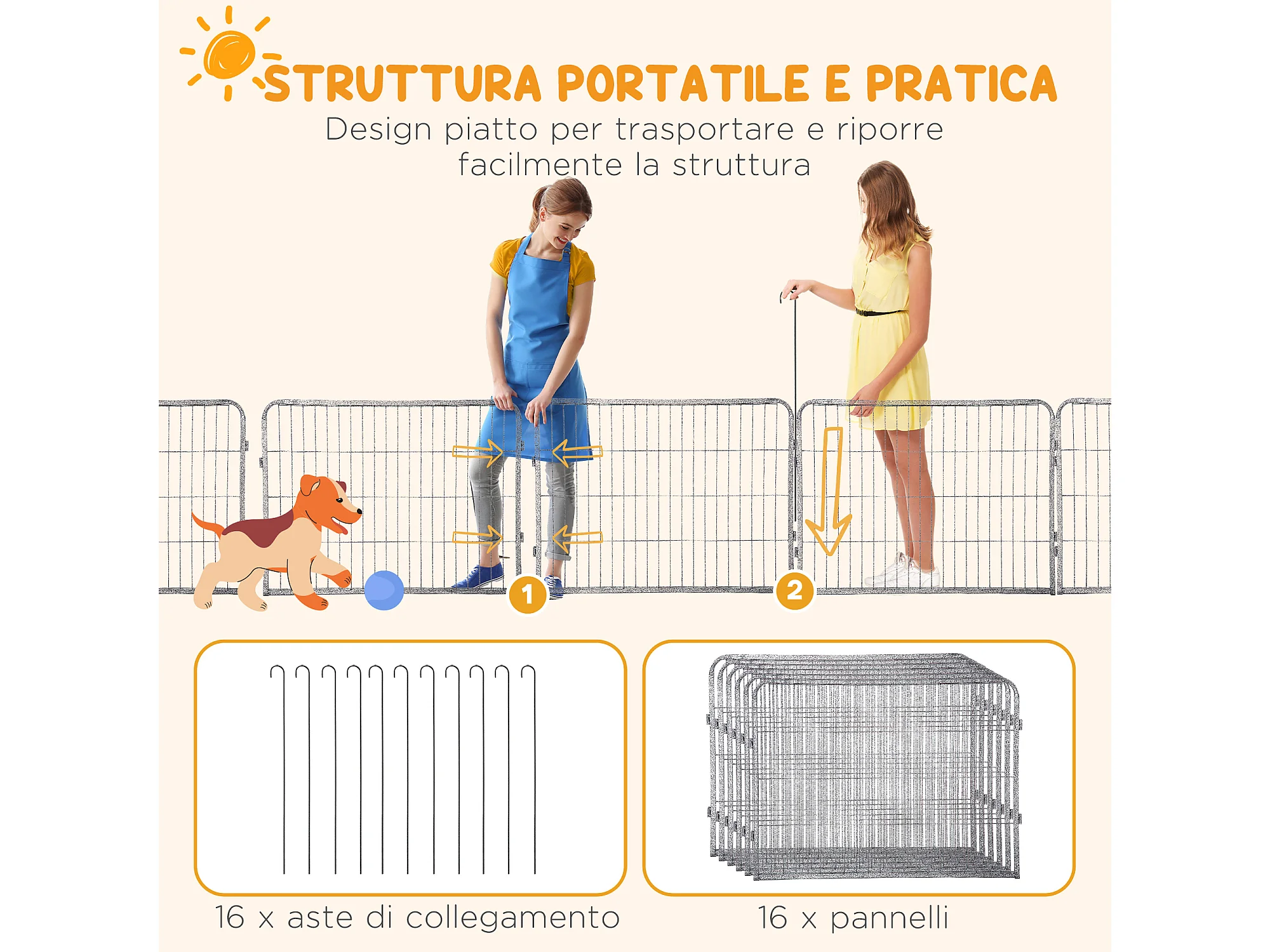 Recinto per cani 16 pannelli modulabili 2 ingressi grigio