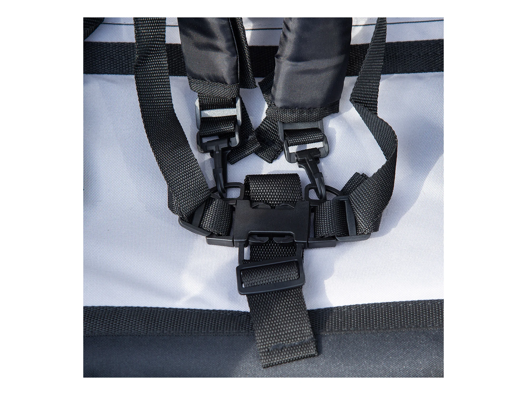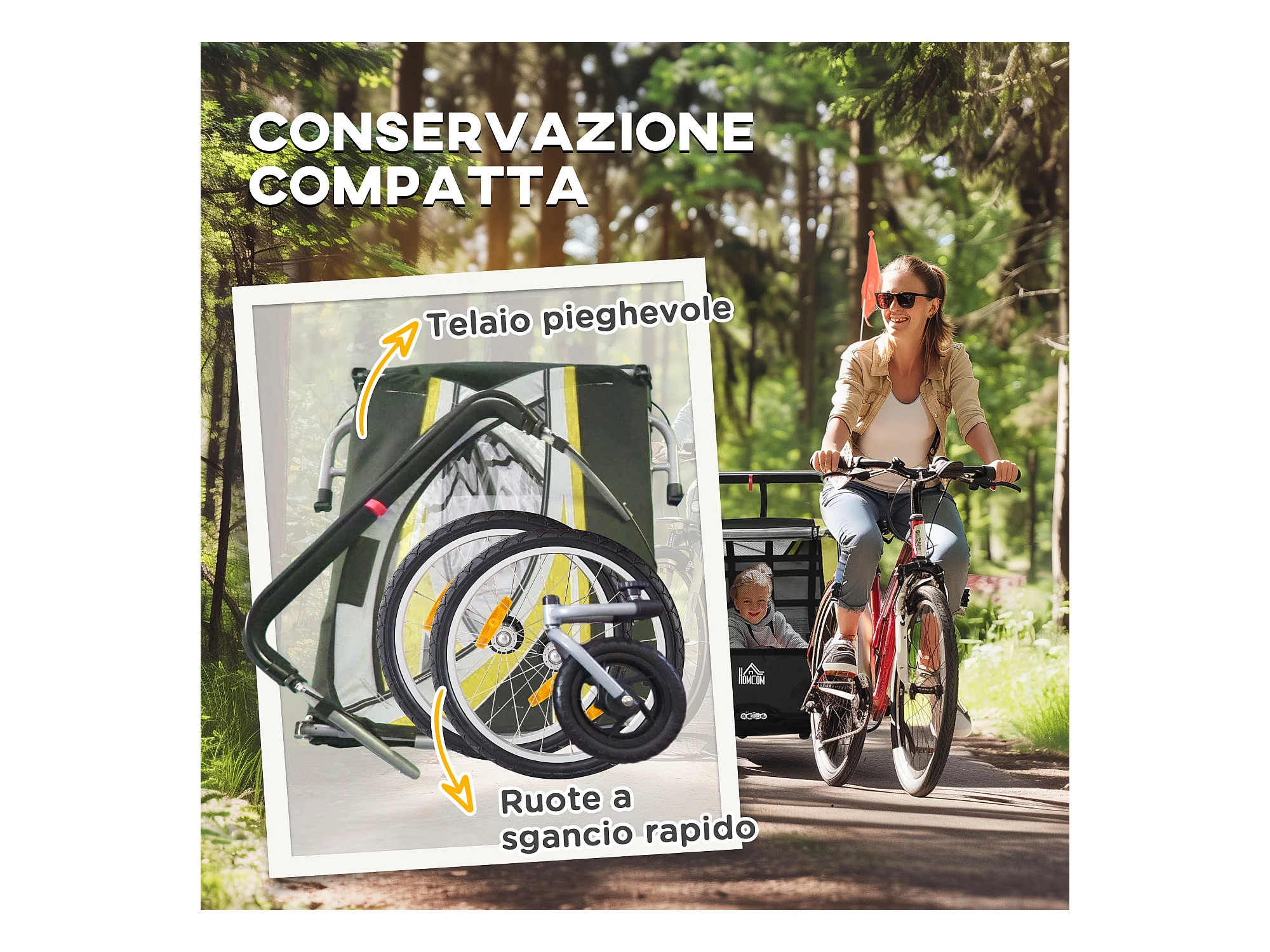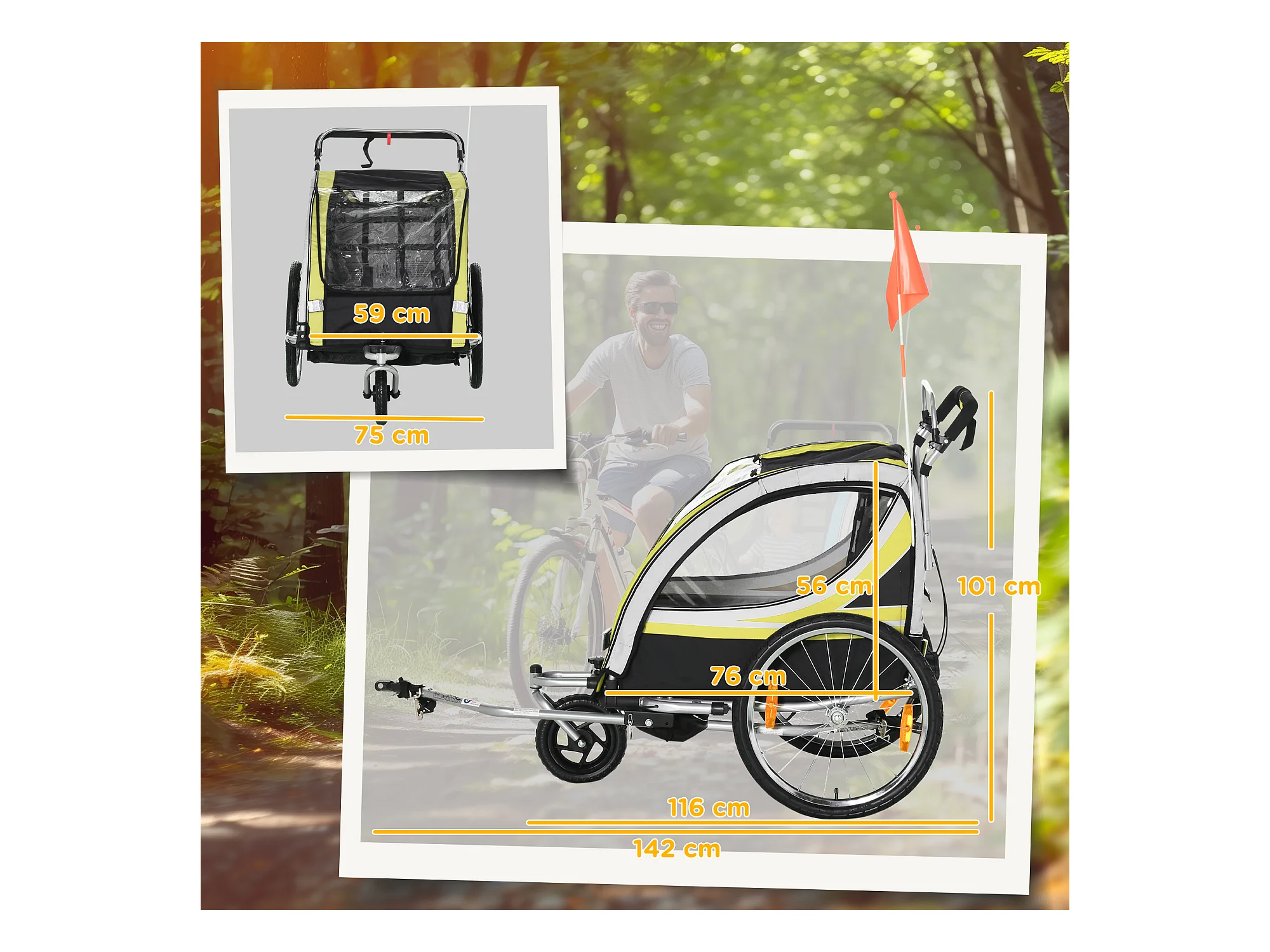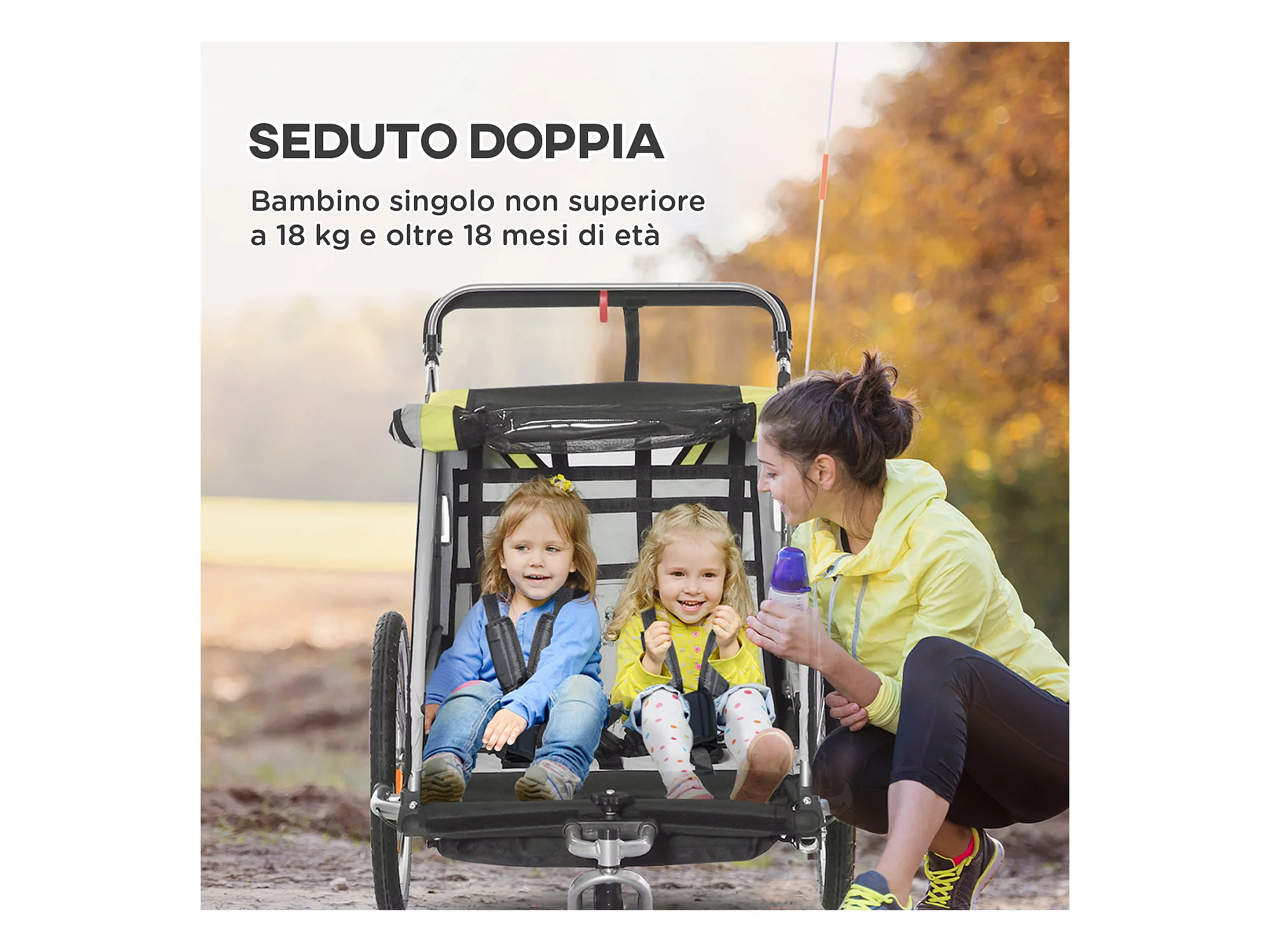 Rimorchio bici passeggino per 2 bambini e cinture di sicurezza