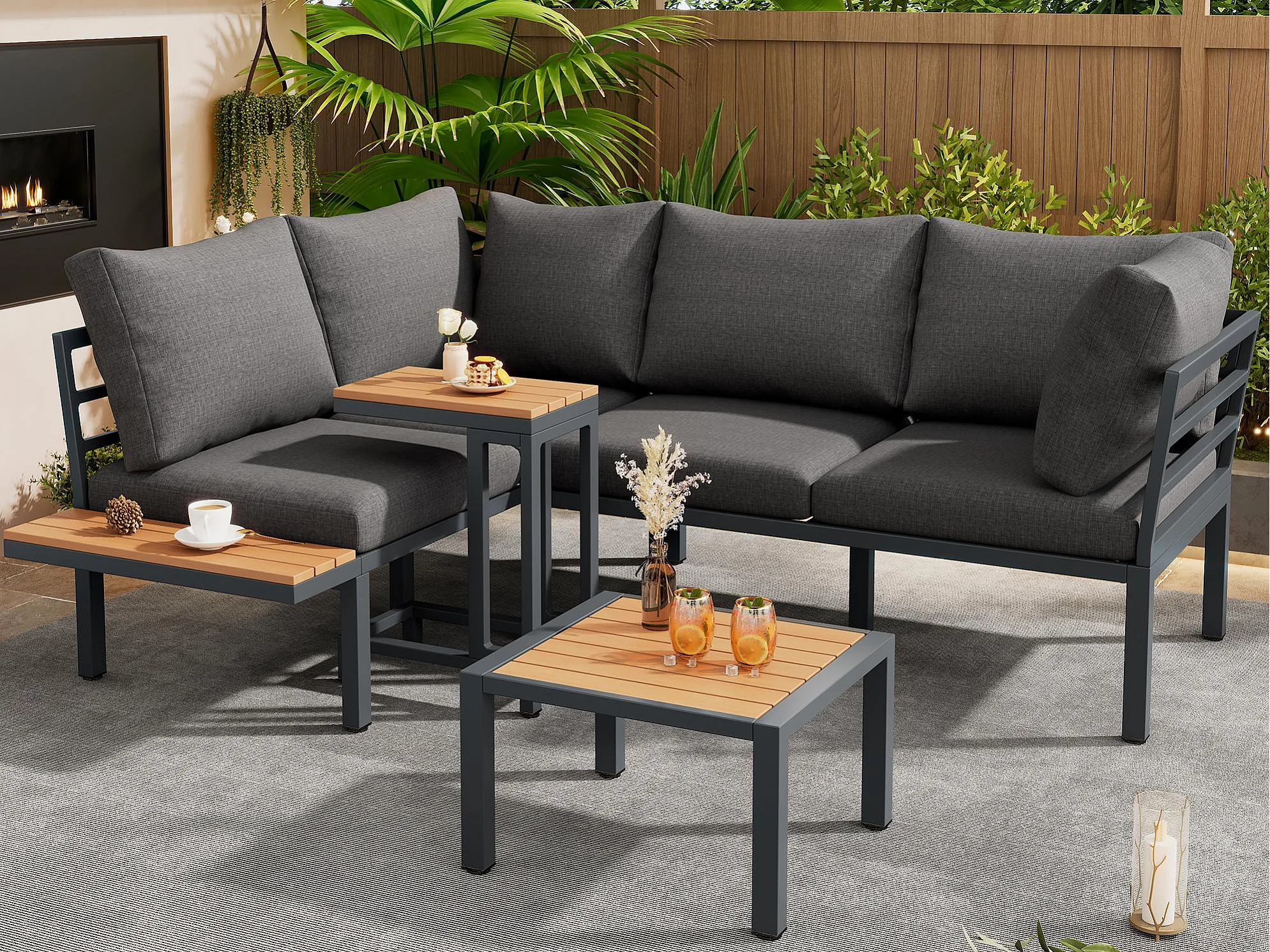 Salotto da giardino - 4 posti - in acciaio zincato - divano ad angolo - 1 tavolino aggiuntivo - 1 sgabello - piano in legno plastico - Grigio