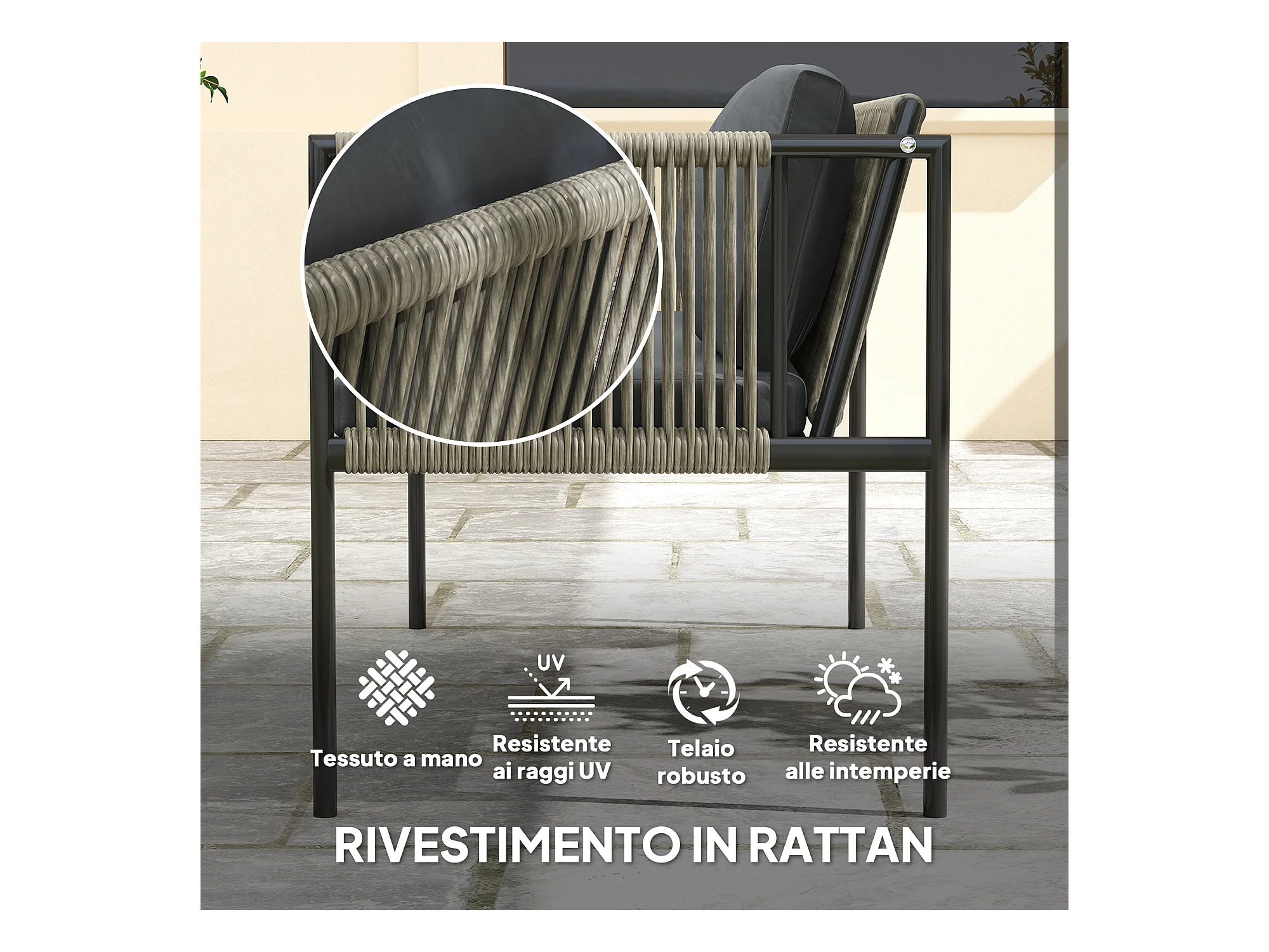 Salotto da esterno con divano poltrona e tavolino in rattan grigio