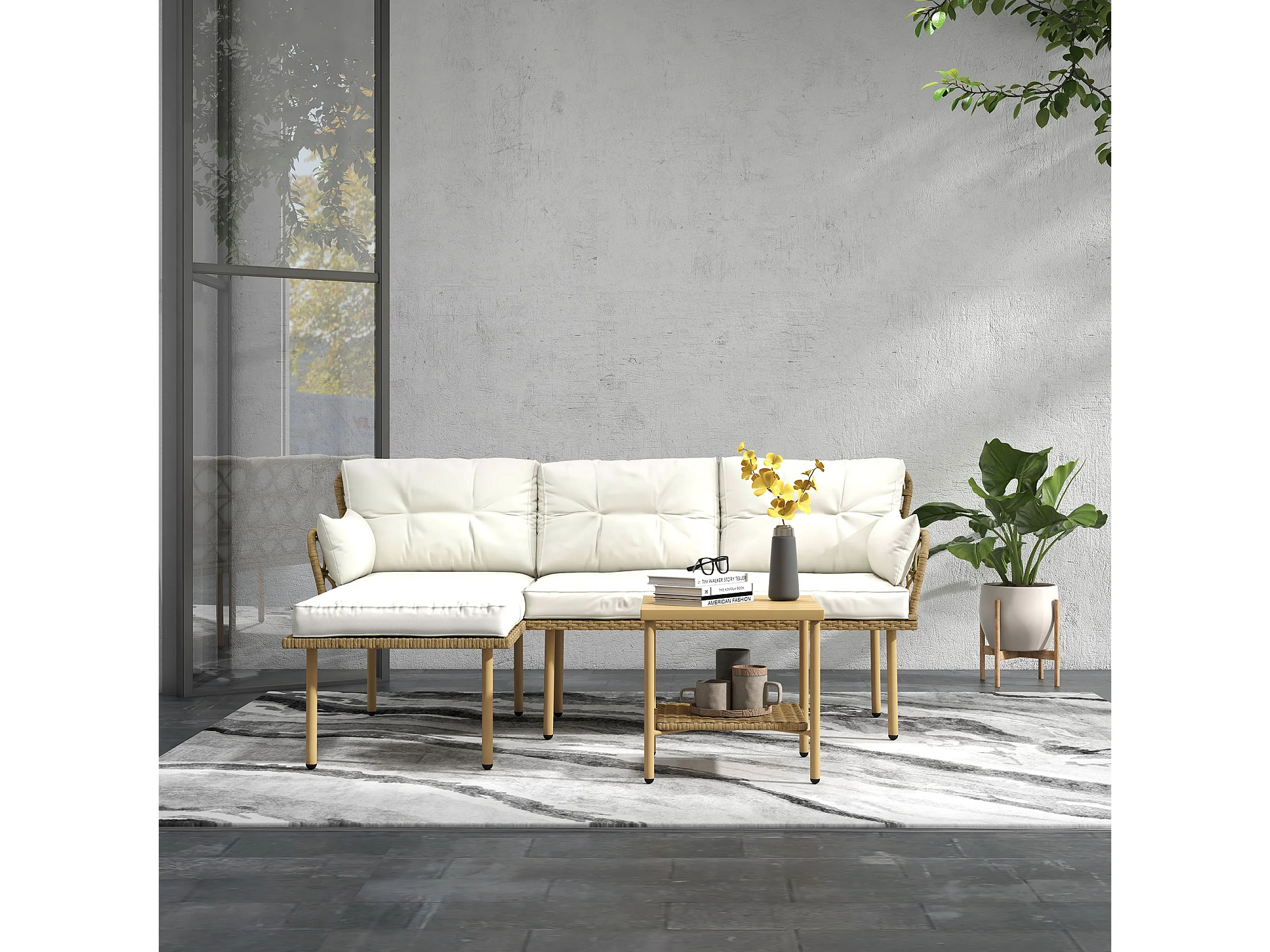 Salotto da giardino con chaise longue, divano e tavolino crema e legno
