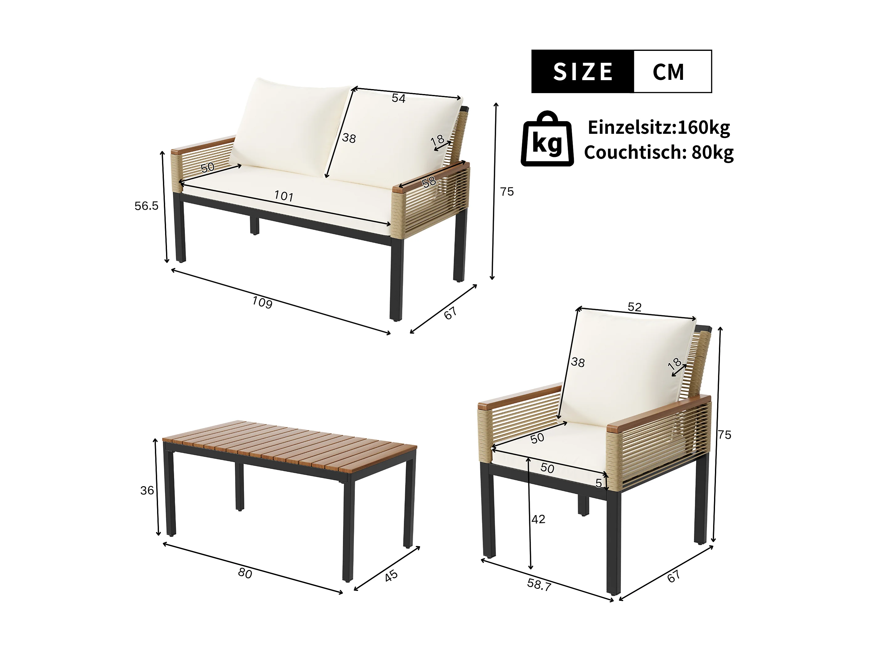 Salotto da giardino con cuscini, divano doppio, 2 poltrone e tavolo, rattan, beige