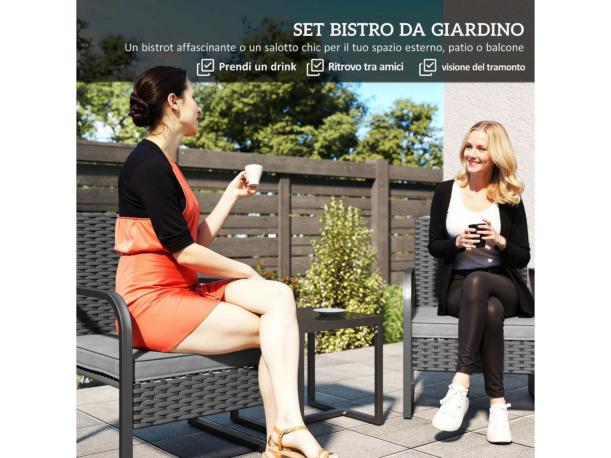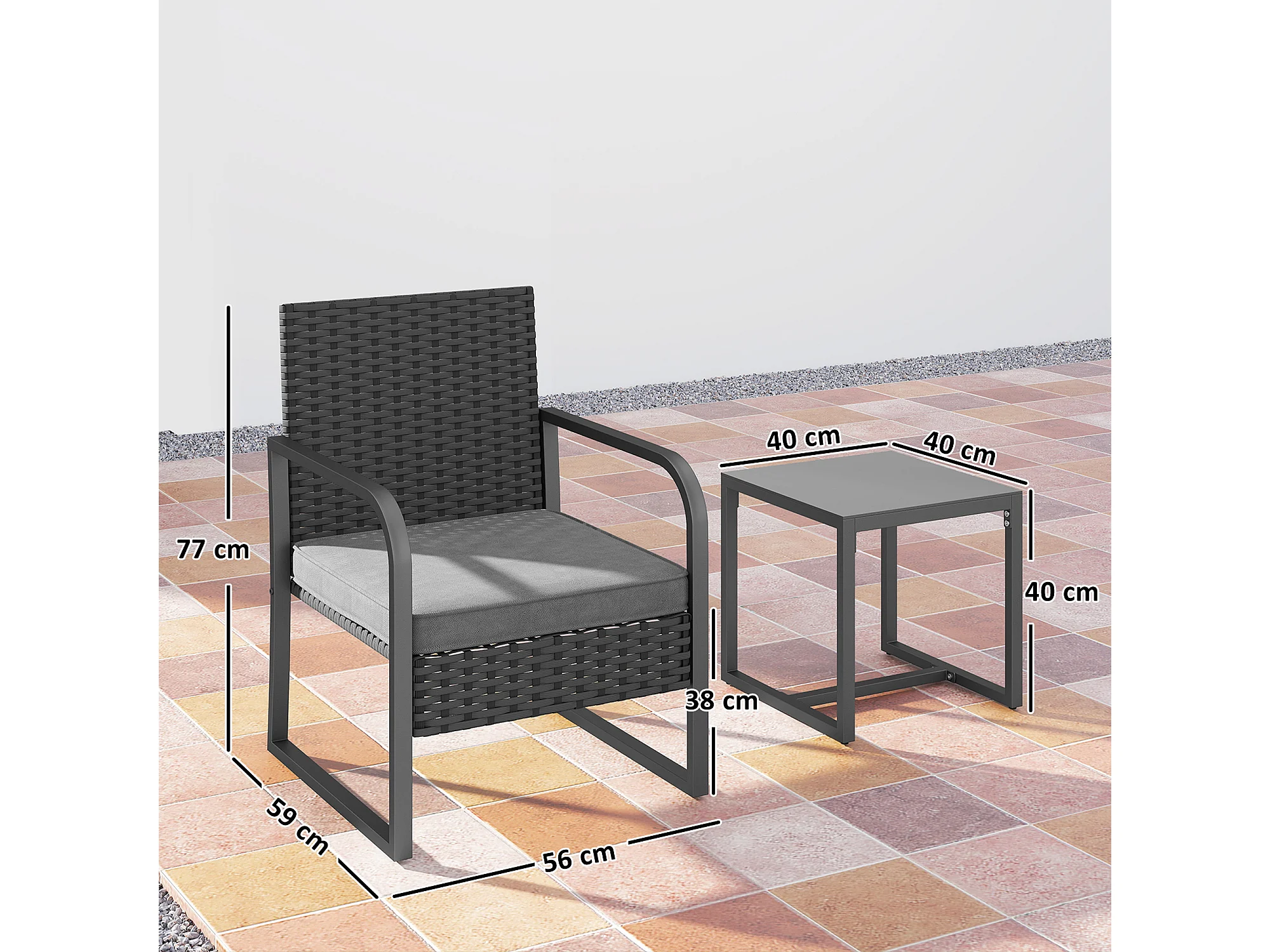 Salotto da giardino in rattan con 2 poltrone e tavolino nero