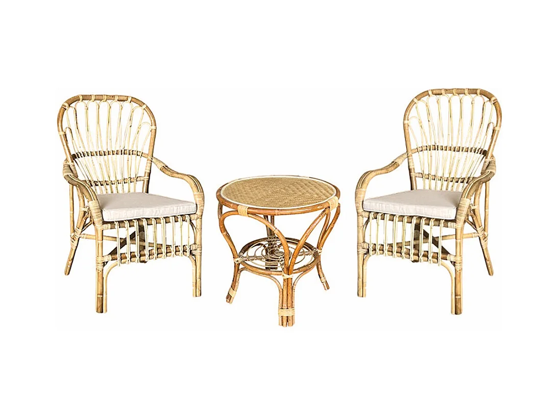 Salotto Amanda in legno di bambu e paglia di vienna con 2 poltrone e 1 tavolino