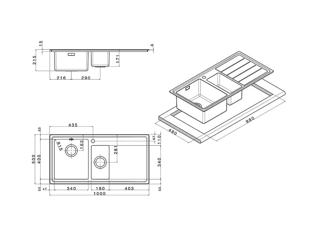 Lavello cucina 2 vasche e gocciolatoio bianco 116x50 Enigma D200