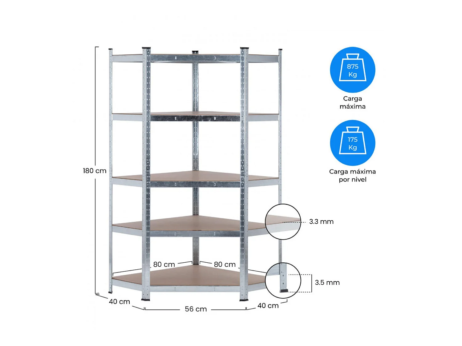 Scaffale angolare modulare zincato con 5 ripiani regolabili 180x80x40x40x56cm 875Kg 7house