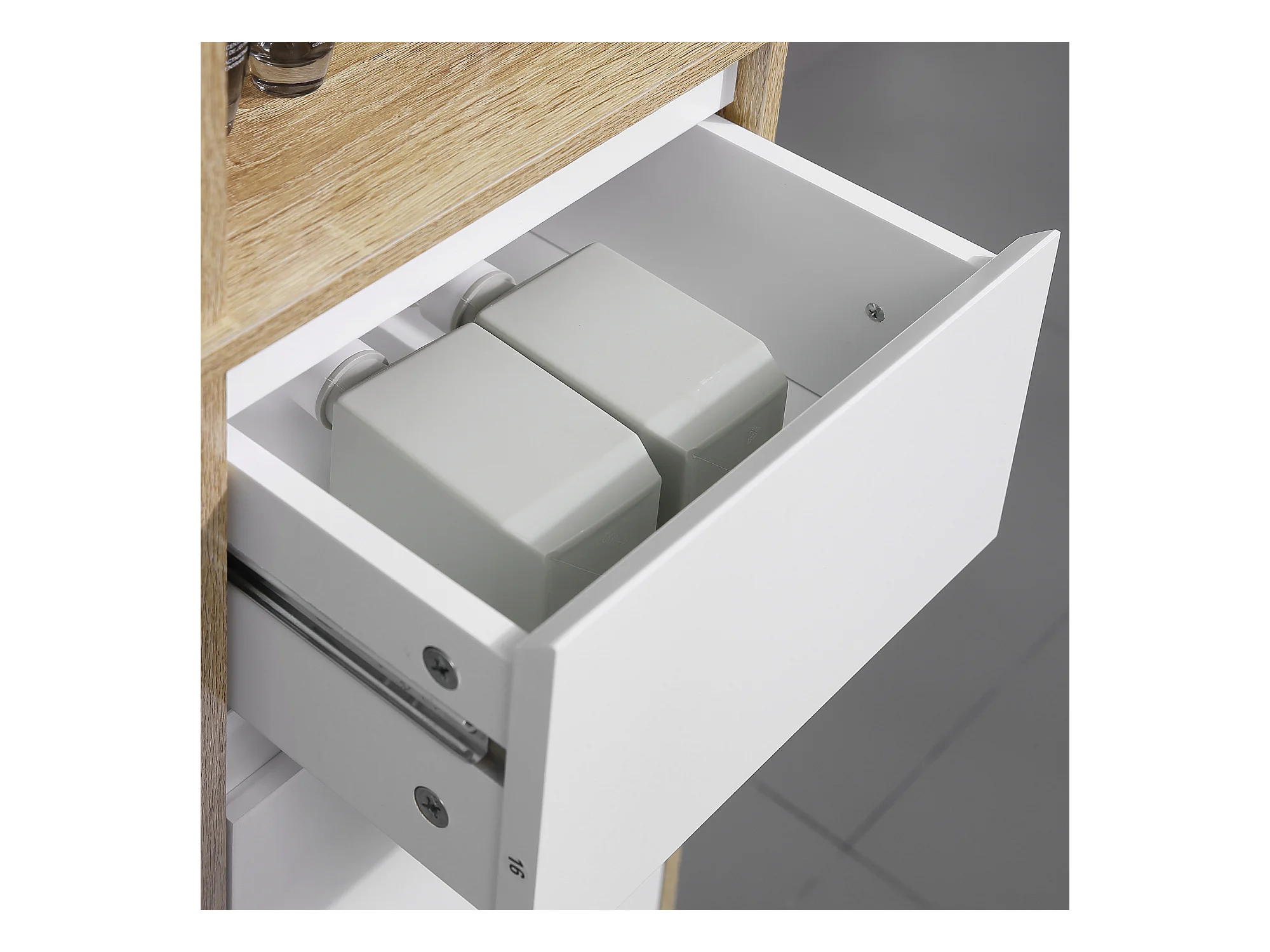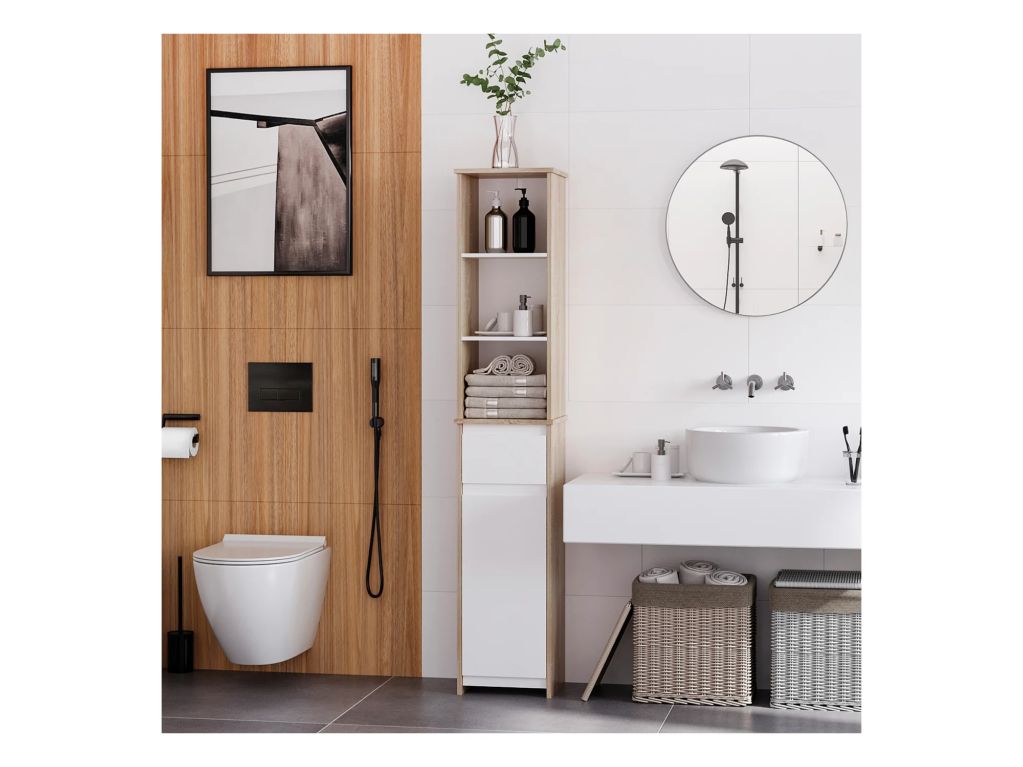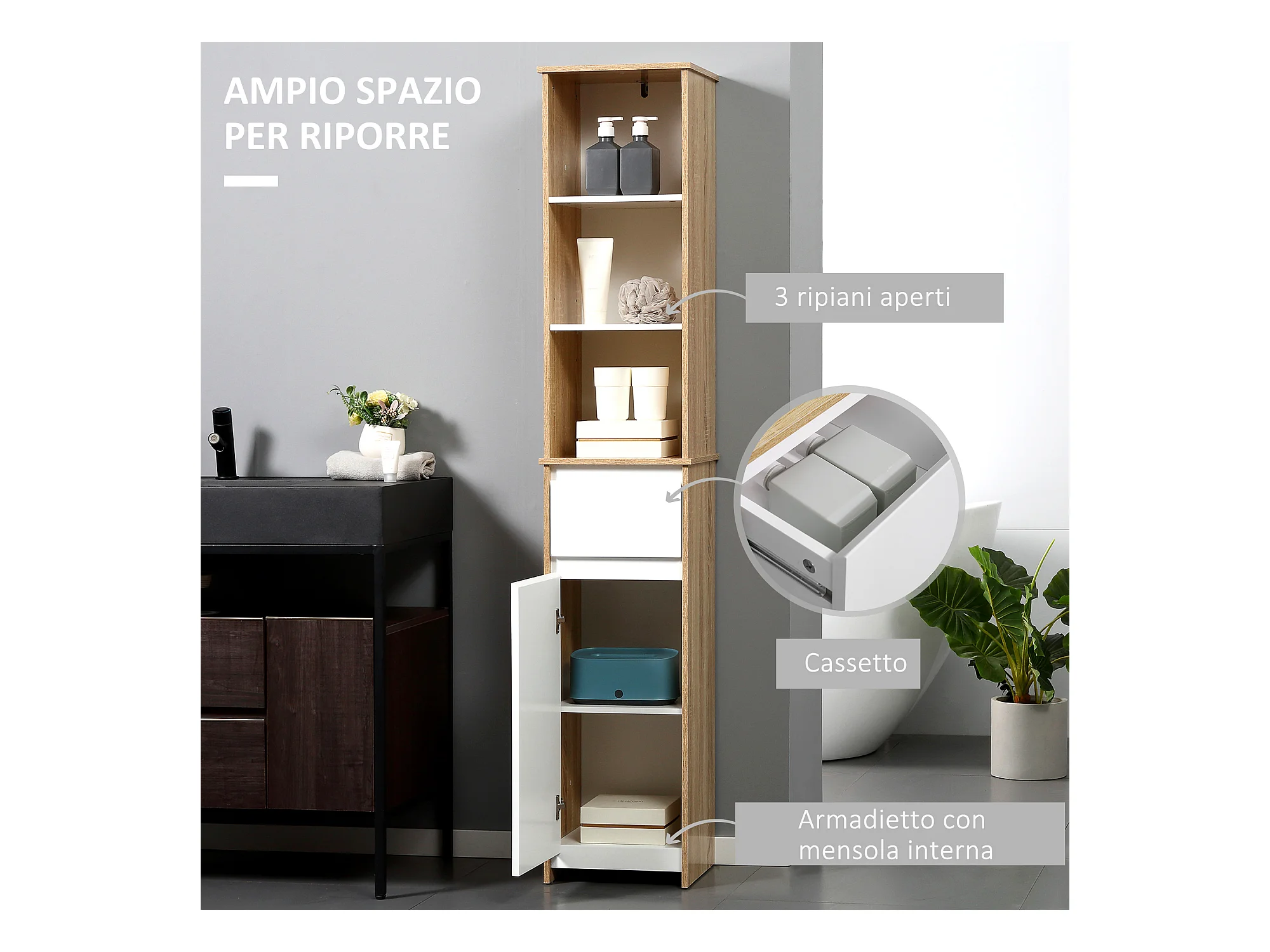 Armadietto da bagno a colonna con ruote e cassetto legno color rovere