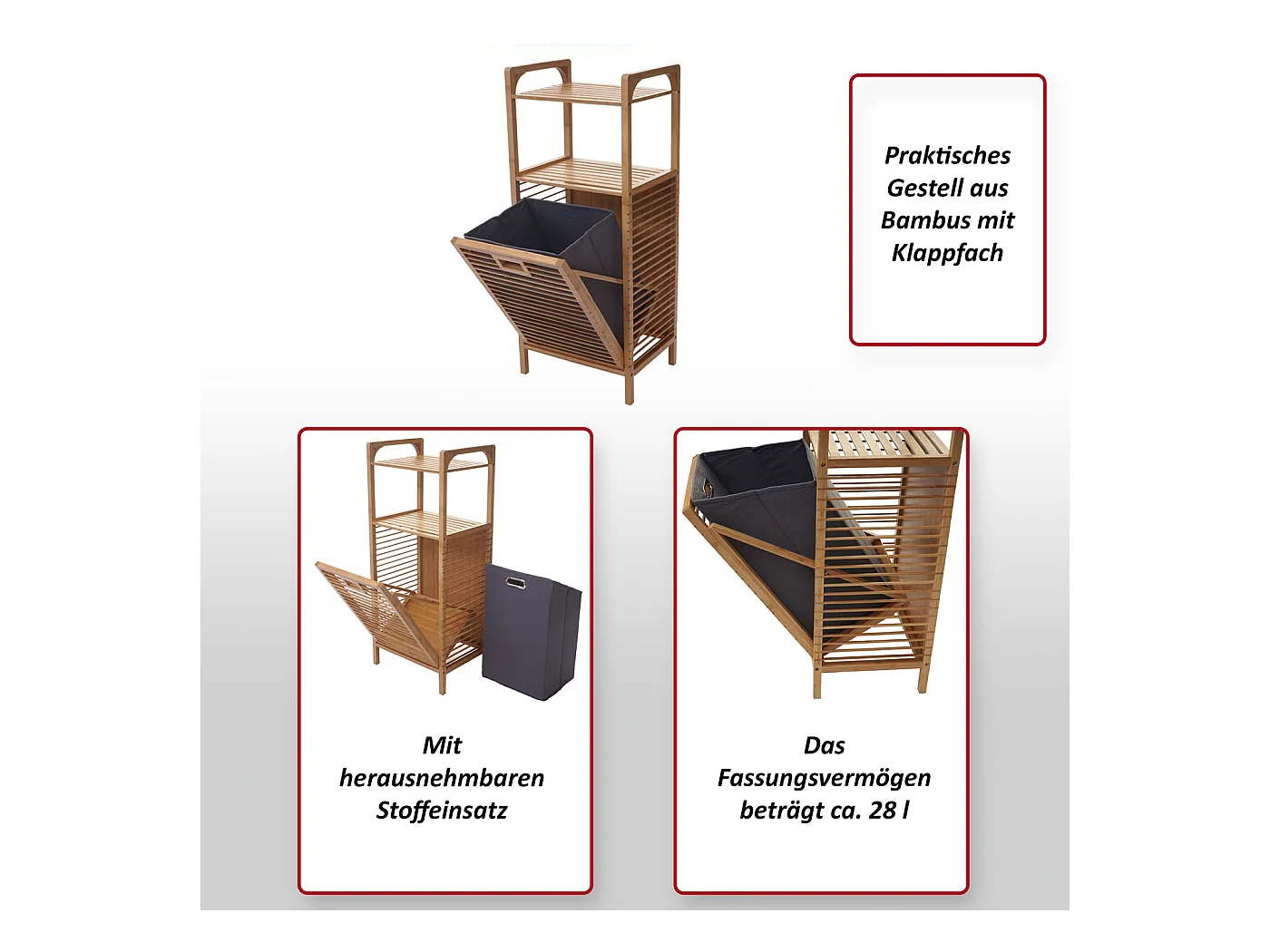 Wäschekorb mit Plattform, 3 herausnehmbare Taschen, Bambus und Polyester, grau+natur (50x32x69,7 cm)