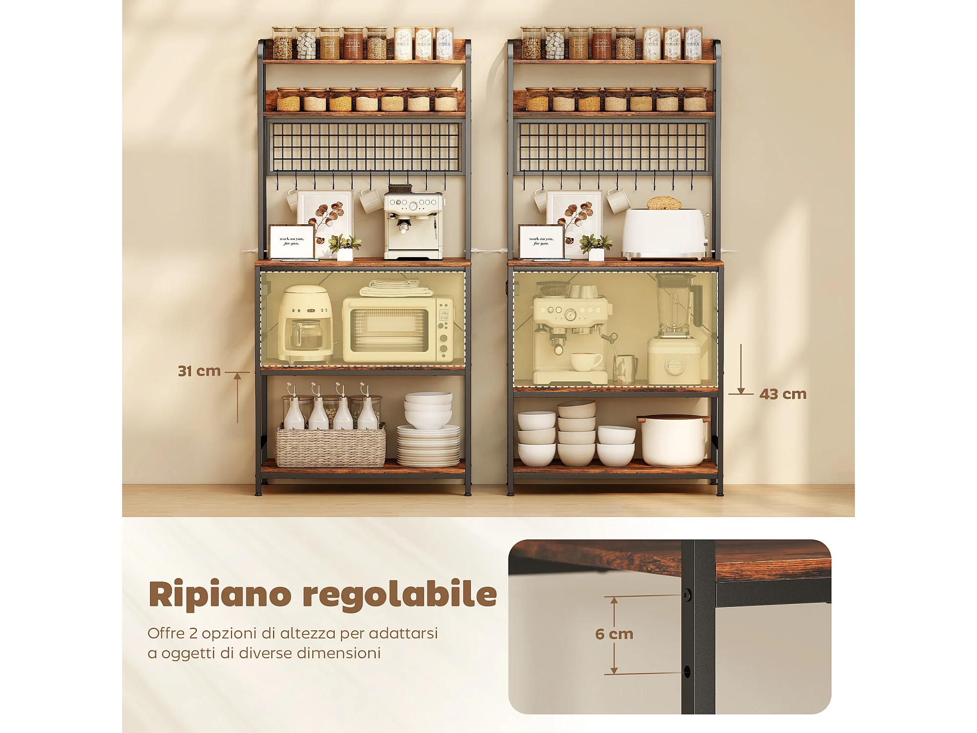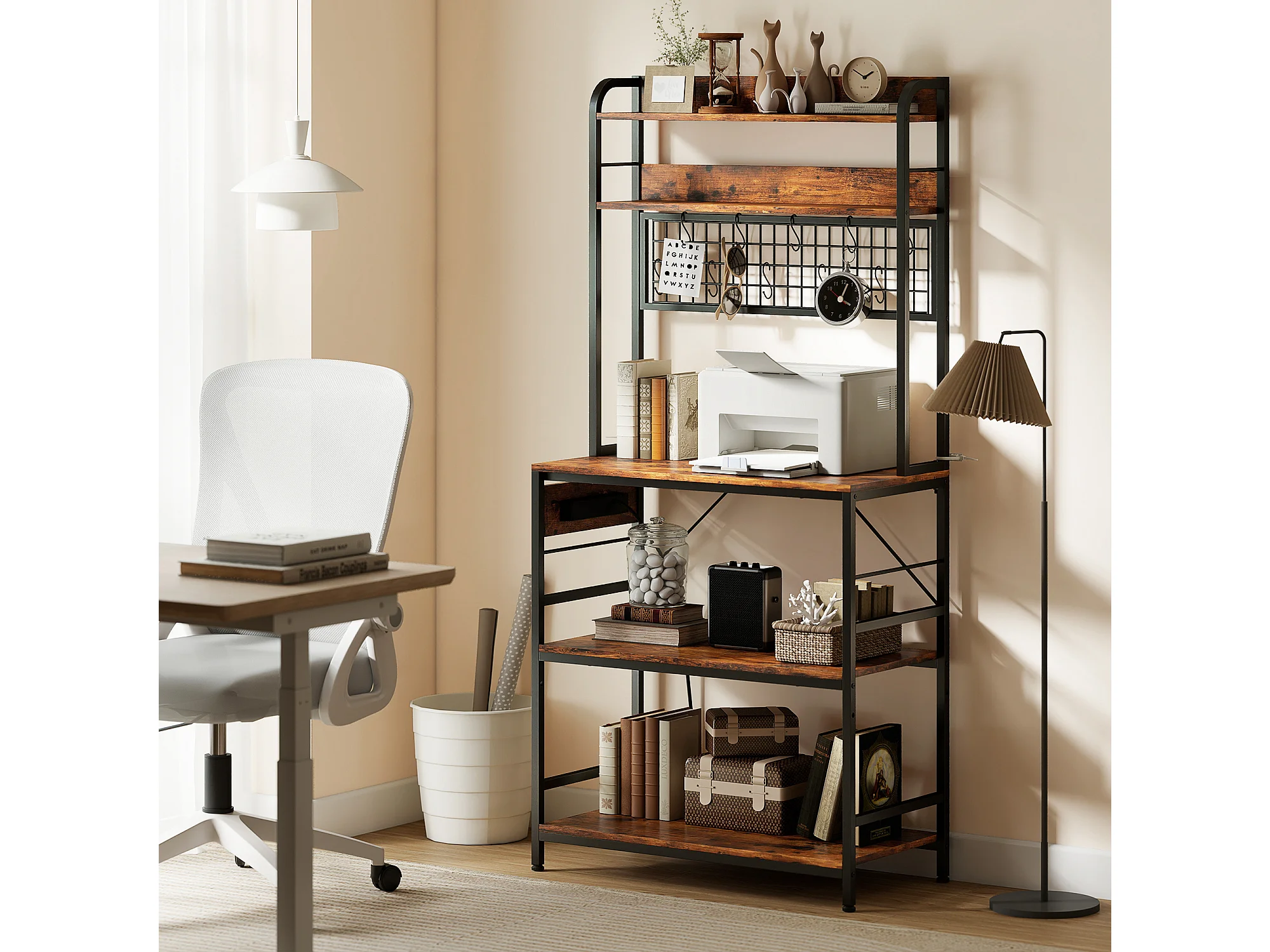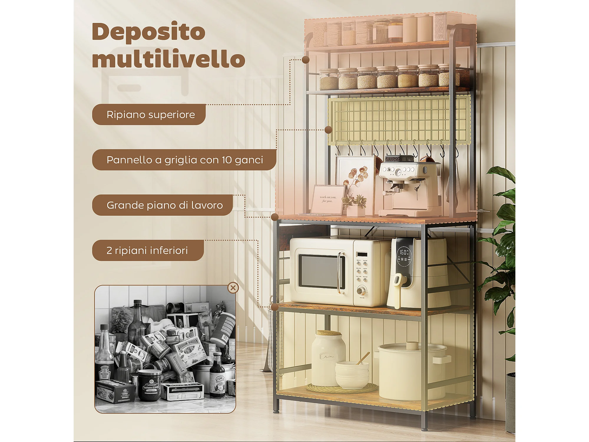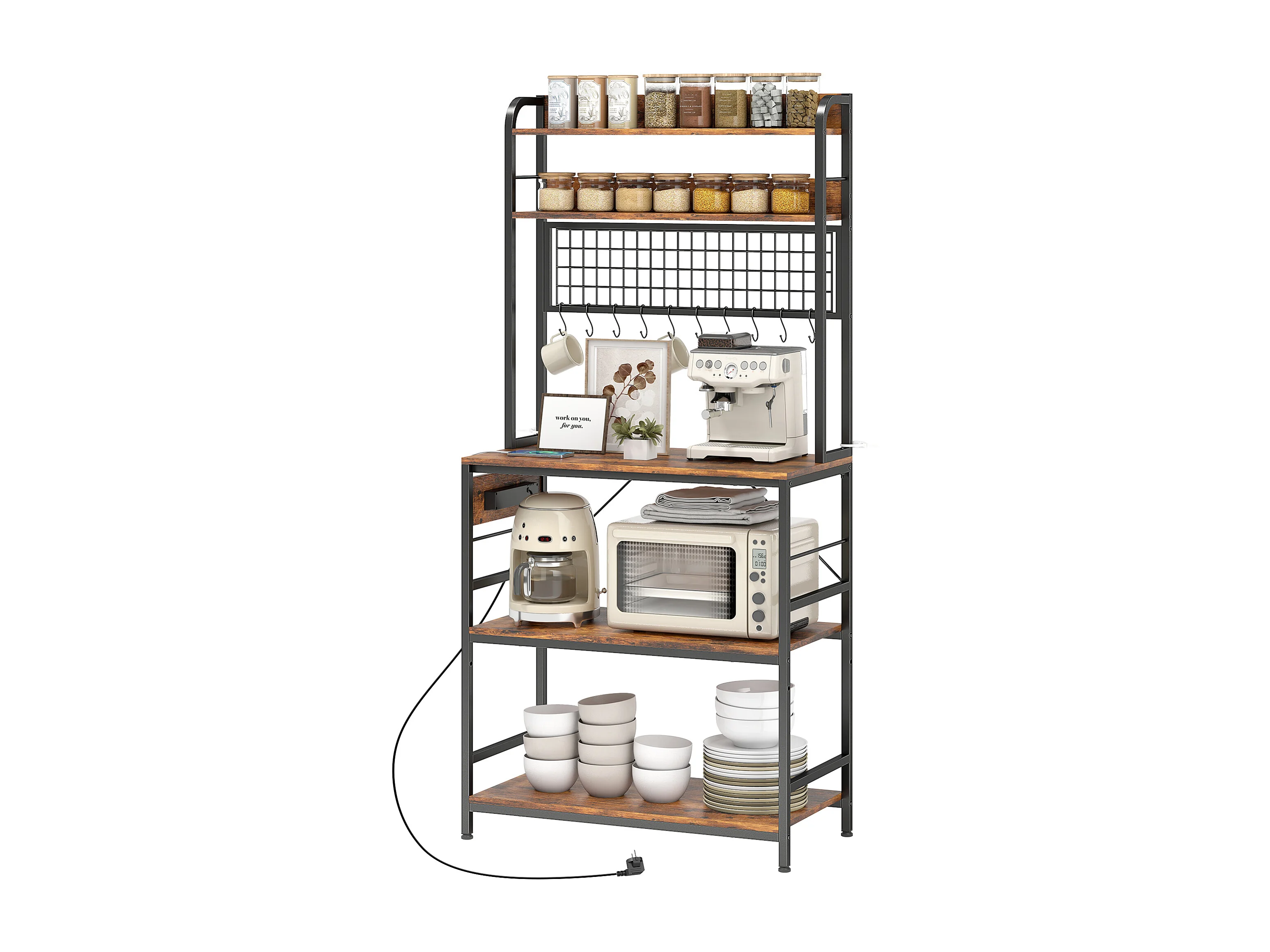Scaffale da cucina con punto di ricarica, 5 ripiani e 10 ganci marrone