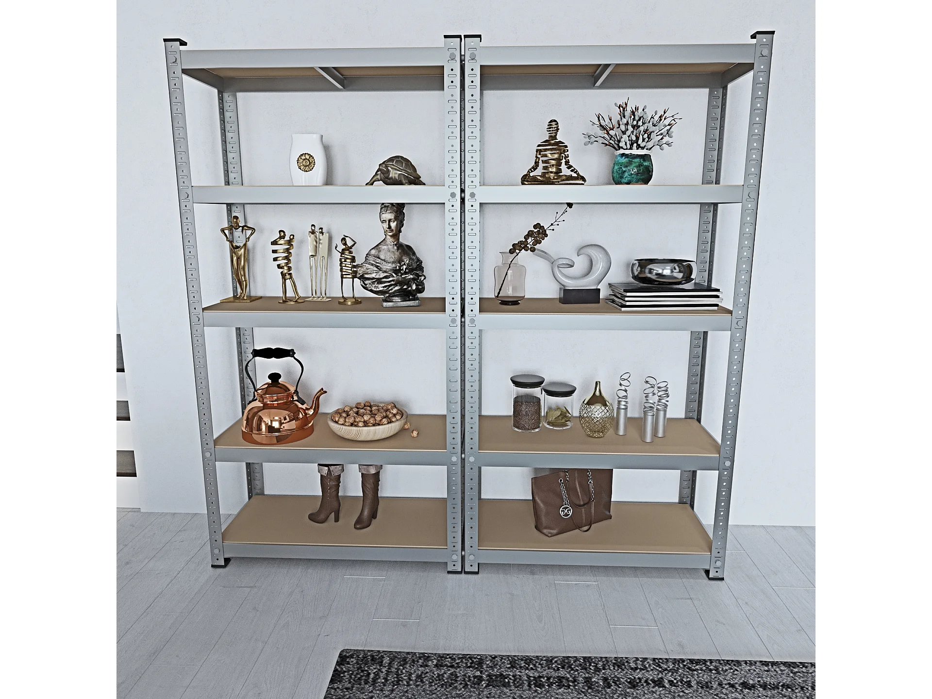 Mensola angolare a 5 ripiani in acciaio argentato e legno ingegnerizzato