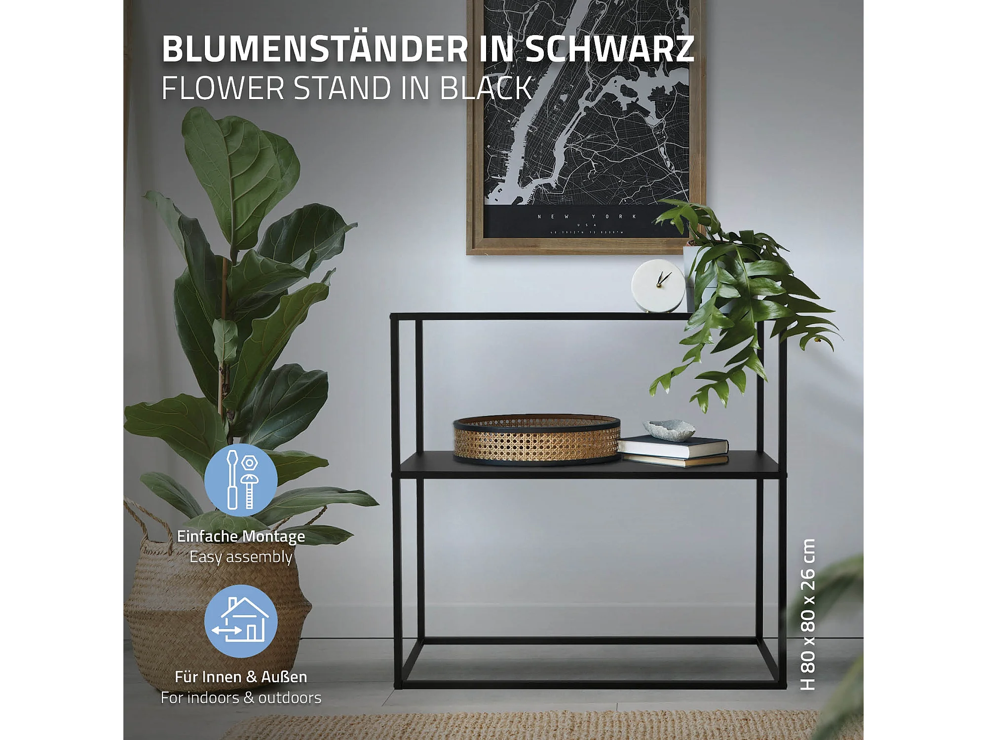 Scaffale per piante fiori vasi con 2 ripiani in metallo nero 80x26x80cm multiuso