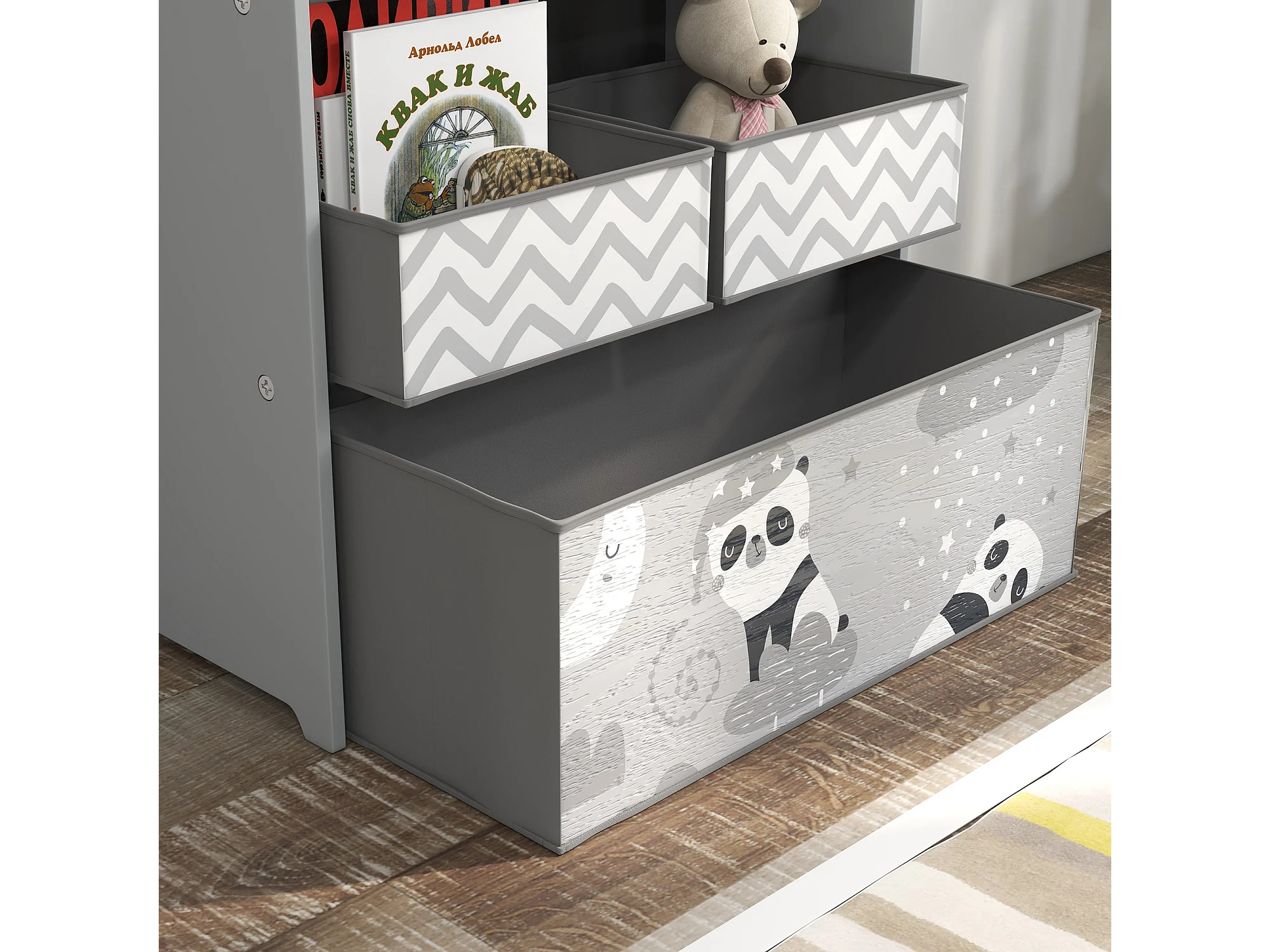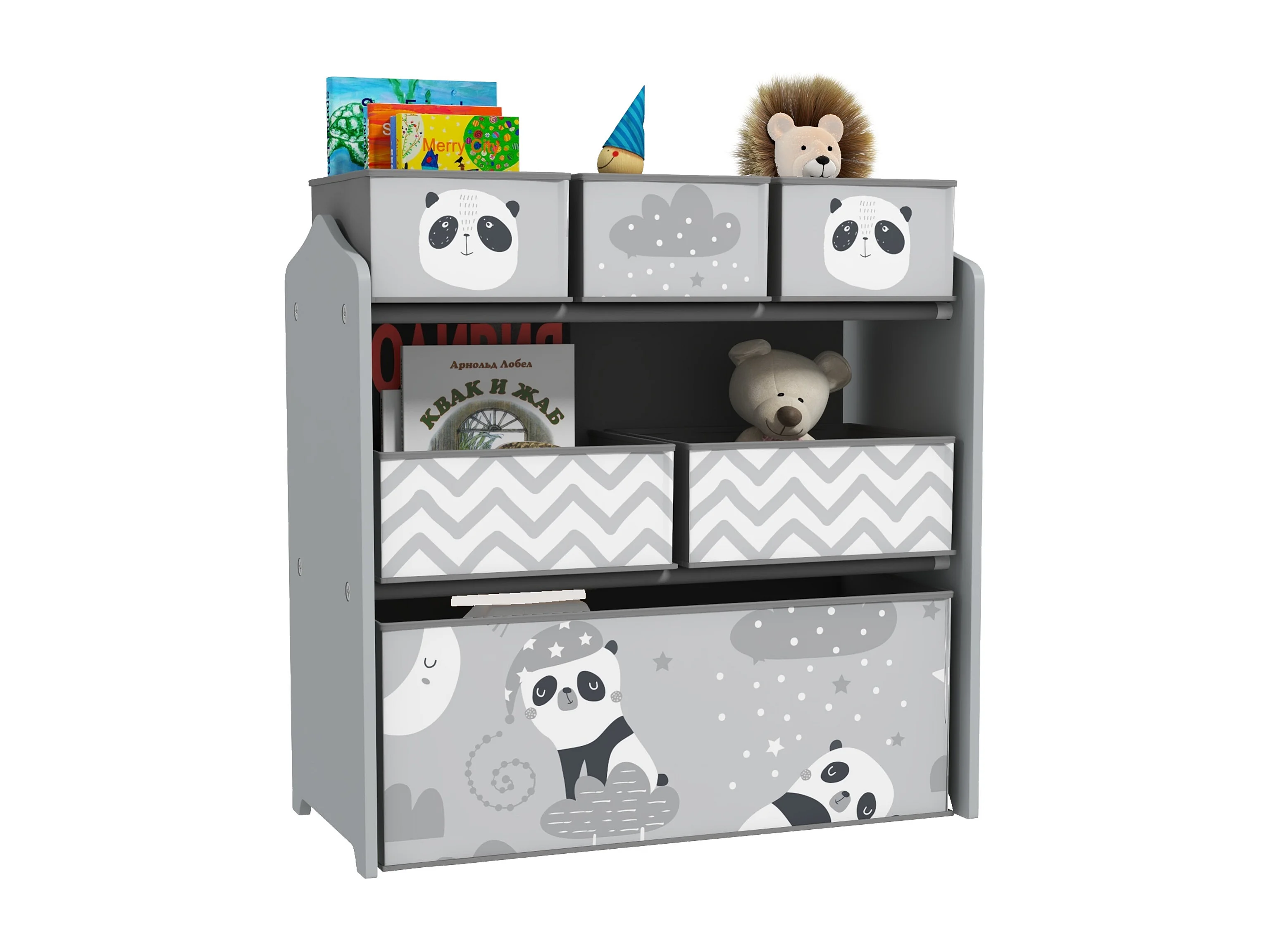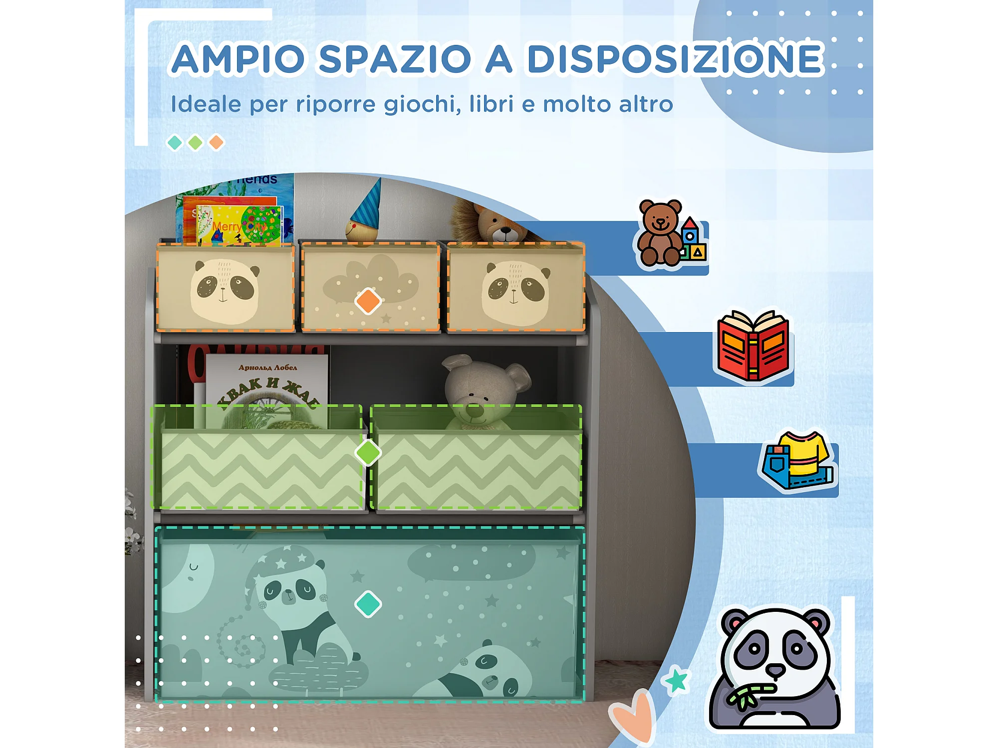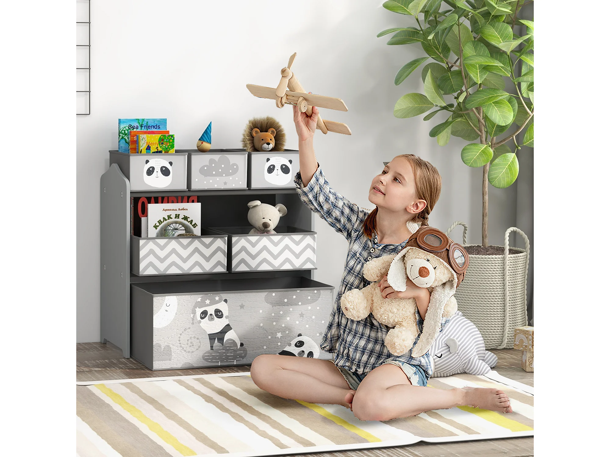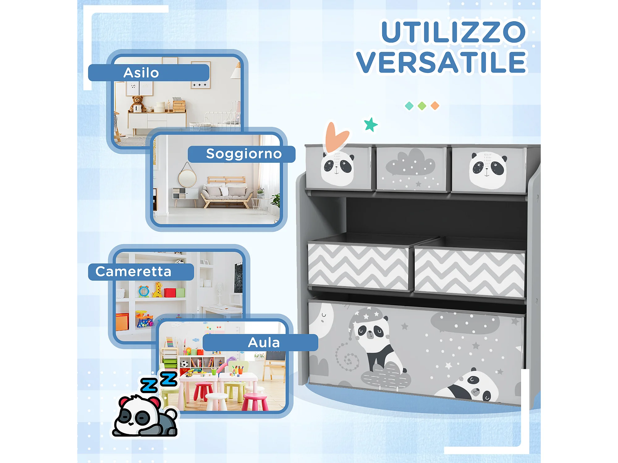 Scaffale portagiochi con 6 contenitori in tessuto grigio