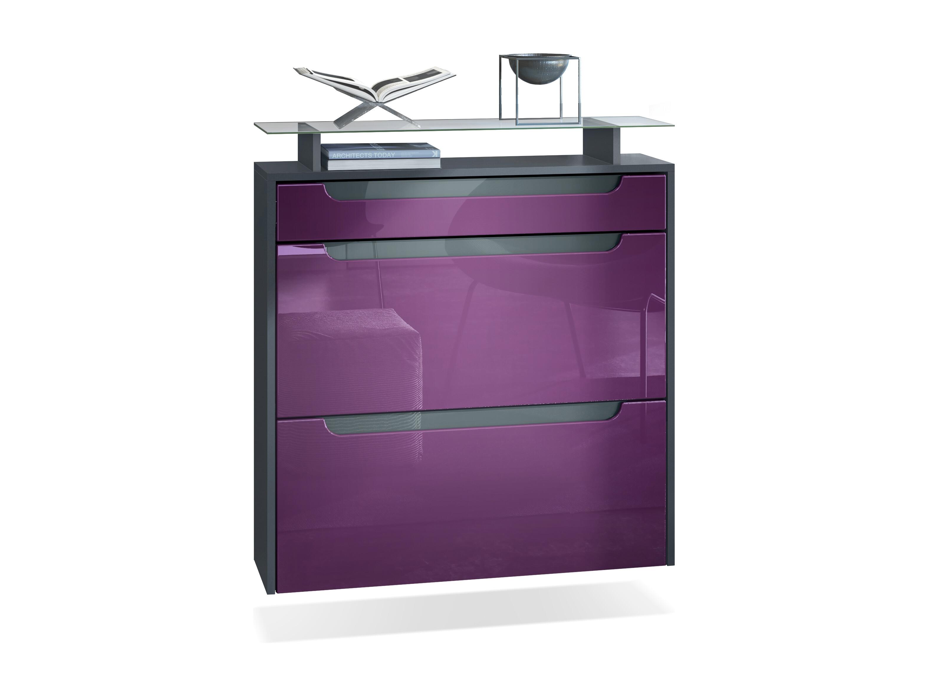 Scarpiera Malea di , mobile a parete per 16 paia di scarpe con 2 ante a ribalta, 1 cassetto e ripiano in vetro, nero opaco/violetto-porpora (89 x 96 x 23 cm)