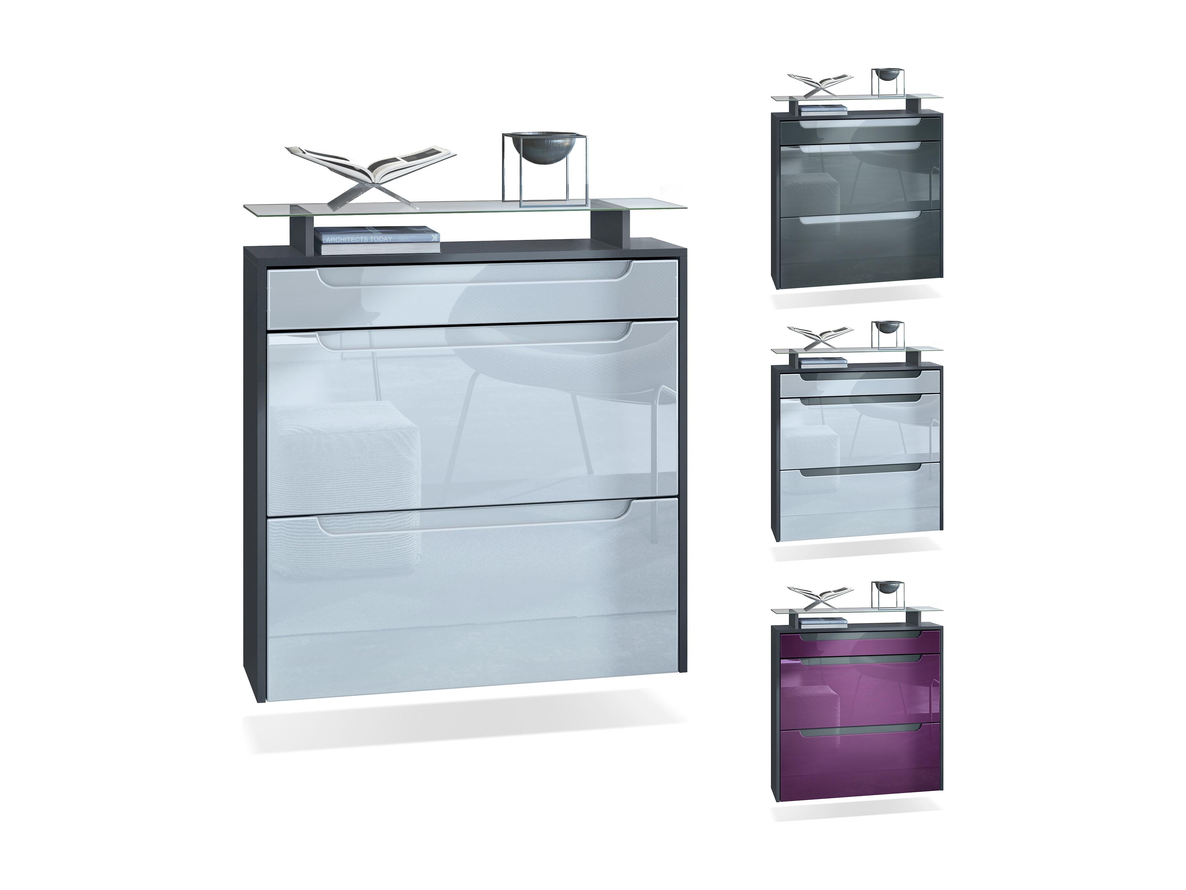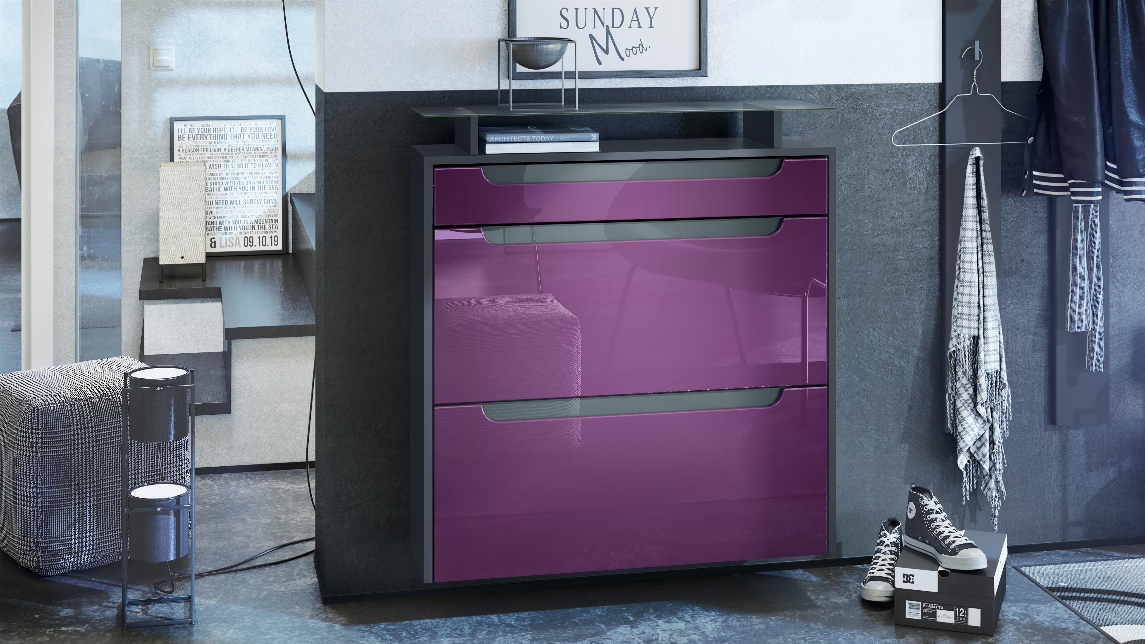 Scarpiera Annie, mobile per 16 paia di scarpe con 2 ante a ribalta e 1 cassetto e ripiano in vetro, nero opaco/violetto-porpora/bianco lucido (89 x 96 x 23 cm)
