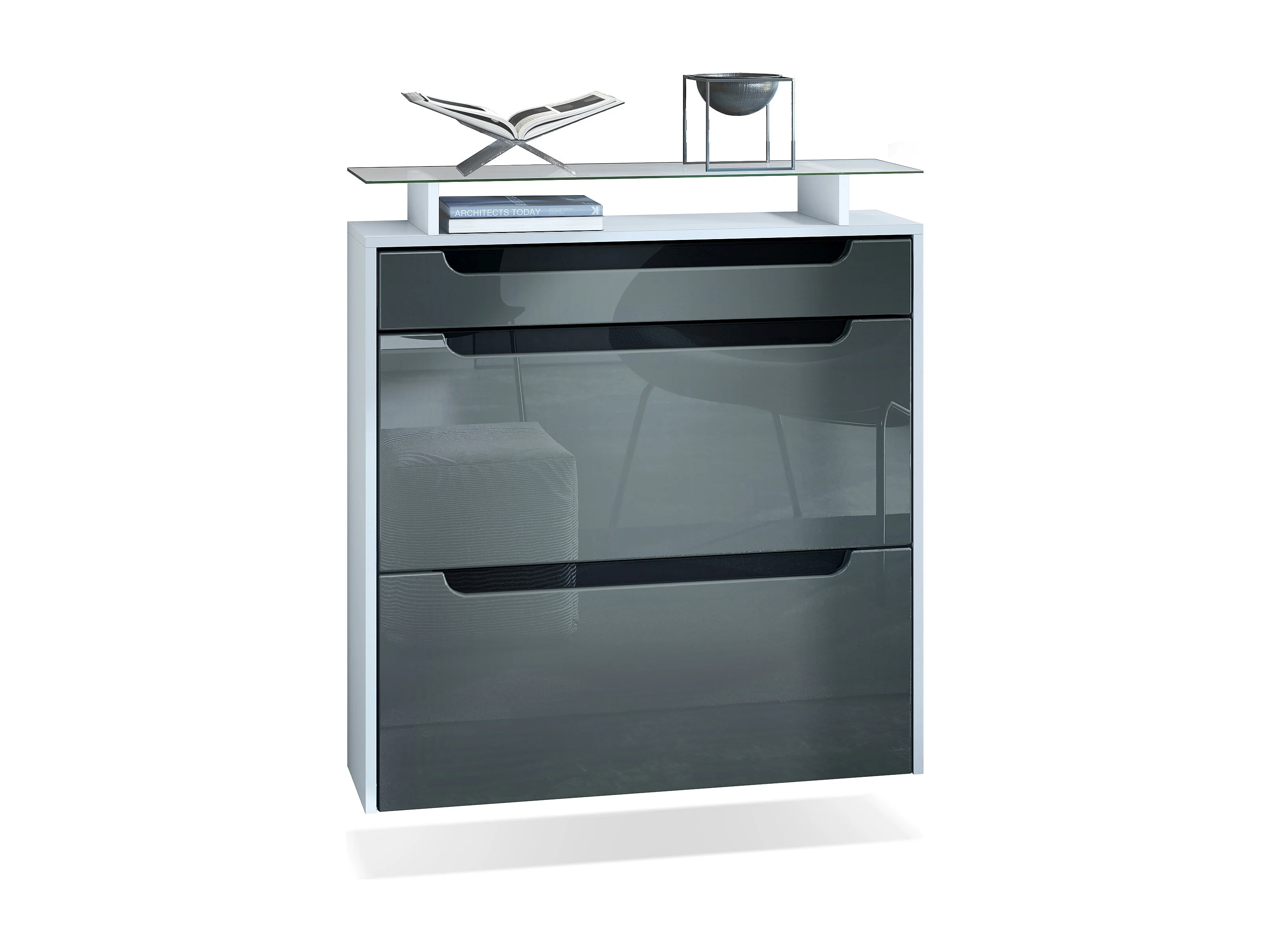 Scarpiera Fiesta per 16 paia di scarpe con 2 ante a ribalta e ripiano in vetro, antracite/ grigio lucido, maniglie incassate in bianco lucido (89 x 104 x 23 cm)