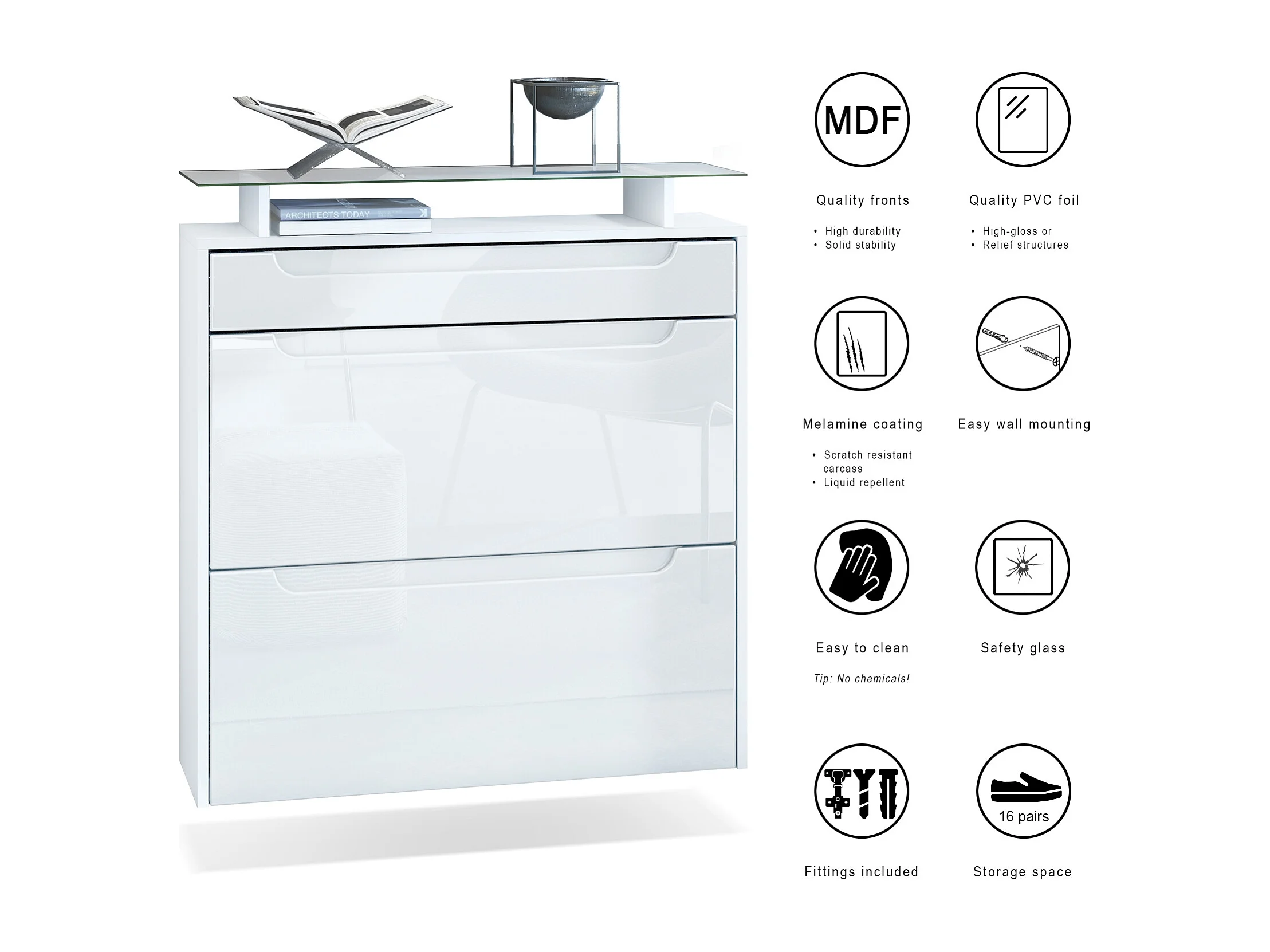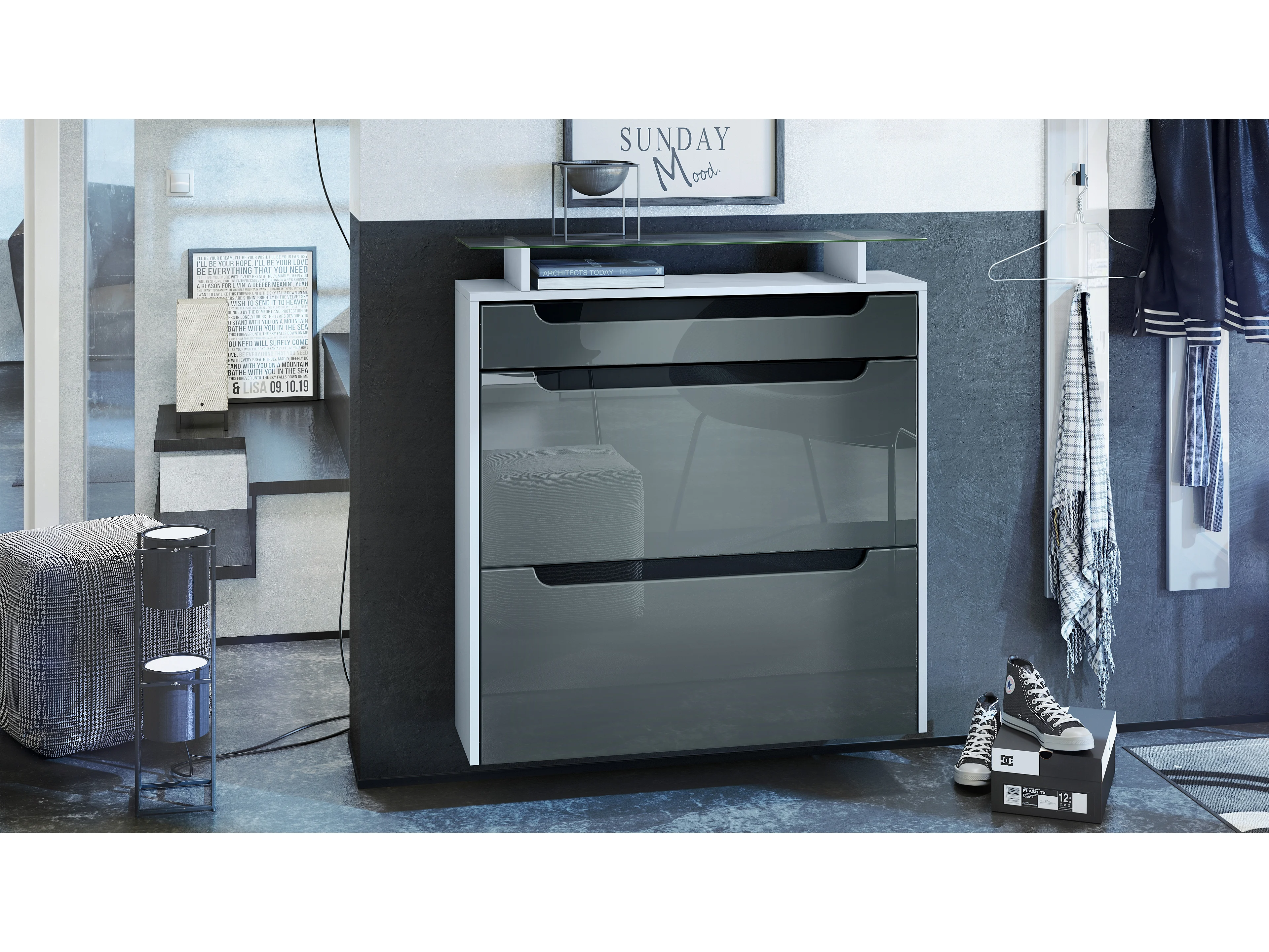 Malea, scarpiera a muro per 16 paia di scarpe con 2 ante a ribalta e 1 cassetto e ripiano in vetro, bianco opaco/grigio lucido (89 x 96 x 23 cm)