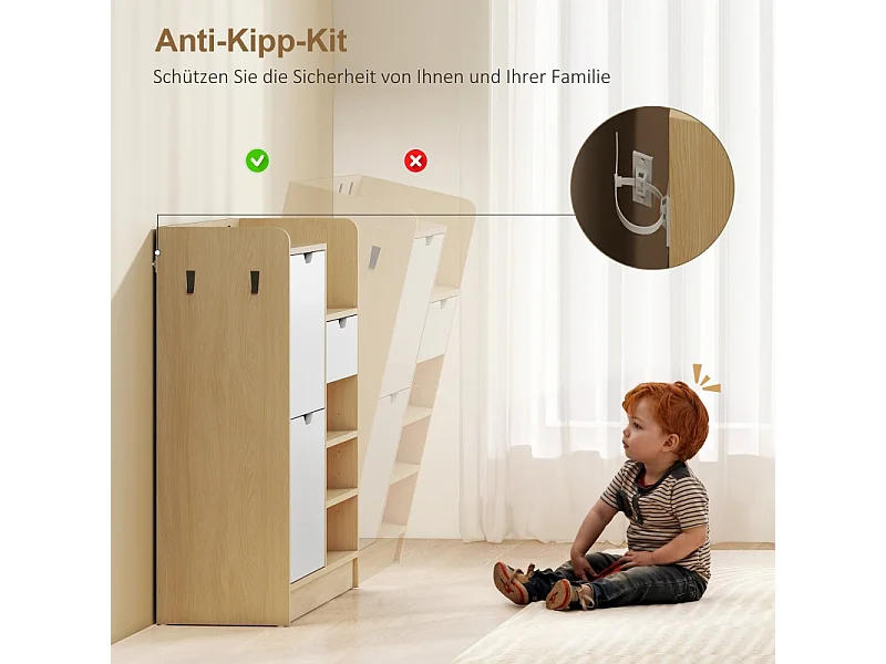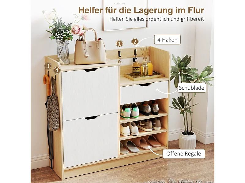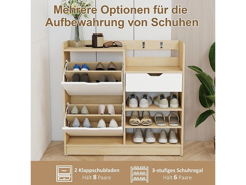 Scarpiera con ripiani e cassetti, in legno MDF e finitura naturale, (93x30x90 cm)