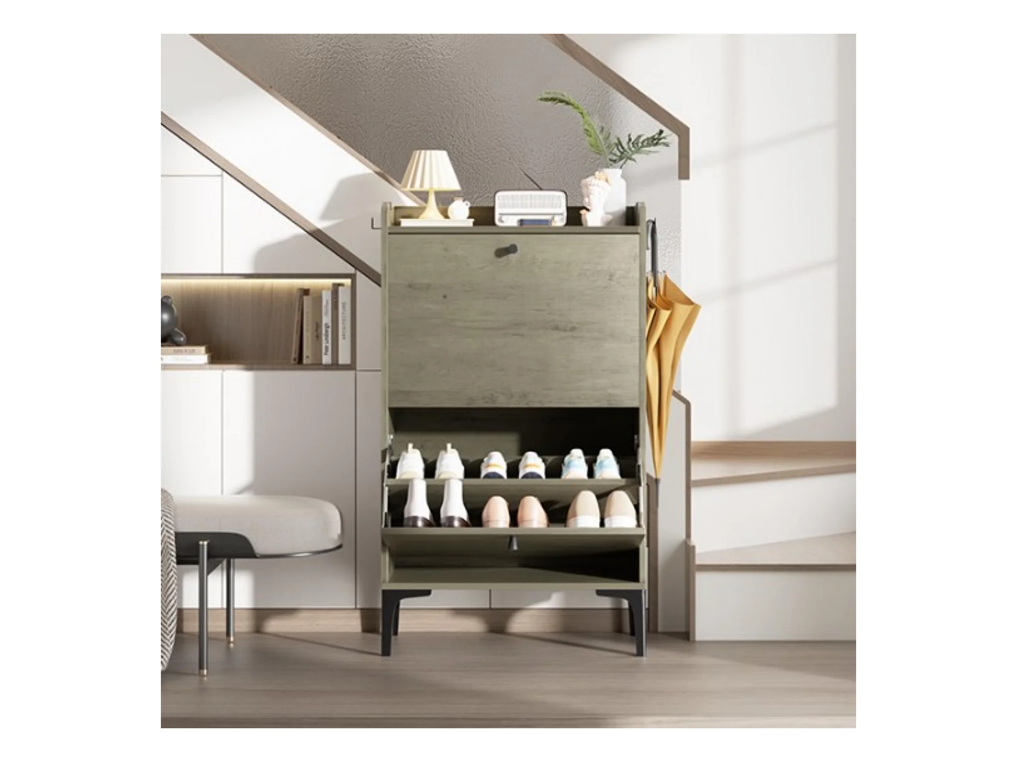 Scarpiera Loret 89 x 104 x 23 cm per 16 paia di scarpe, con ripiano in vetro, struttura in antracite opaco, frontale in grigio lucido.