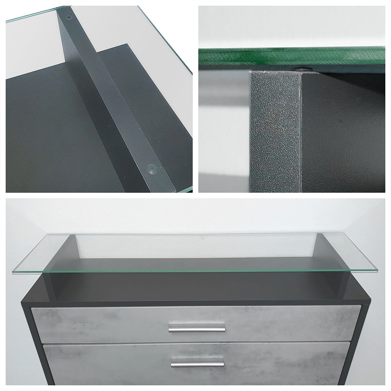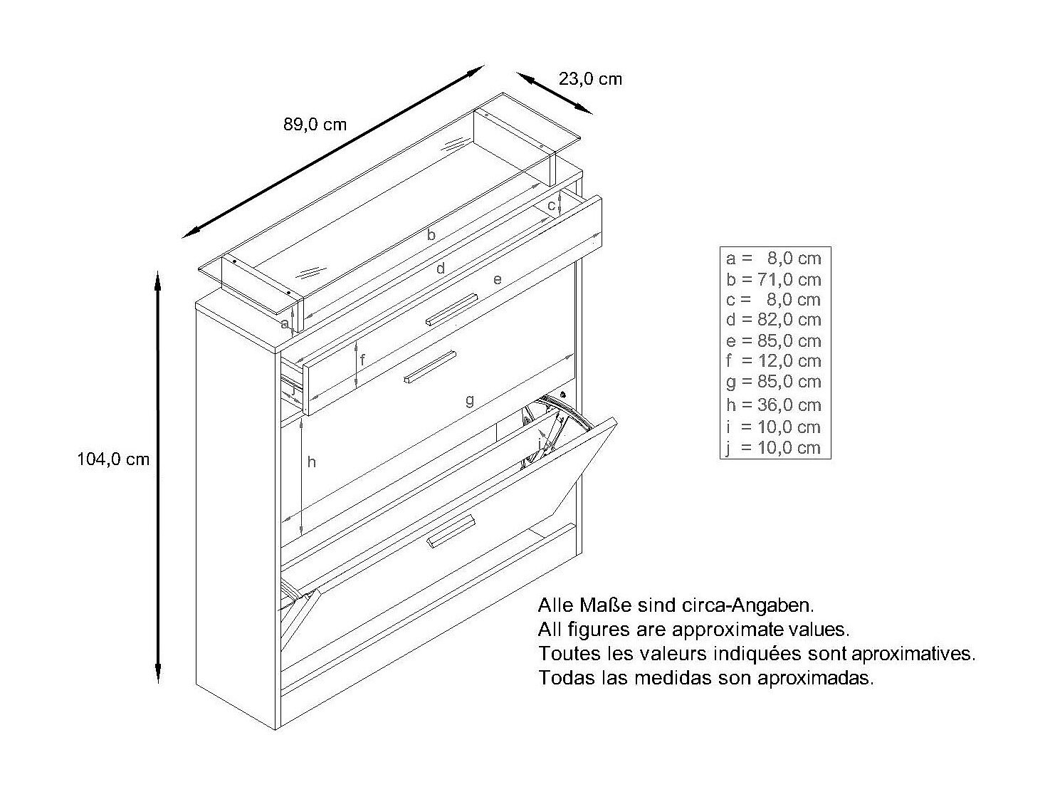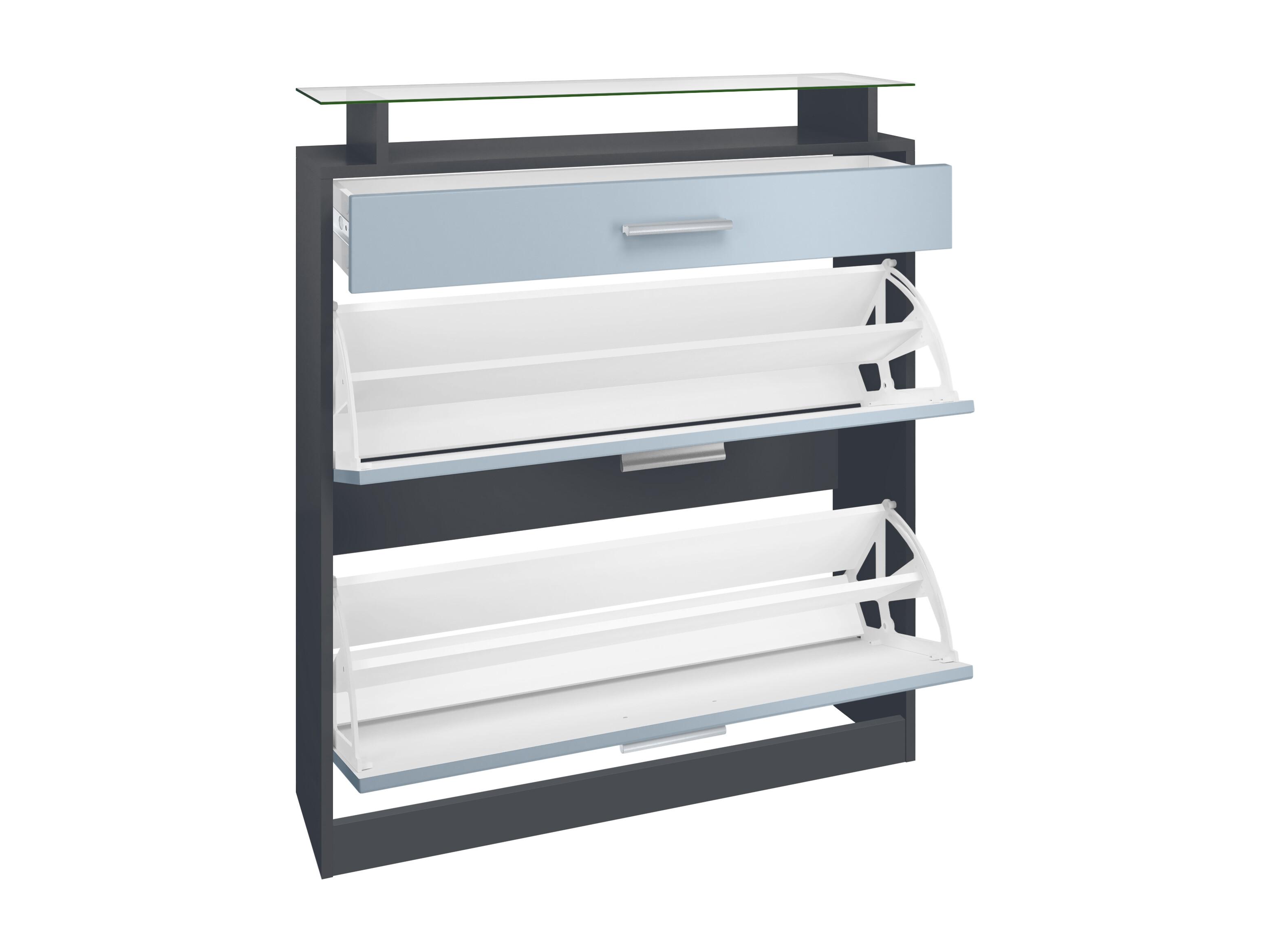 Scarpiera Lavia, Scarpiera a ribalta per 24 paia di scarpe con 3 ante a ribalta e ripiano in vetro, antracite opaco /bianco opaco (89 x 128 x 23 cm)