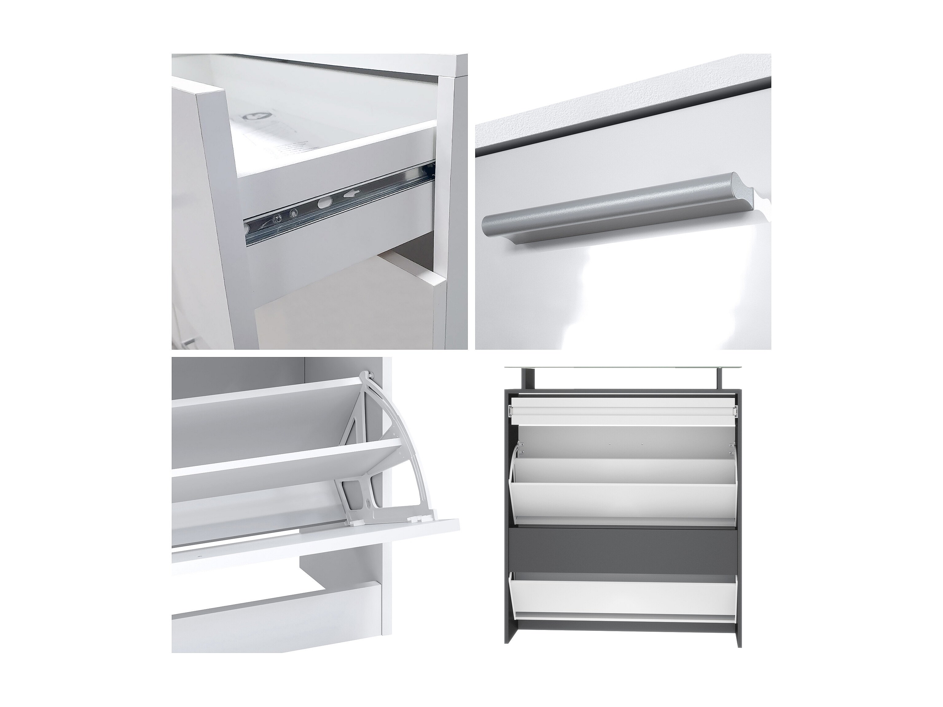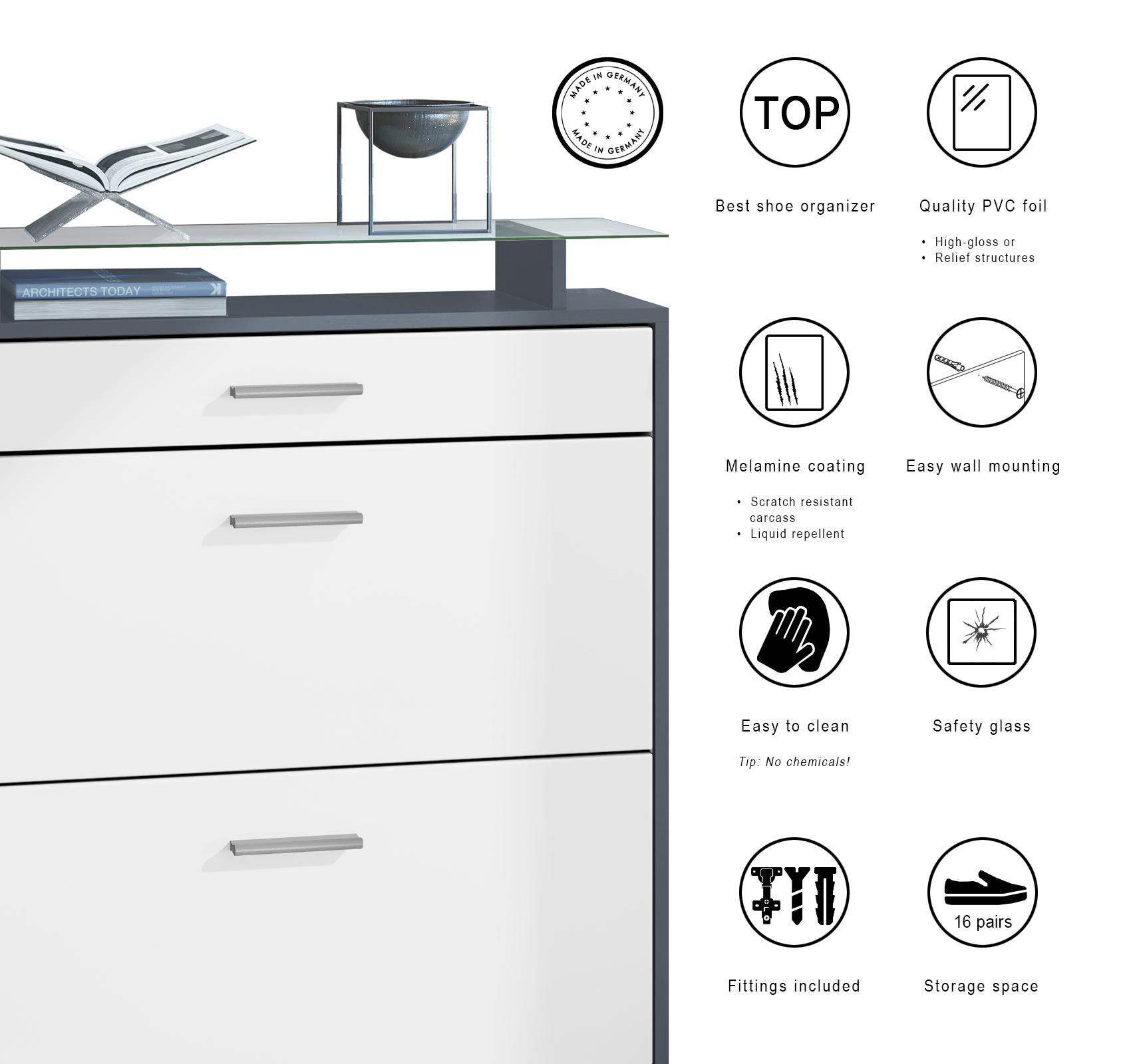 Scarpiera Fiesta per 16 paia di scarpe con 2 ante a ribalta e ripiano in vetro, antracite/bianco lucido, maniglie incassate in grigio lucido (89 x 104 x 23 cm)