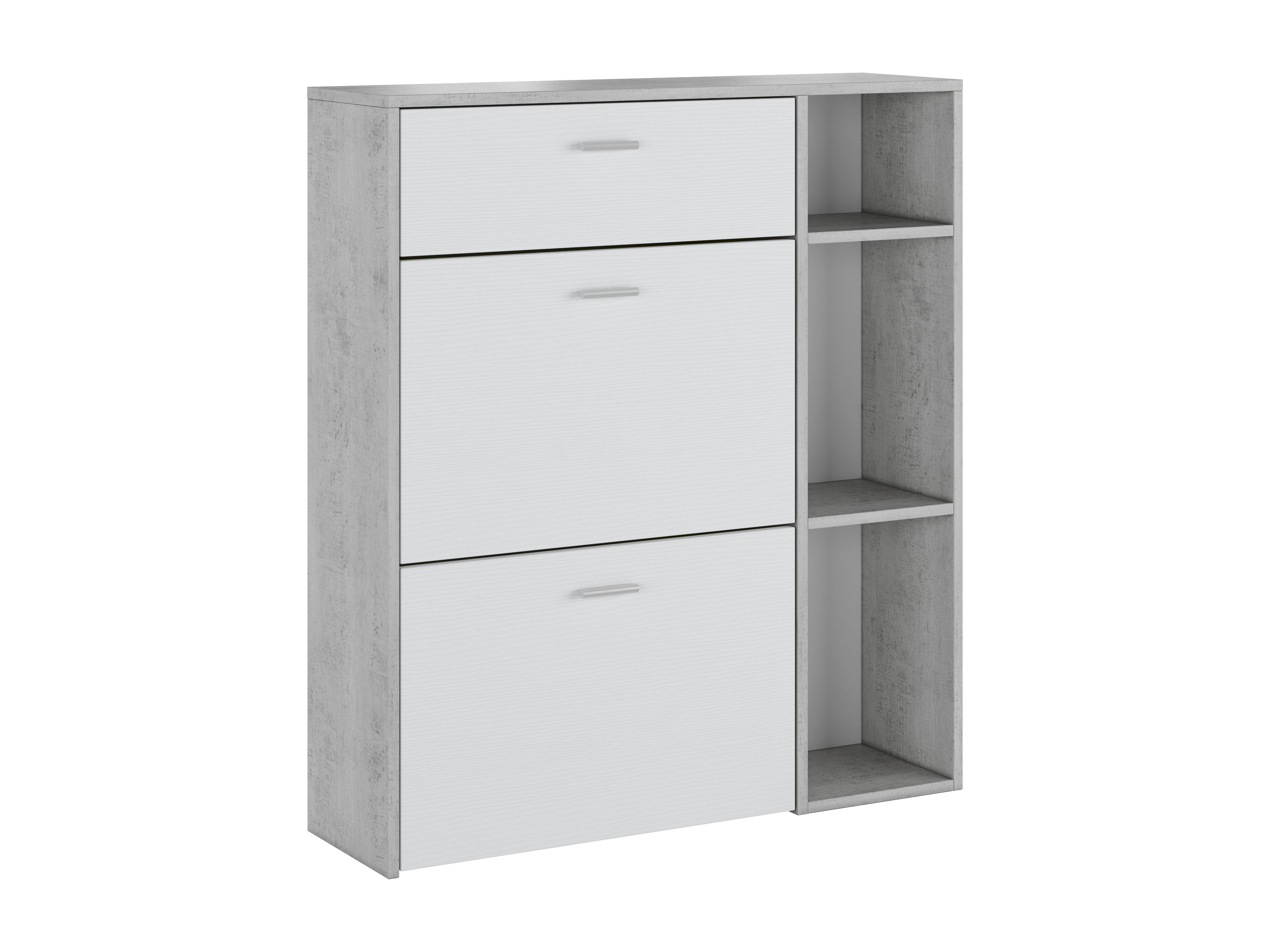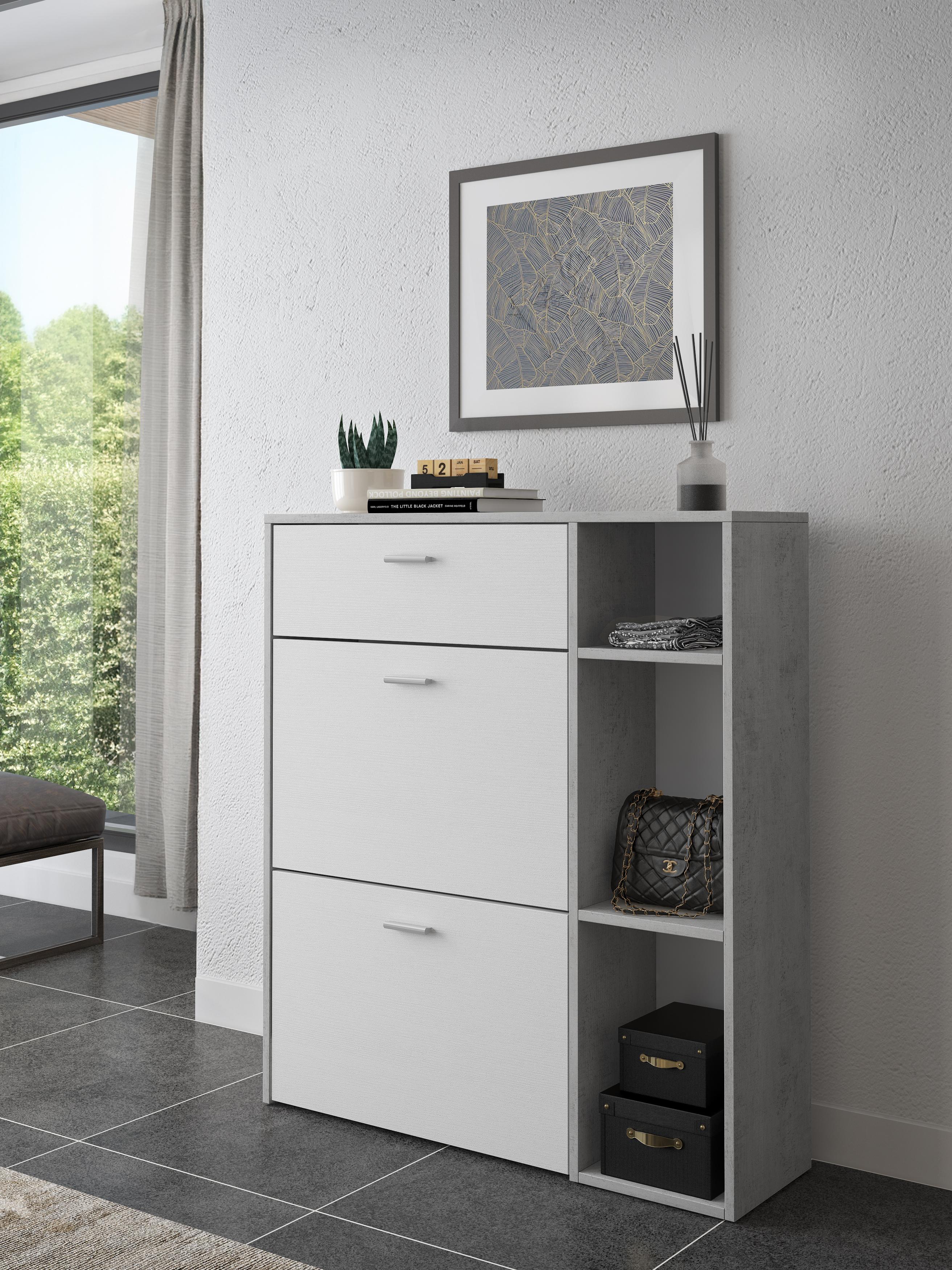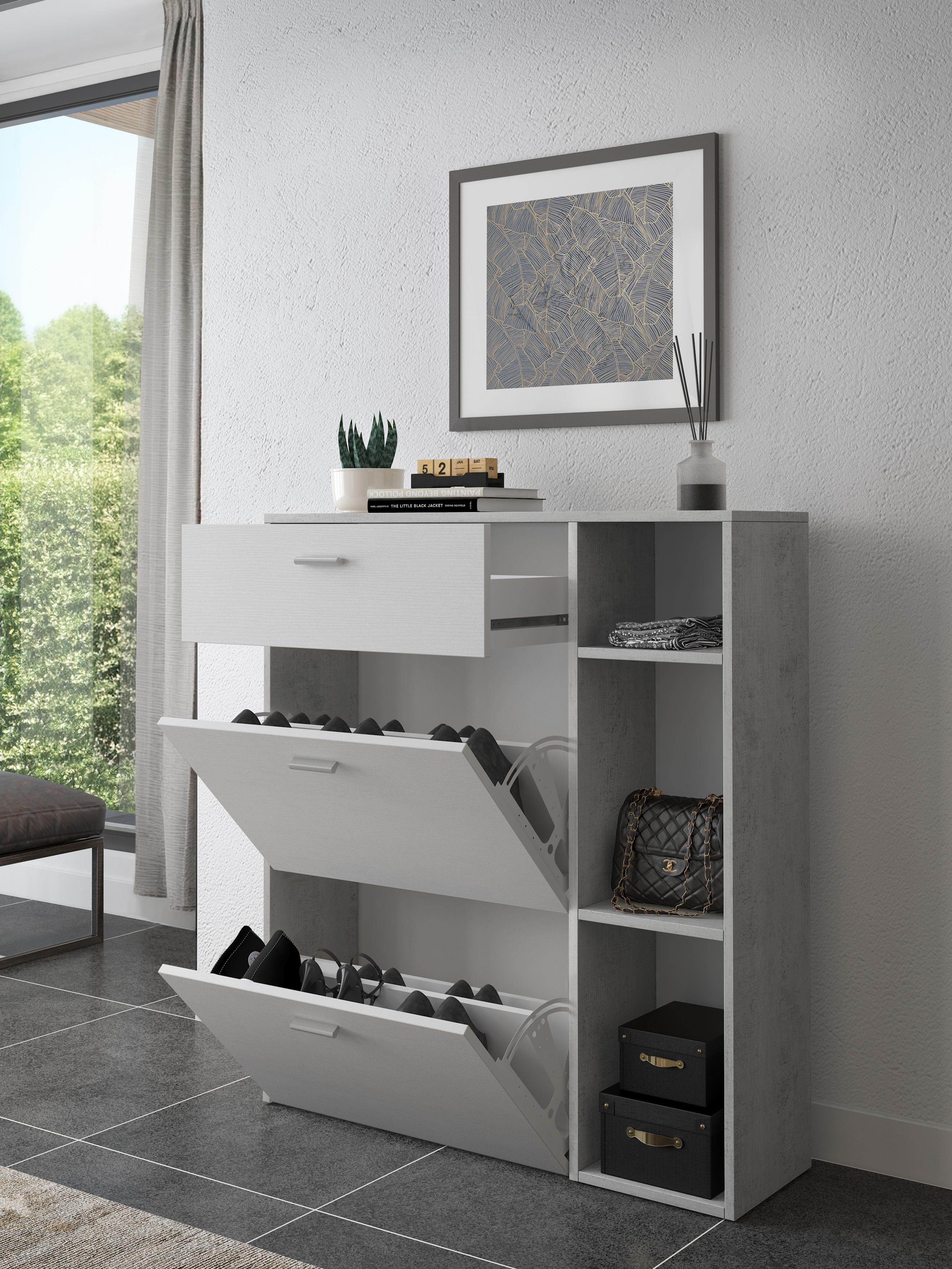 Scarpiera Mobile Portascarpe Salvaspazio Ingresso Con 2 Ribalte Doppia Profondità 1 Cassetto 3 Vani A Giorno 90x101.5x26 Cm Bianco Grigio Cemento