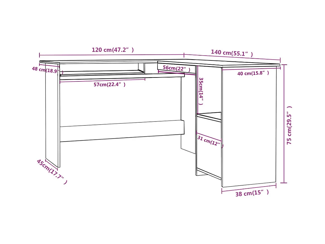 Scrivania Angolare a L Bianca 120x140x75cm in Legno Multistrato