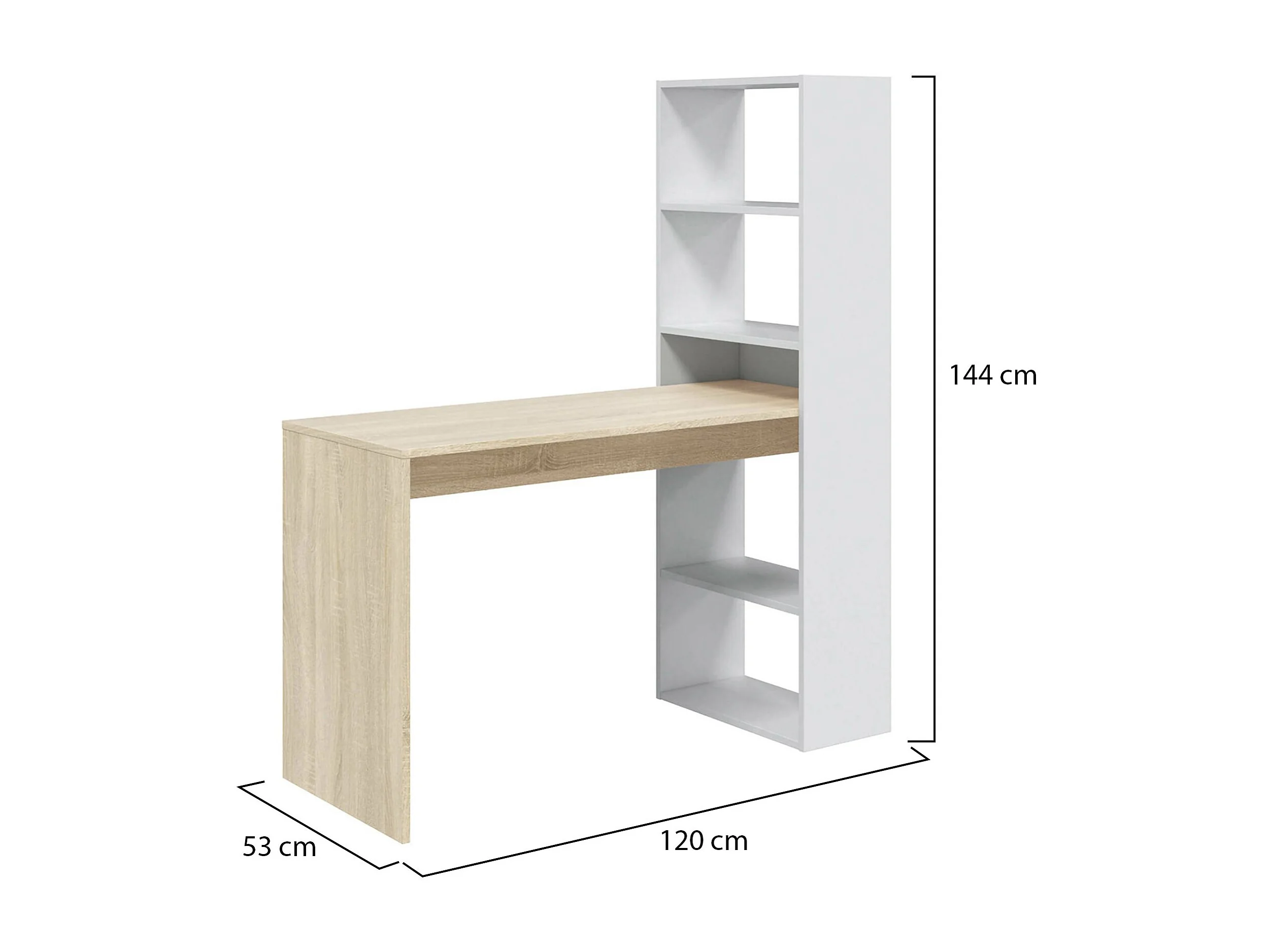 Scrivania Denton, Scrittoio multifunzione reversibile con libreria 5 ripiani, Tavolo da studio o ufficio porta PC portalibri, 120x53h144 cm, Bianco e Rovere