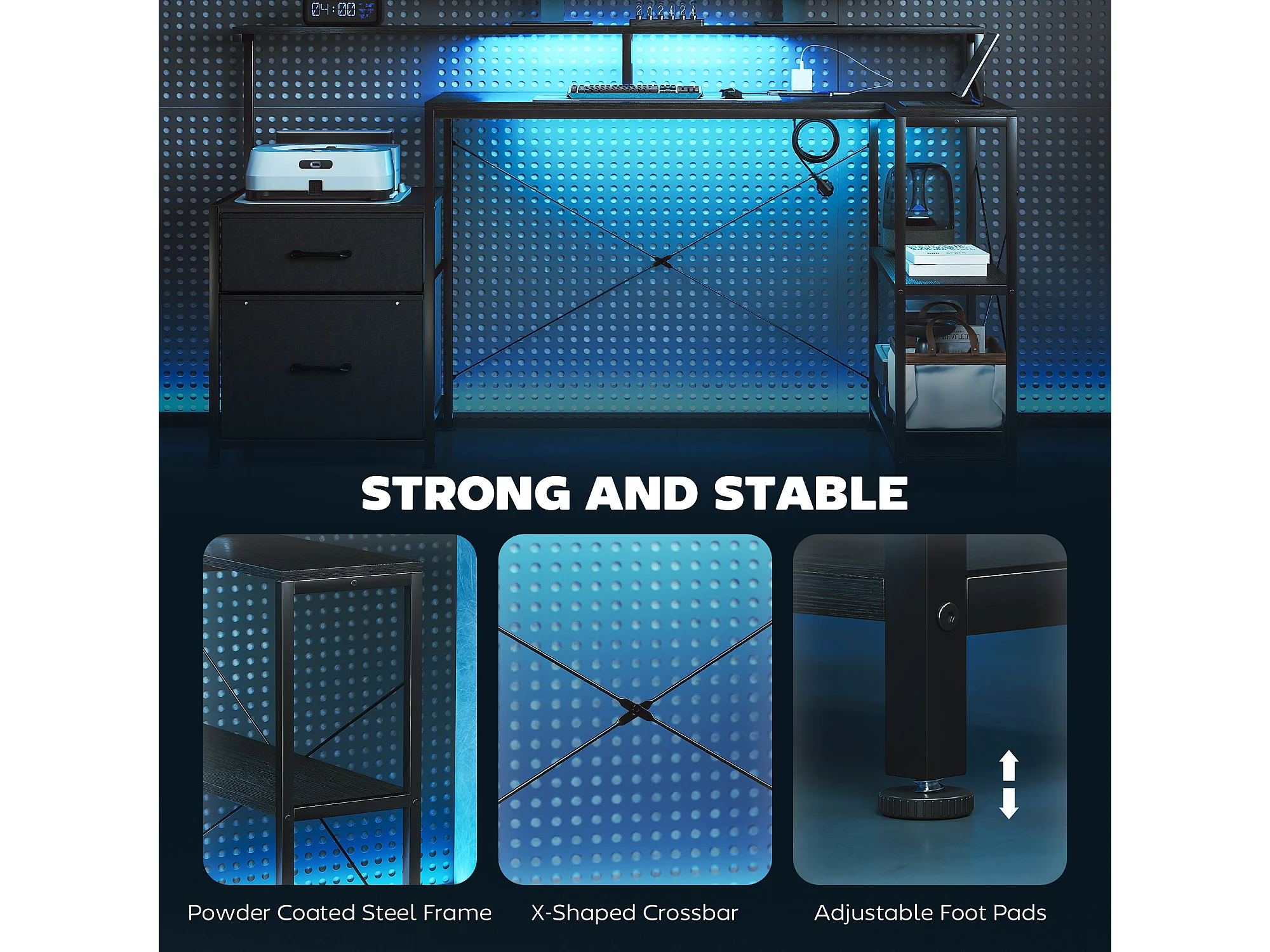 Scrivania per pc con prese elettriche luci led e rialzo monitor nero