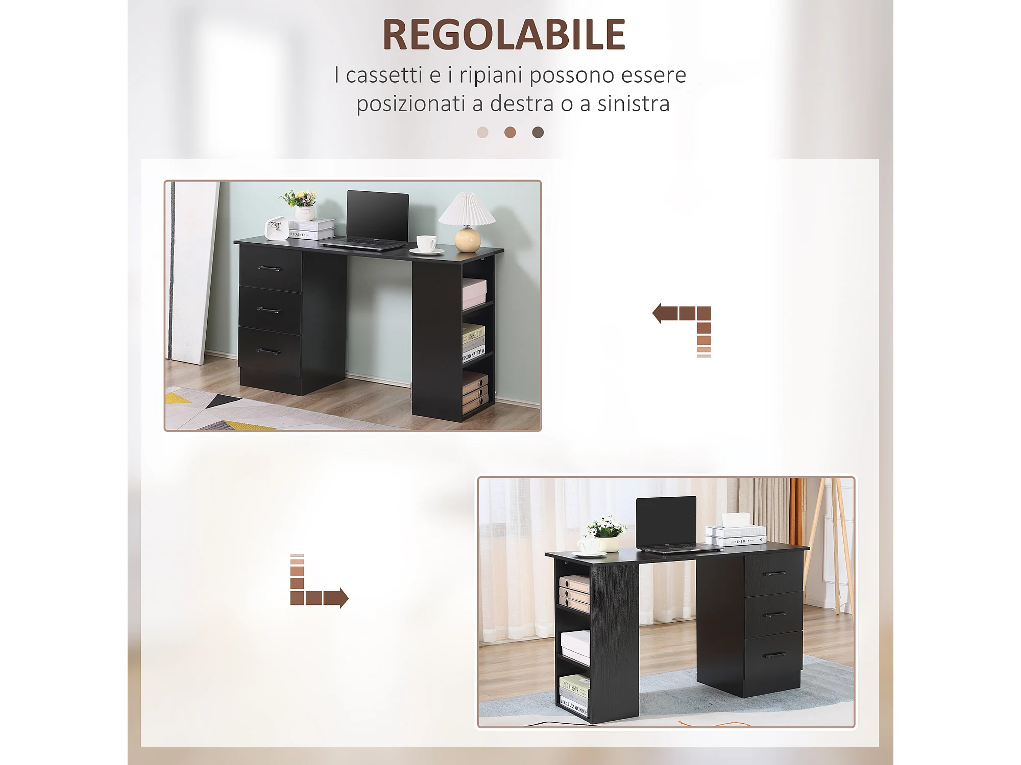 Scrivania moderna con 3 ripiani e 3 cassetti in legno nero