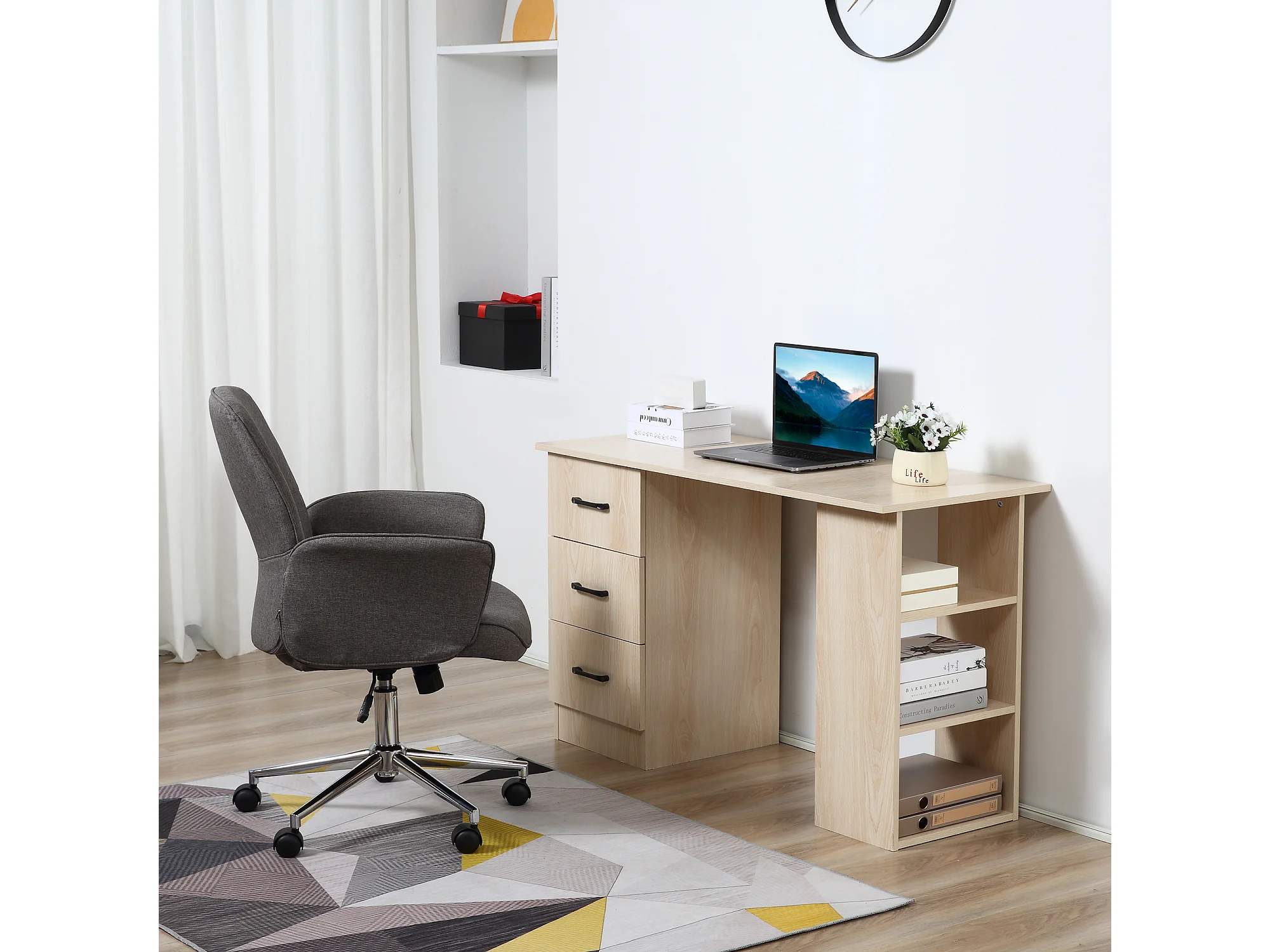 DELTA - Scrivania 120 cm con 3 cassetti, armadietto e scaffali per ufficio / camera da letto - Rovere