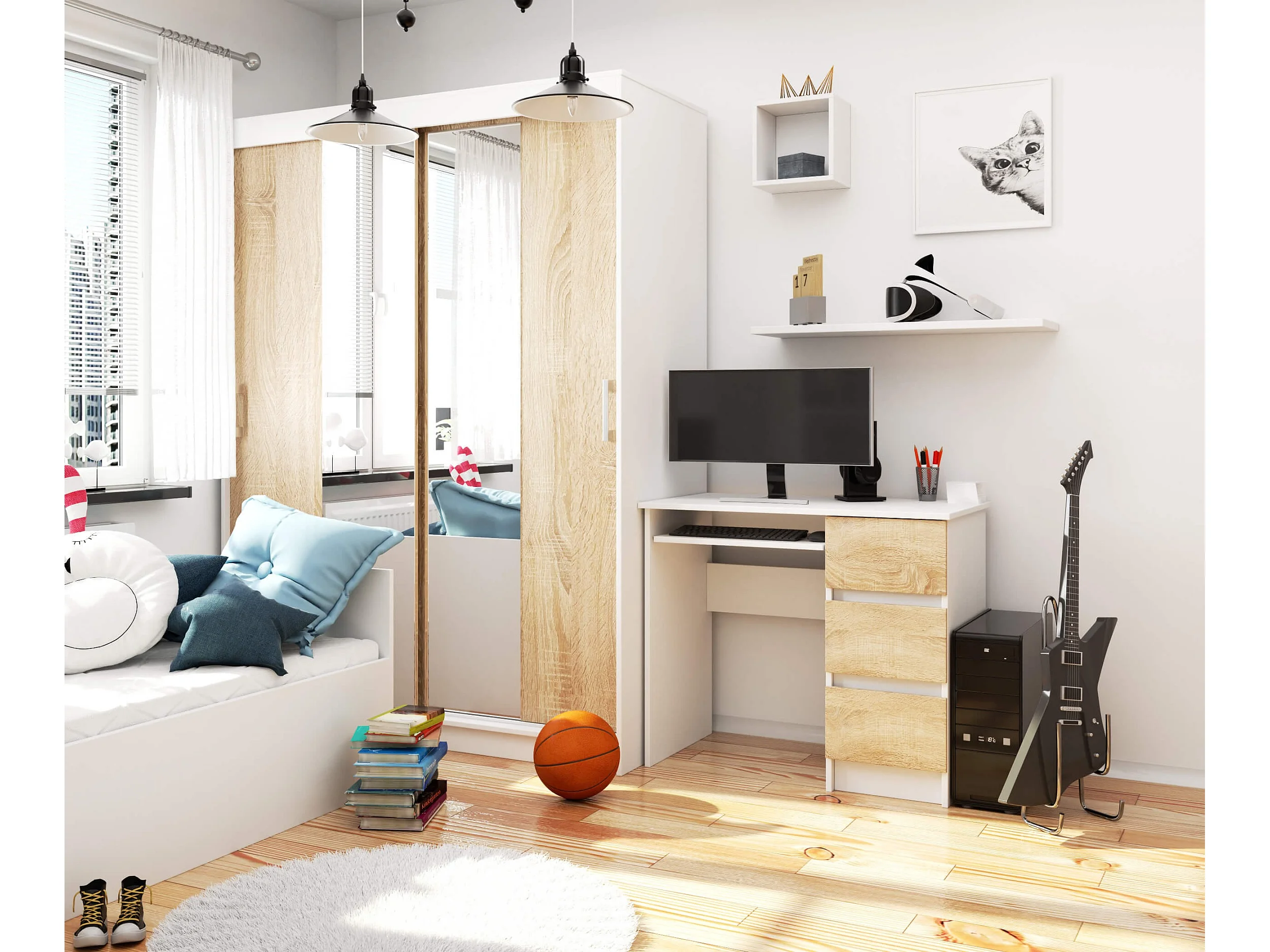 Scrivania per computer AKORD A6 Bianco 90 cm 3 cassetti inserto frontale Sonoma Quercia 90x50x77 cm Modello a destra