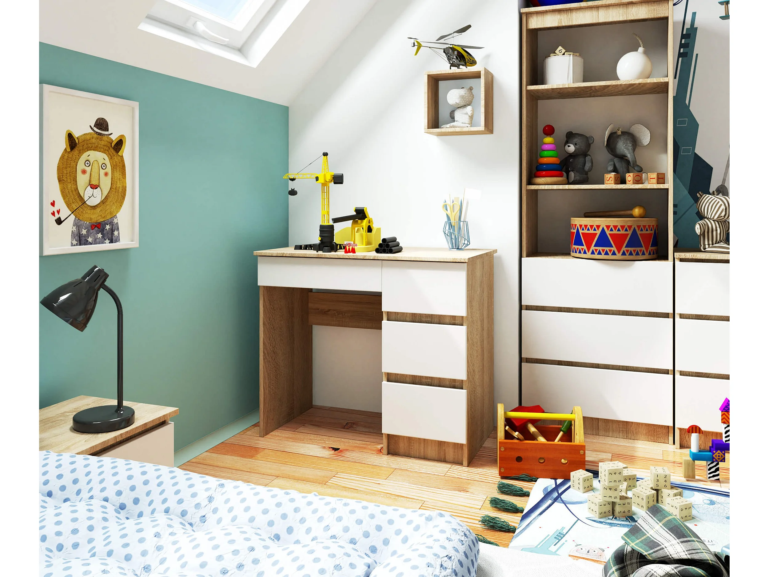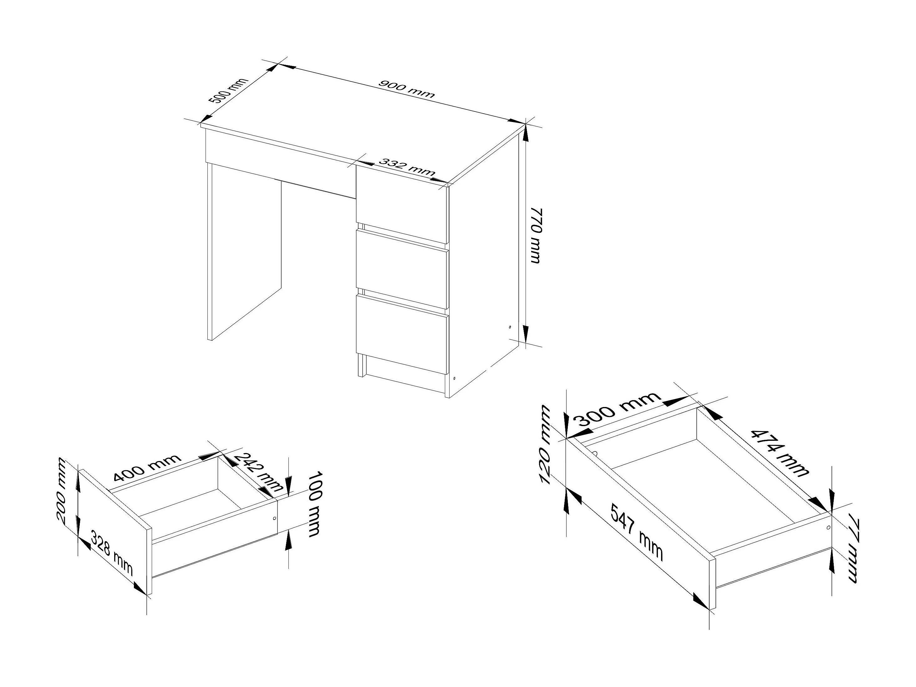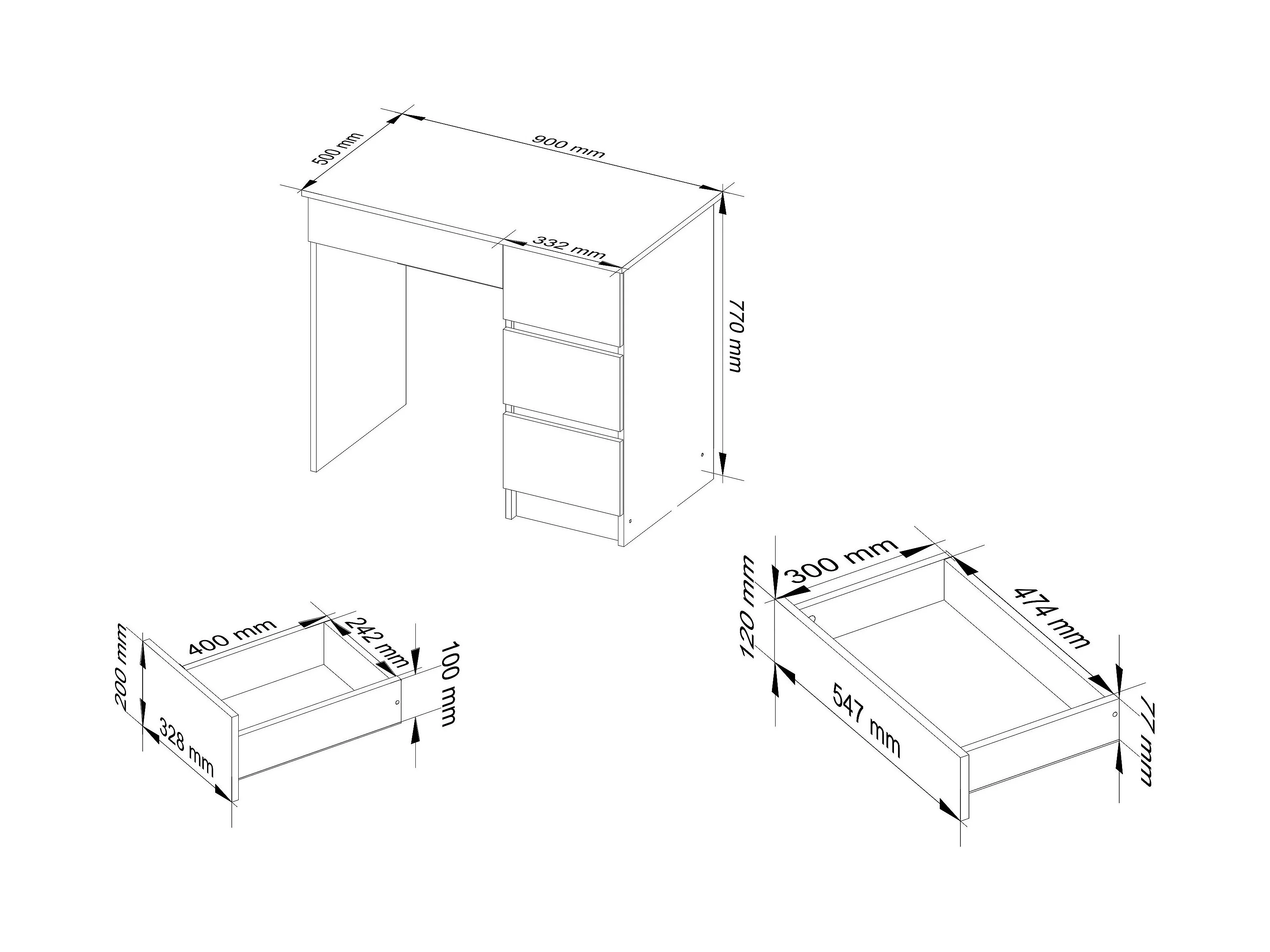 Scrivania per computer AKORD A7 Sonoma Quercia 90 cm 4 cassetti inserto frontale Bianco 90x50x77 cm Modello a destra