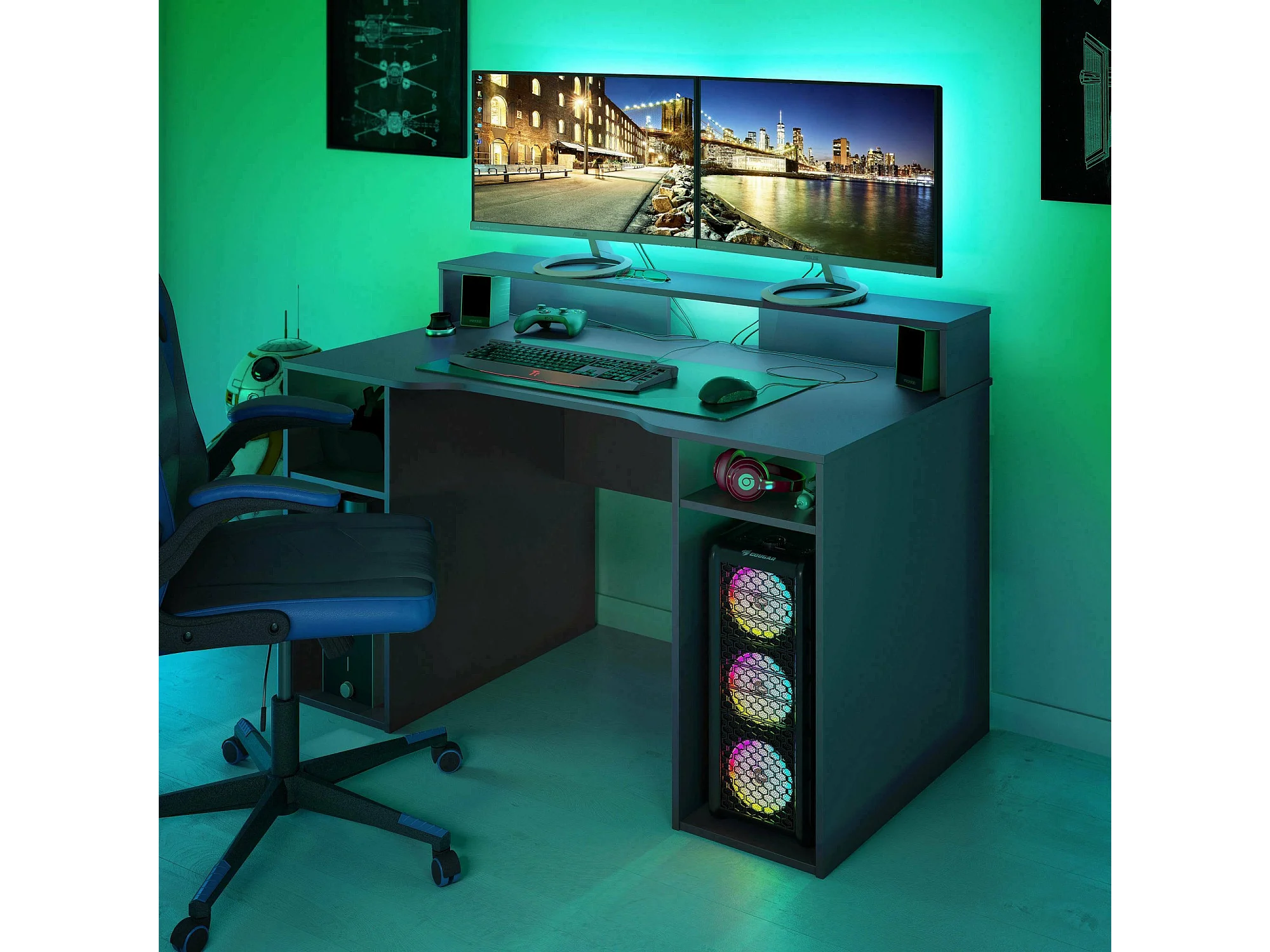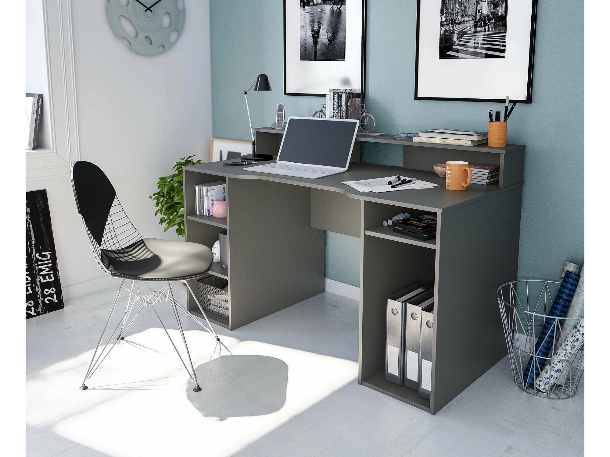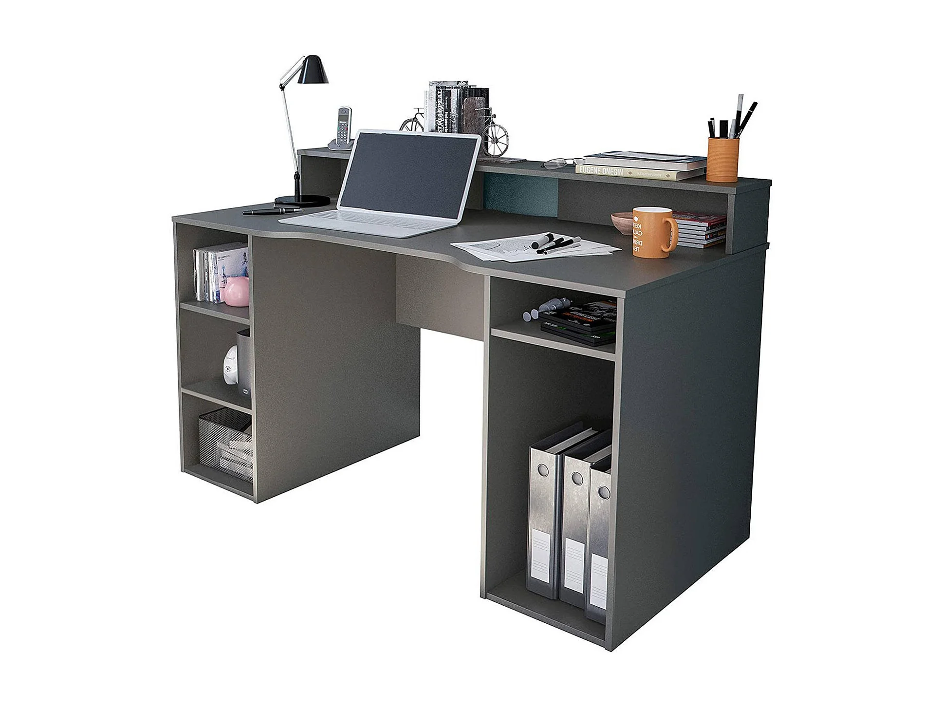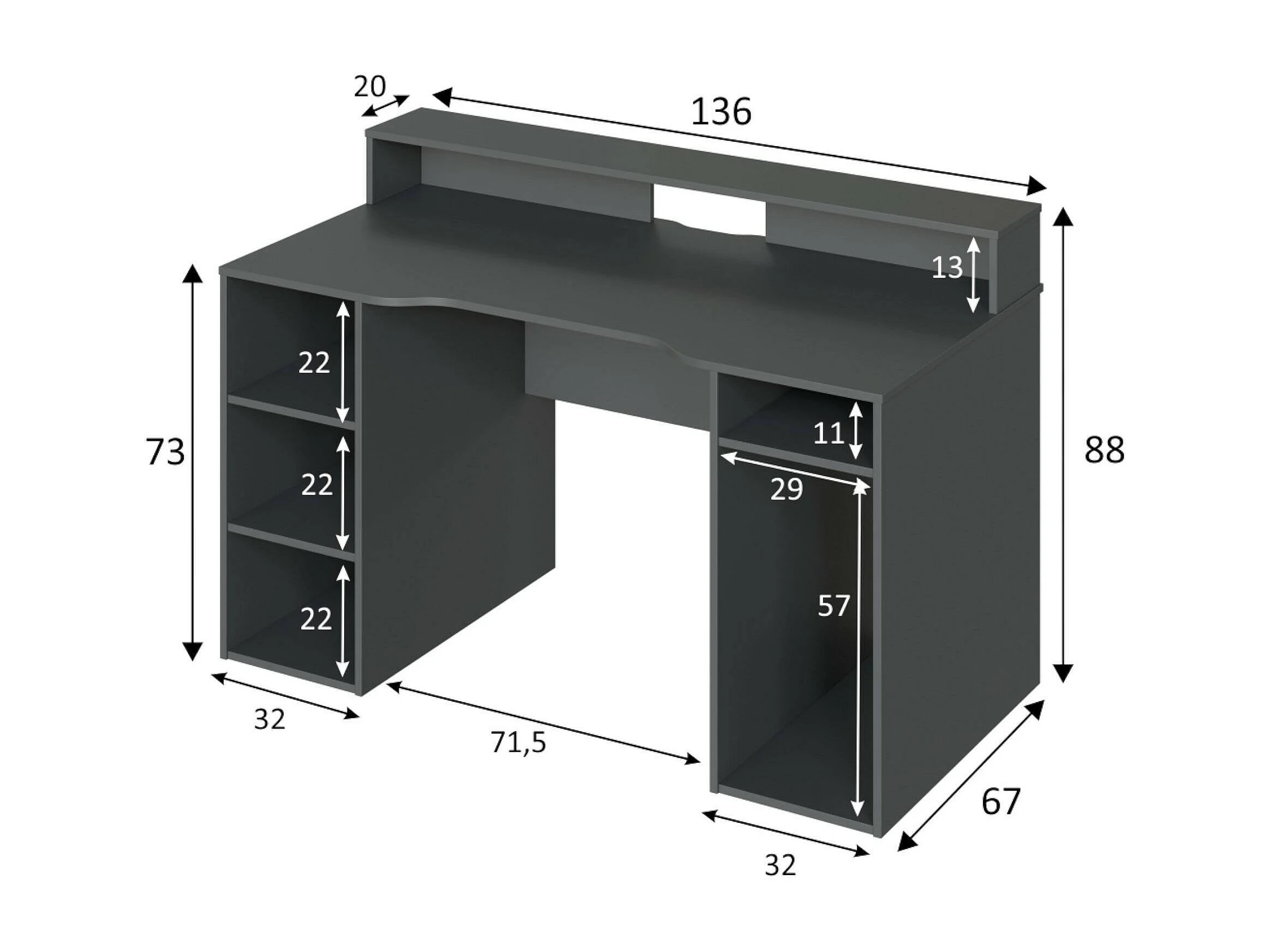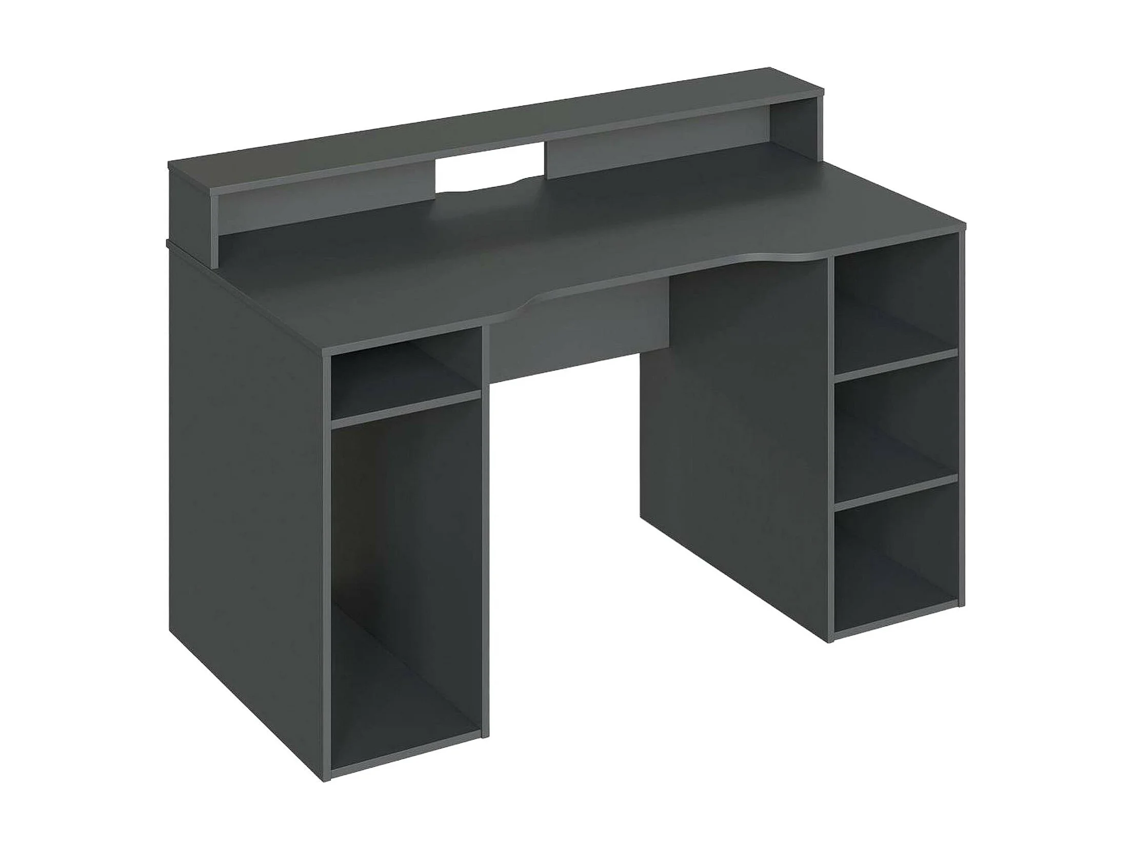 Scrivania Phoenix, Scrittoio multifunzione moderno da Gaming, Tavolo da studio porta PC e porta CD, Tavolo da studio con ripiani, 136x67h88 cm, Antracite