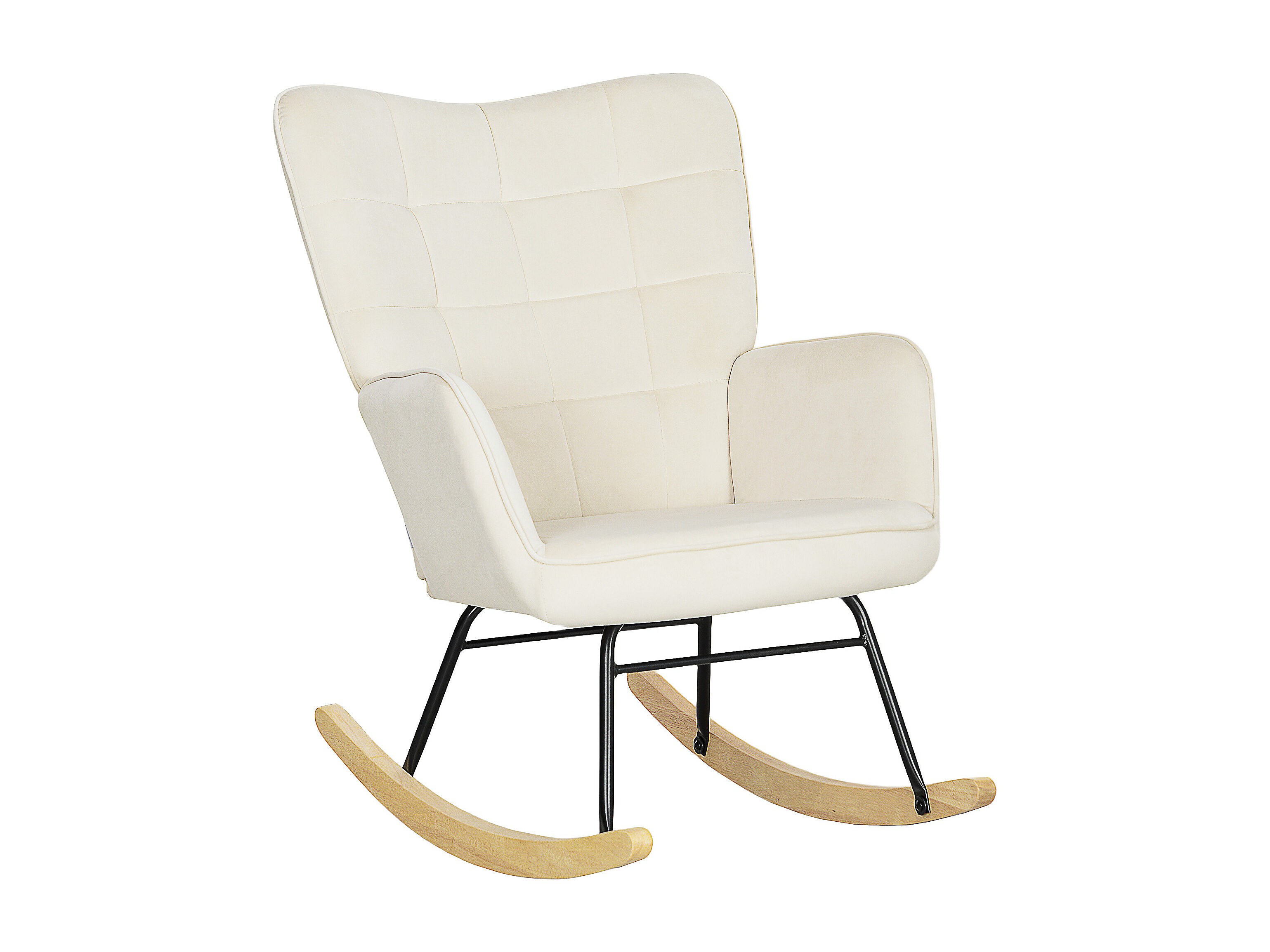 Sedia a dondolo in velluto beige con braccioli, base in legno, struttura nera