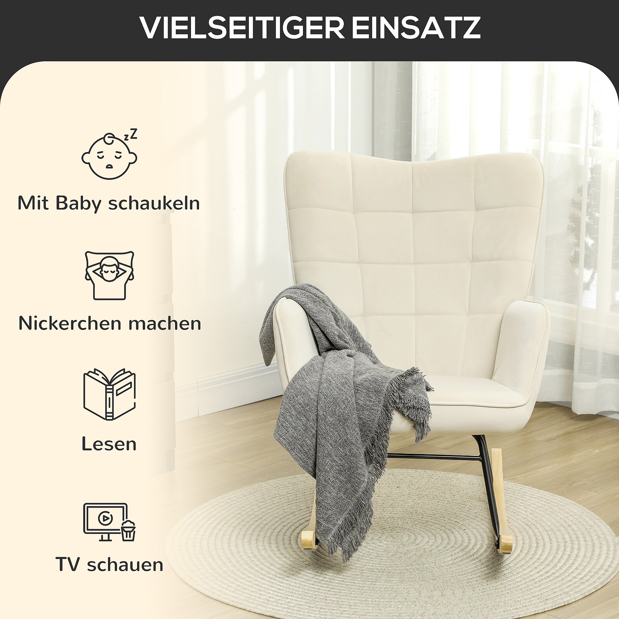 Sedia a dondolo in velluto beige Teddy con tasche laterali e poggiapiedi nascosti, struttura in legno