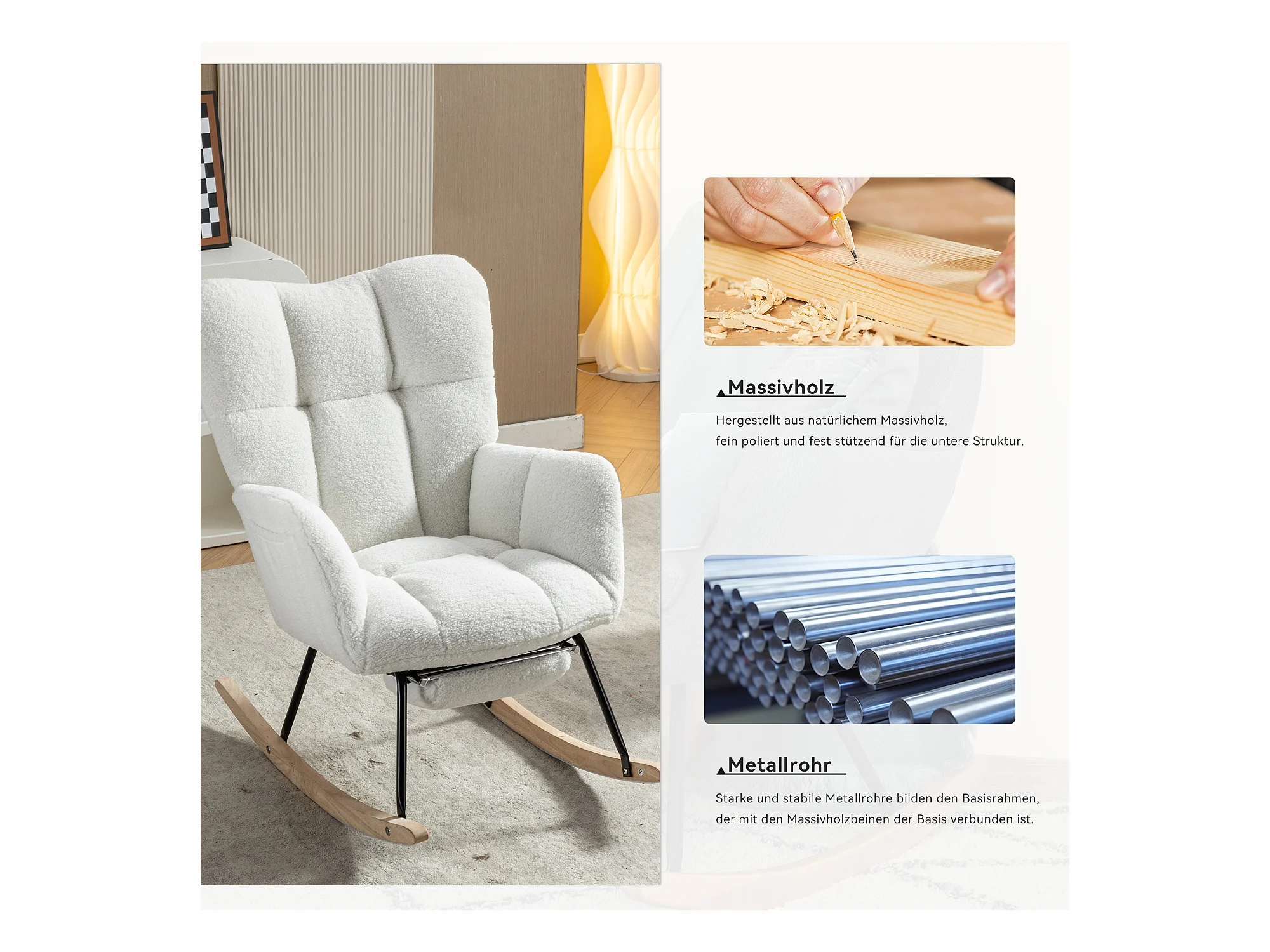 Bequemer und stabiler Sherpa-Schaukelstuhl mit cremefarbenem Holzrahmen (63 x 95 x 97 cm)
