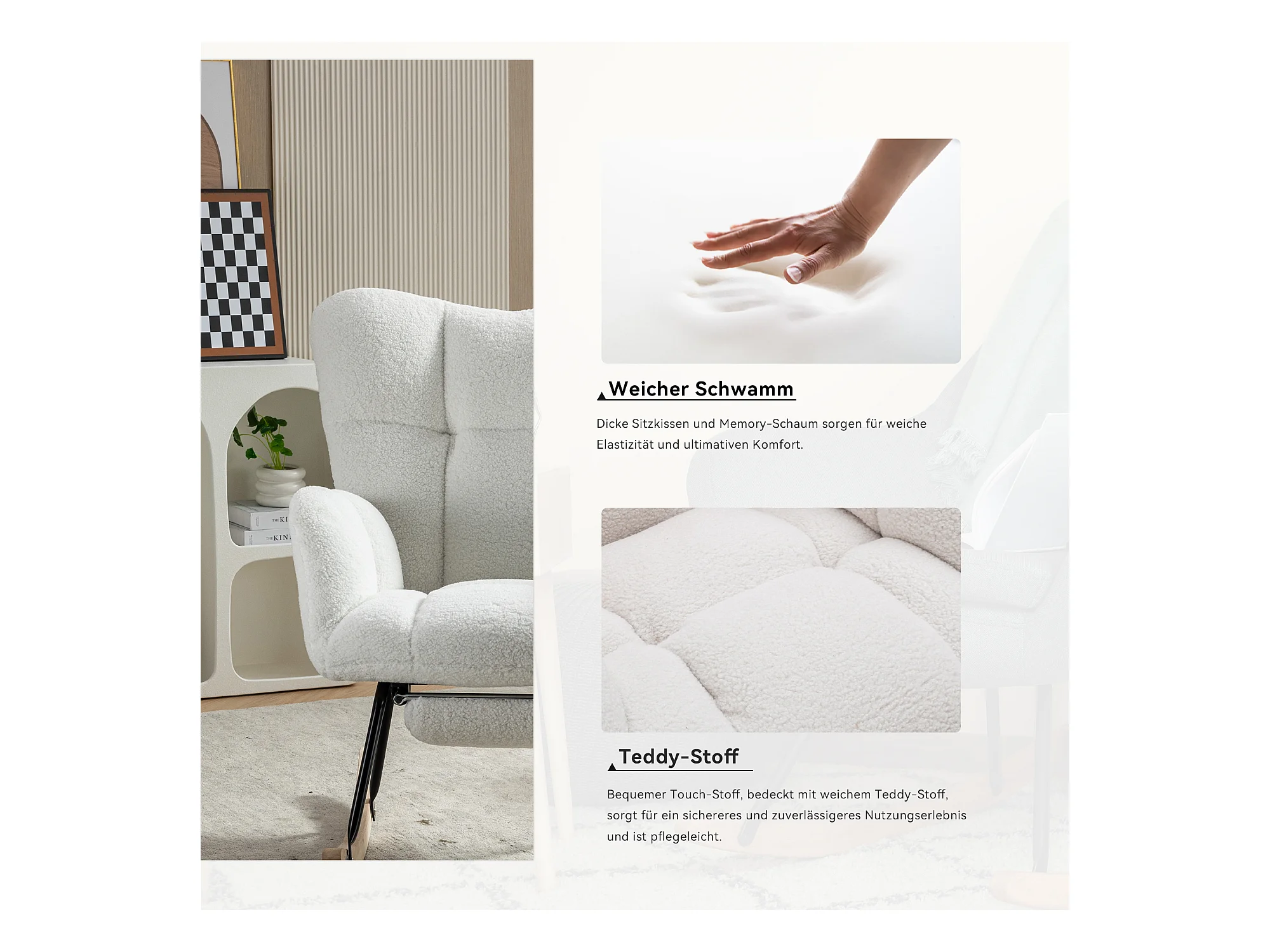 Sedia a dondolo moderna con tessuto felpato, poggiapiedi retrattile, imbottita, bianca (80x98x98,5 cm)